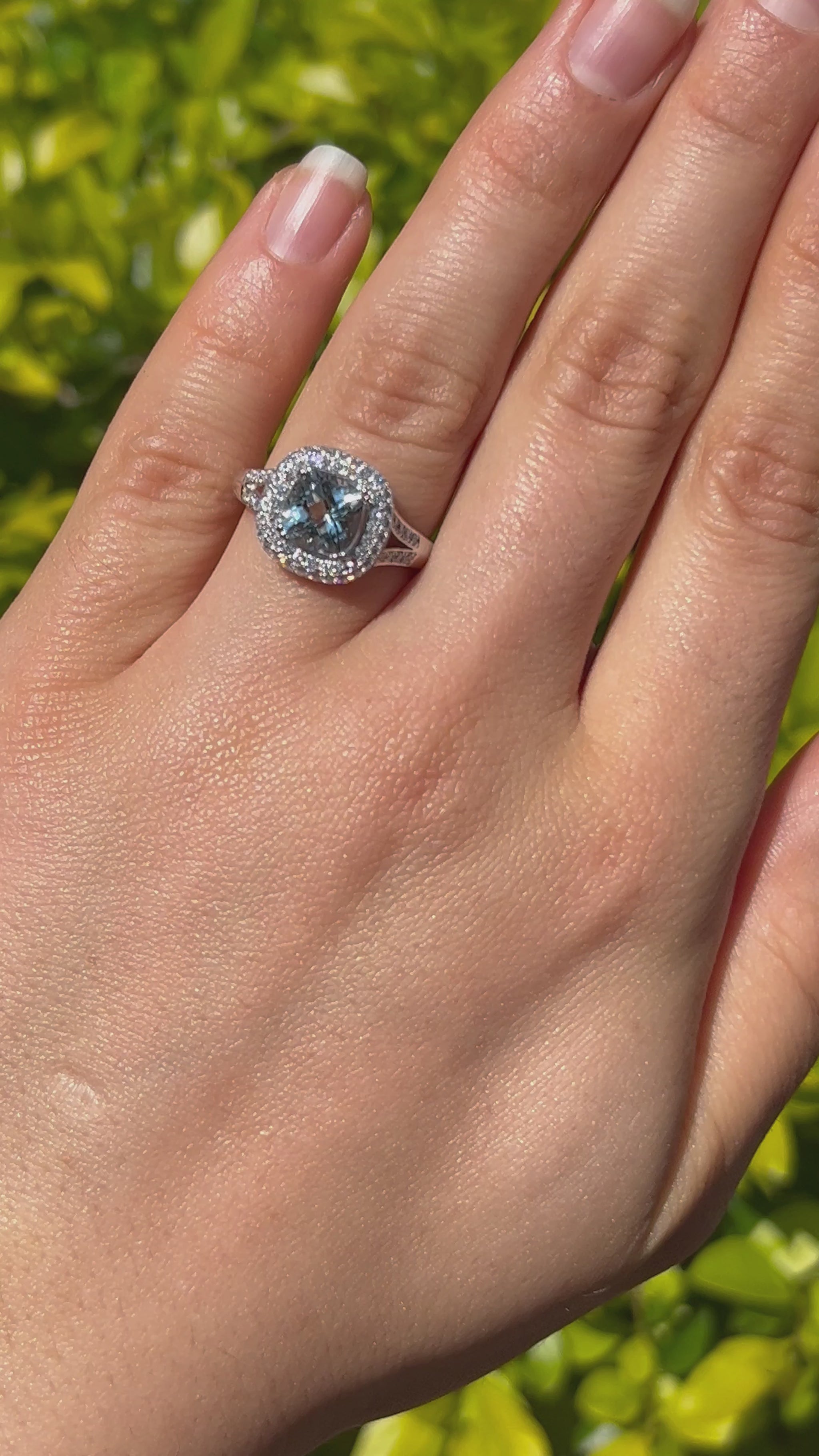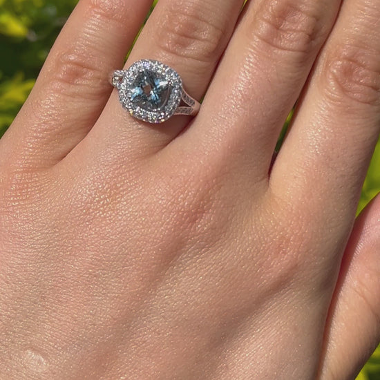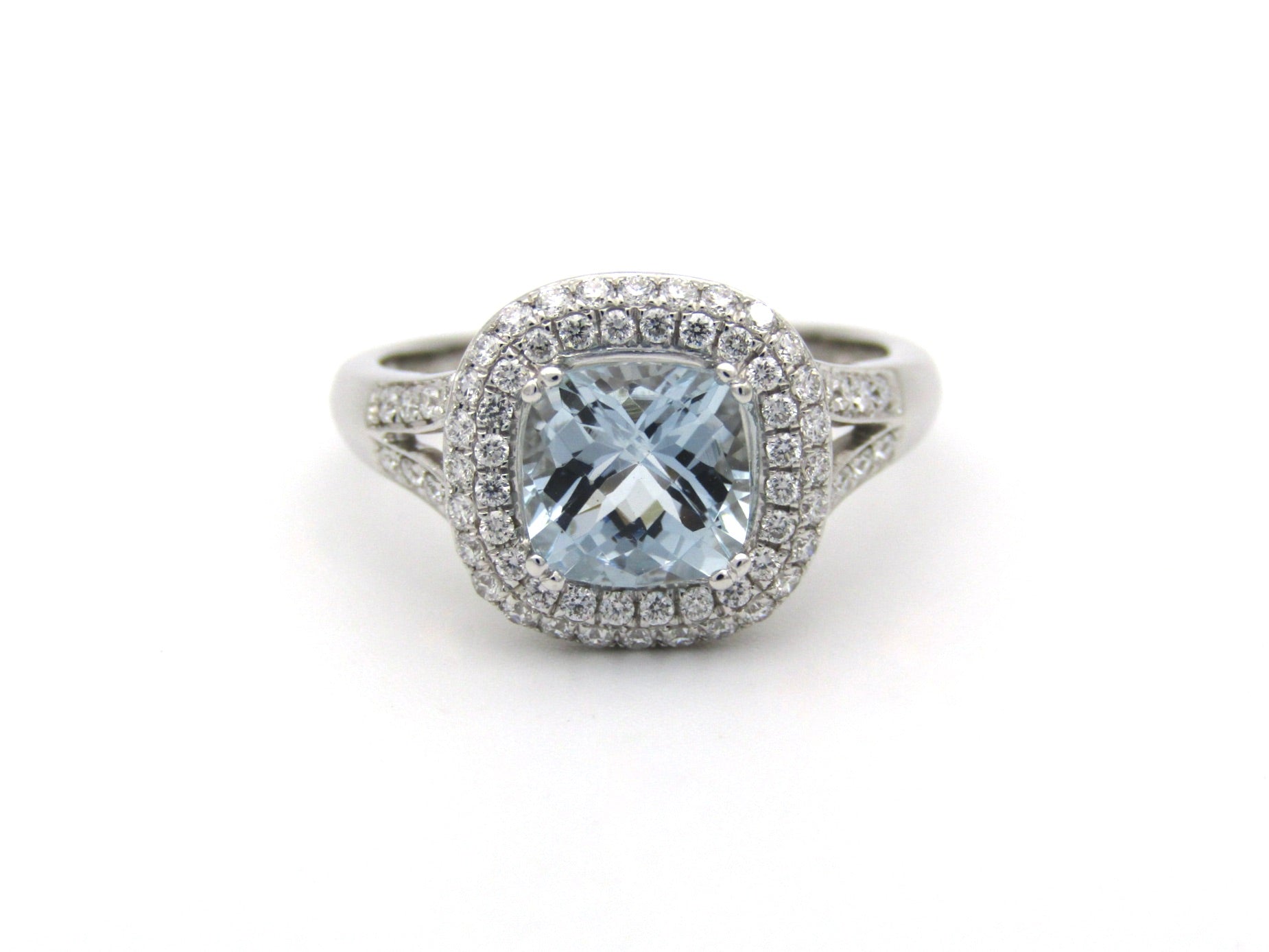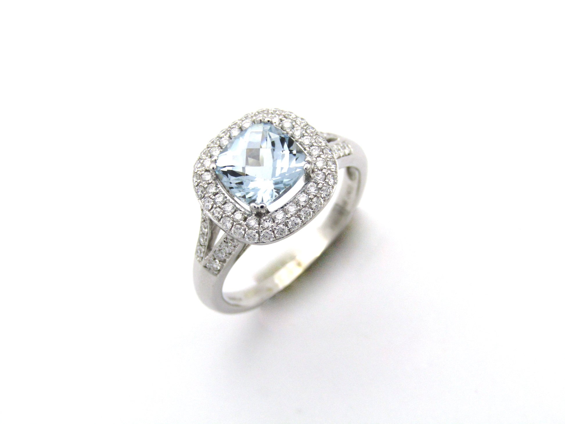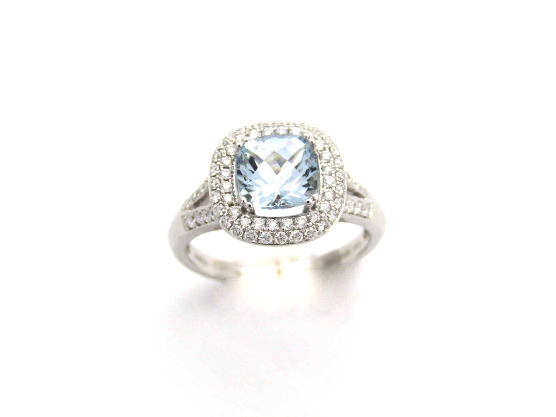 A light, sky-blue cushion-shaped aquamarine catches and reflects light from all angles with its checkerboard cut to create a dazzling, soft colour display. This beautiful aquamarine is surrounded by a double halo of the highest quality precision-cut round brilliant cut diamonds that sparkle with ice-white colour. Tapering from the double halo onto the v-split shoulders more diamonds dazzle with their brilliance. The back of the ring (the gallery) has the characteristic Browns 'Angel' design in delicate pierced work. A real eye-catching, stunning ring! Masterfully handcrafted in 14K white gold by Browns.