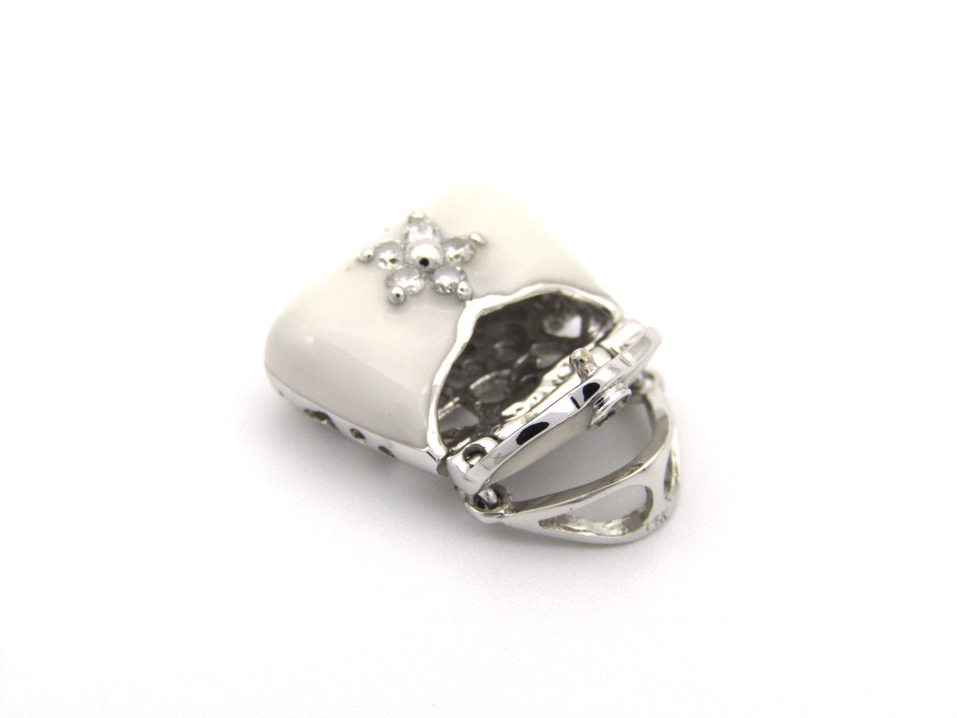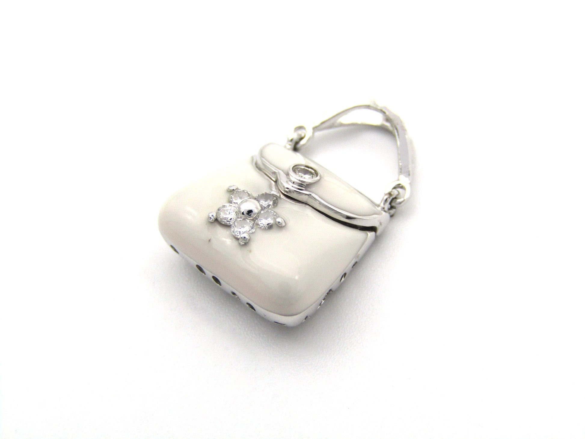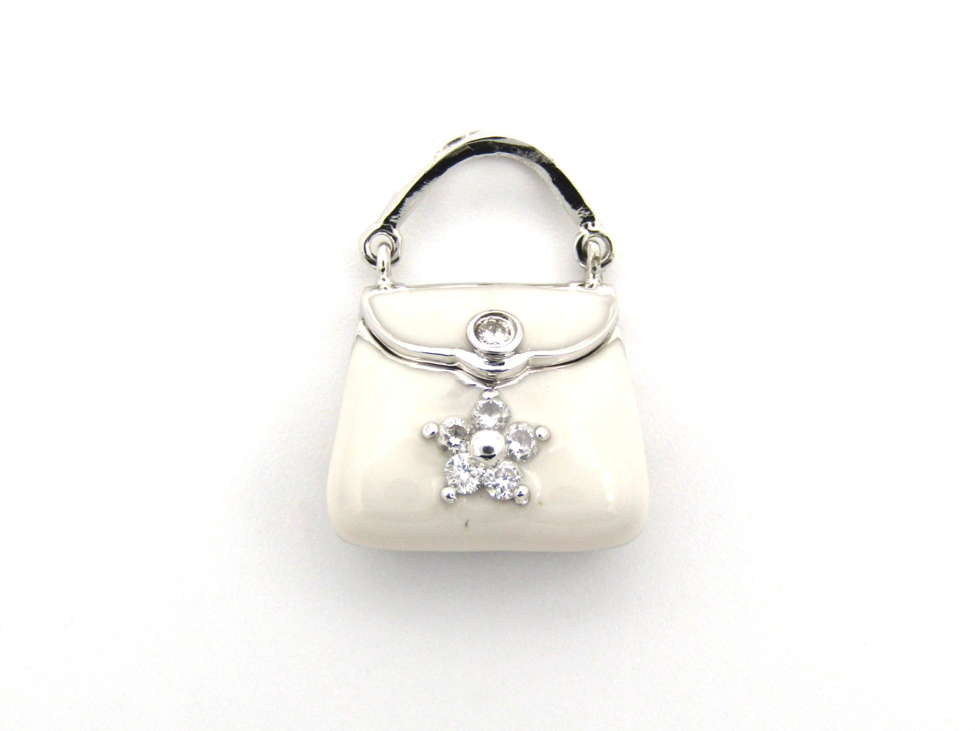 Have you ever wanted a handbag just to show off and didn't really care if you could fit your hairbrush in it? Then we have the perfect solution for you! Grab yourself this cute little pendant handbag complete in 14K white gold with an enamel front set with a diamond flower, and a diamond where the flap closes. If this wasn't enough - the back also has heart designs punched into the back and a lovely little handle is on top where your chain fits through - simply adorable! Made by Jack Friedman. (Chain is excluded and is used for illustrative purposes only).