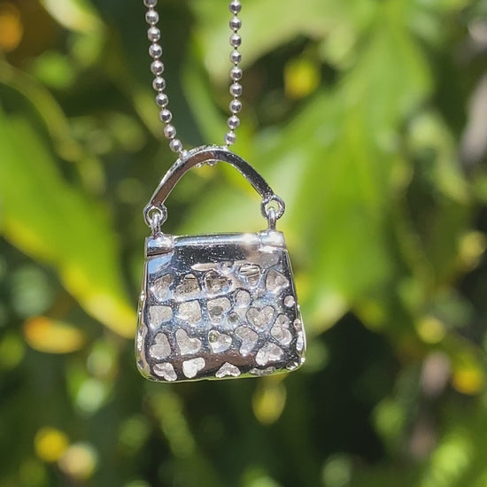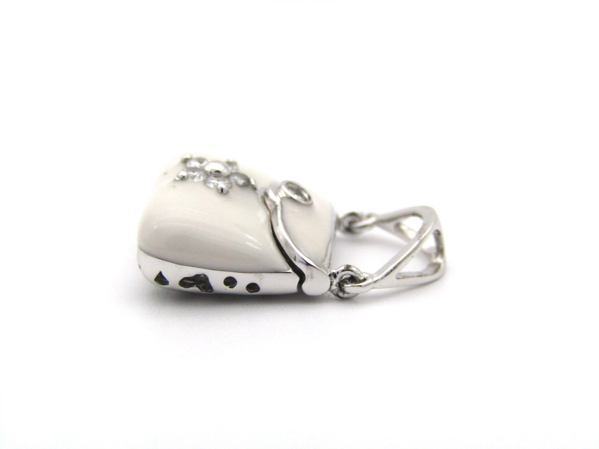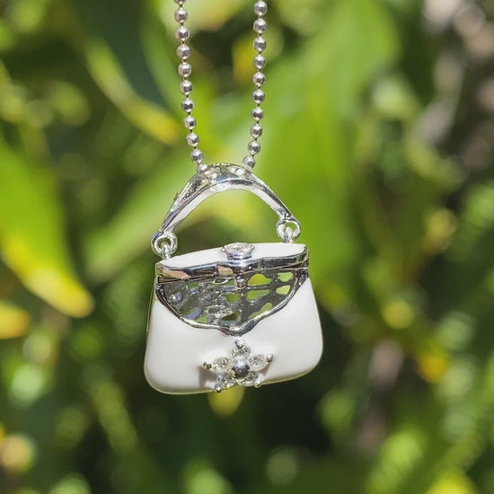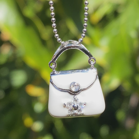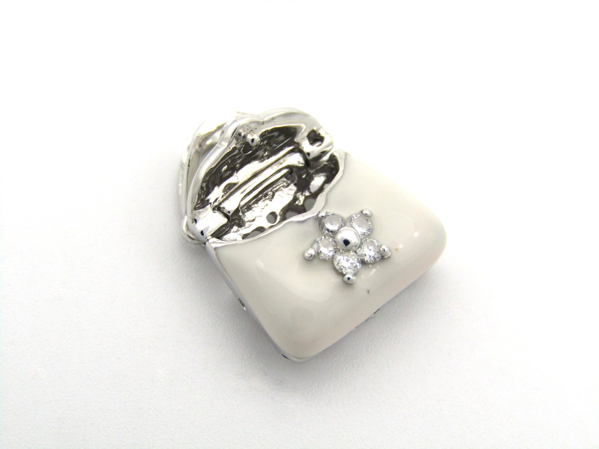 Have you ever wanted a handbag just to show off and didn't really care if you could fit your hairbrush in it? Then we have the perfect solution for you! Grab yourself this cute little pendant handbag complete in 14K white gold with an enamel front set with a diamond flower, and a diamond where the flap closes. If this wasn't enough - the back also has heart designs punched into the back and a lovely little handle is on top where your chain fits through - simply adorable! Made by Jack Friedman. (Chain is excluded and is used for illustrative purposes only).