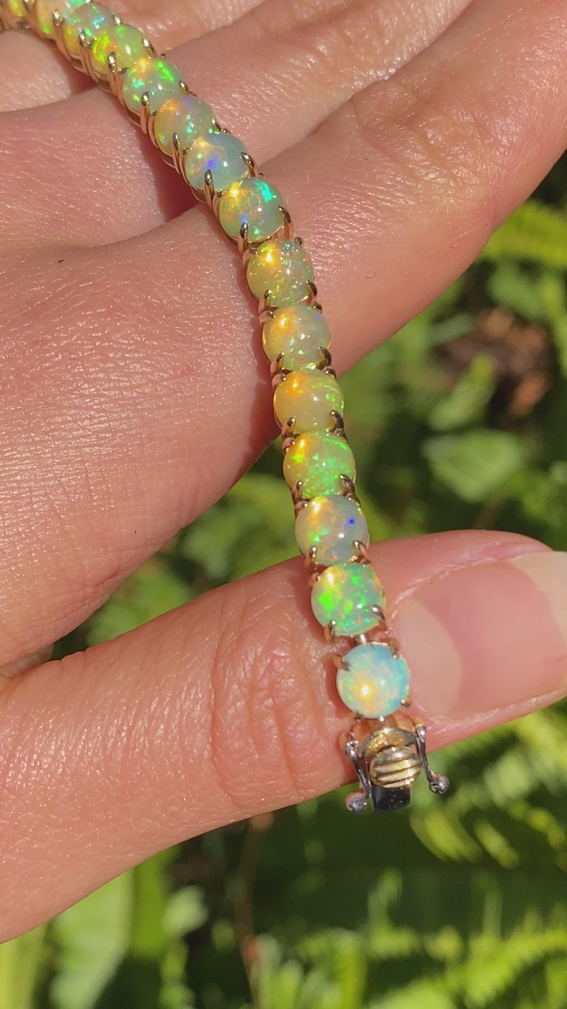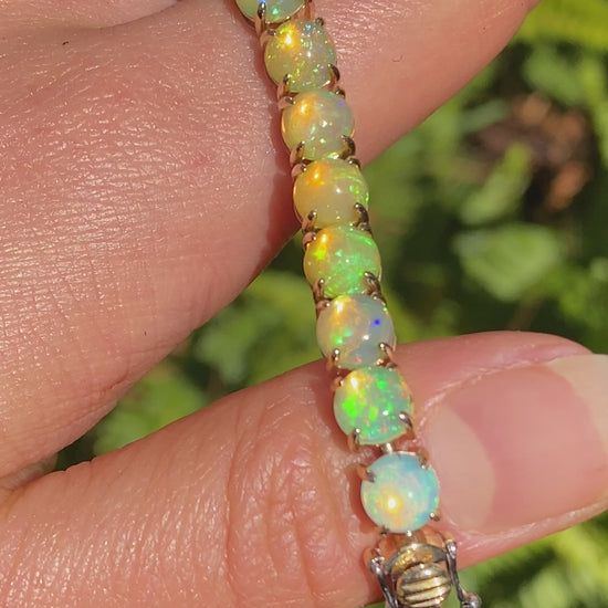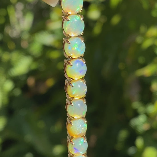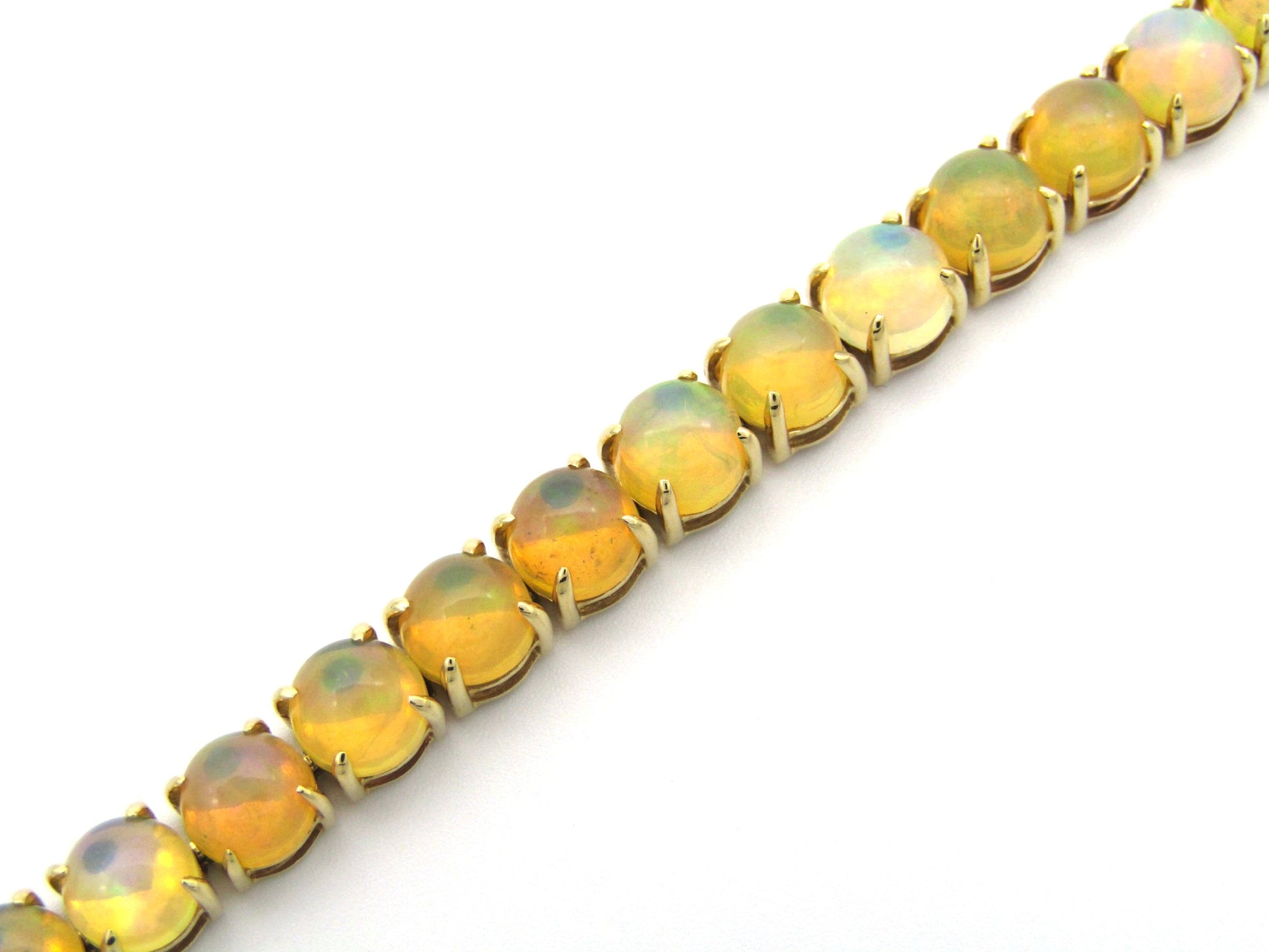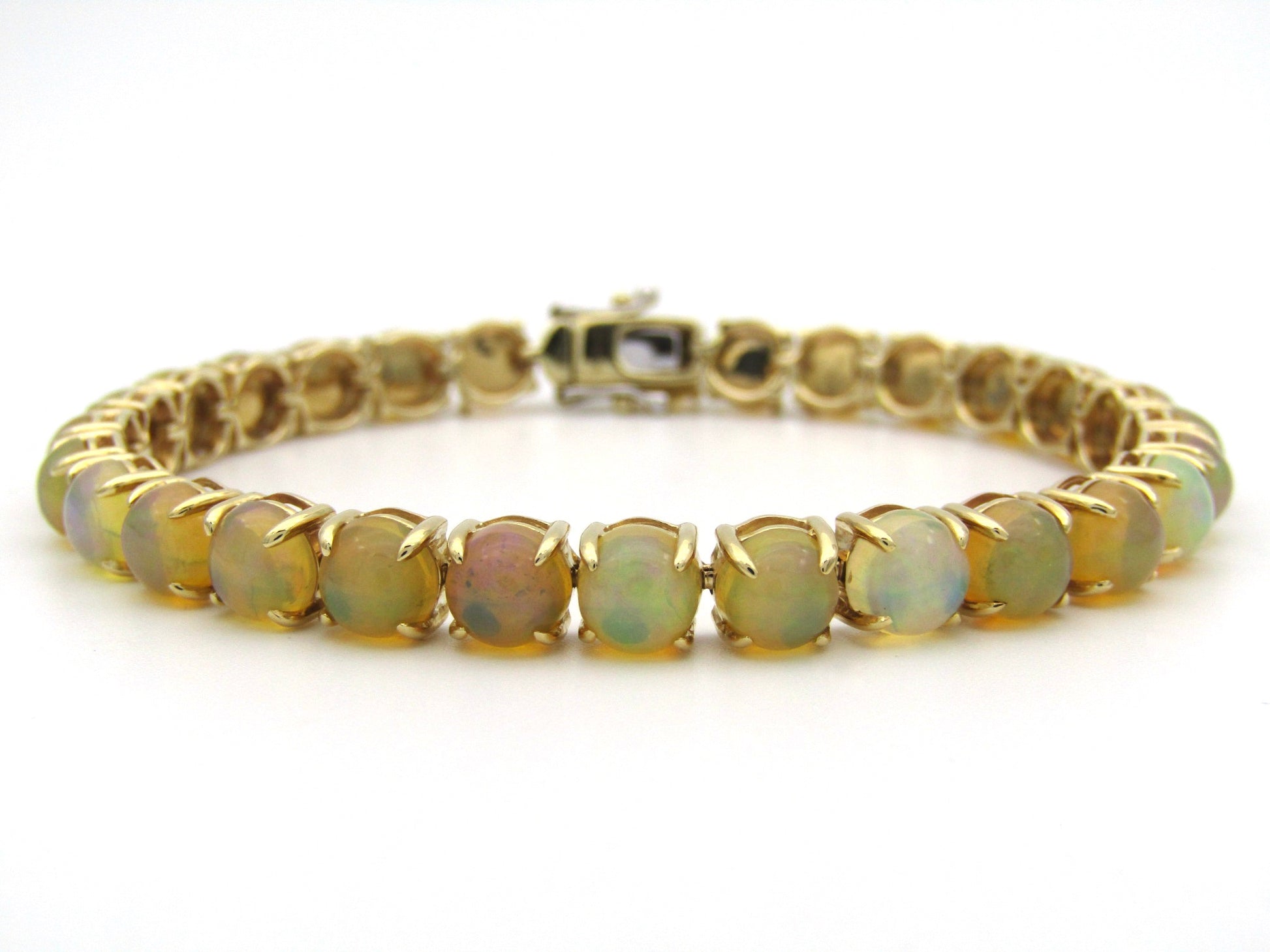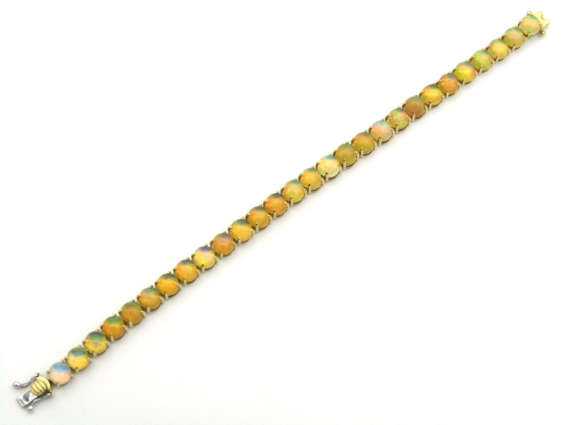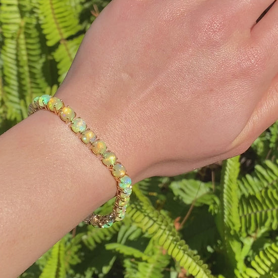 Be eye-catching and stylish with a multicoloured display of fire encircling your wrist. Master-crafted with 28 Fire opals that are claw-set in gleaming 14K gold. Made by Jack Friedman.