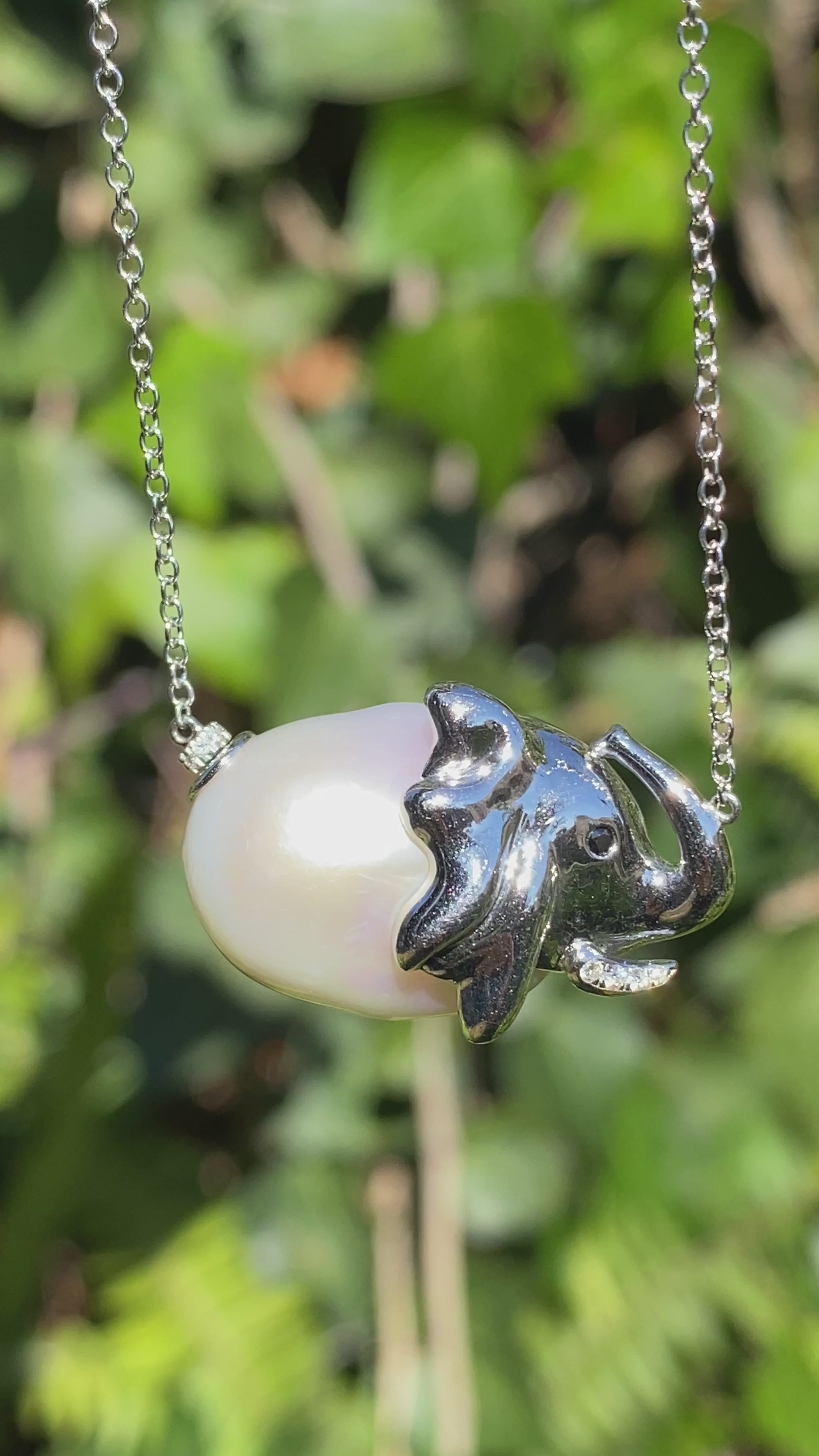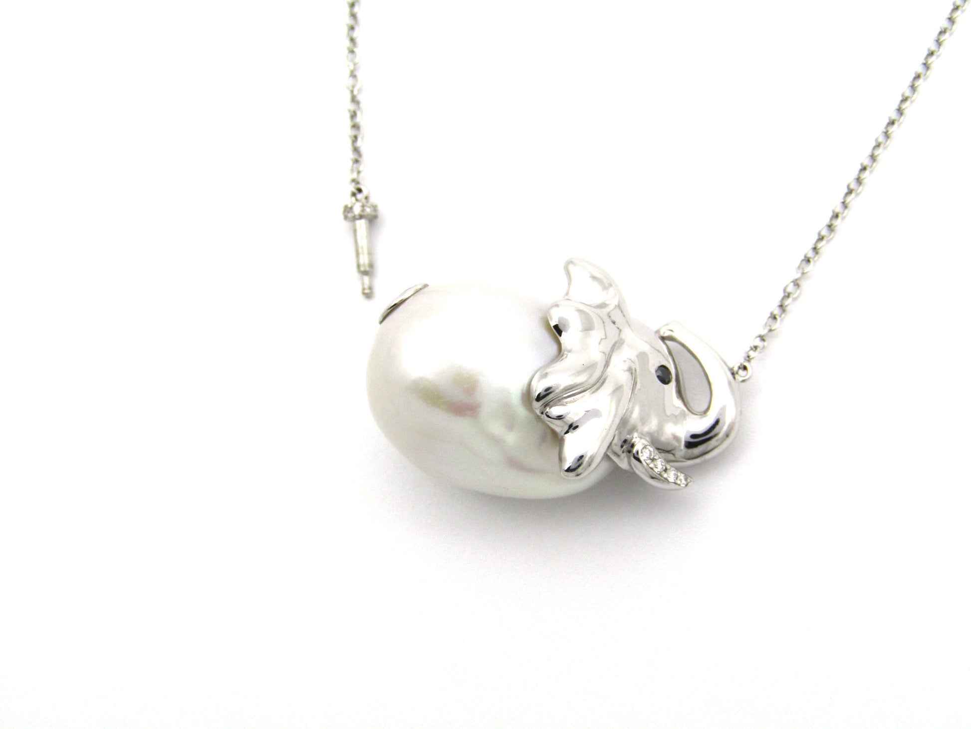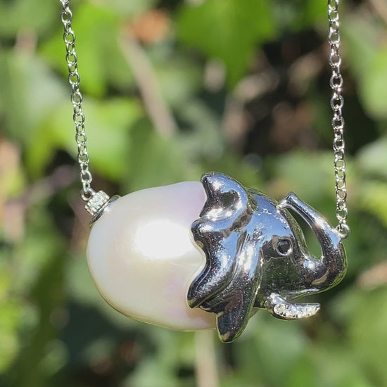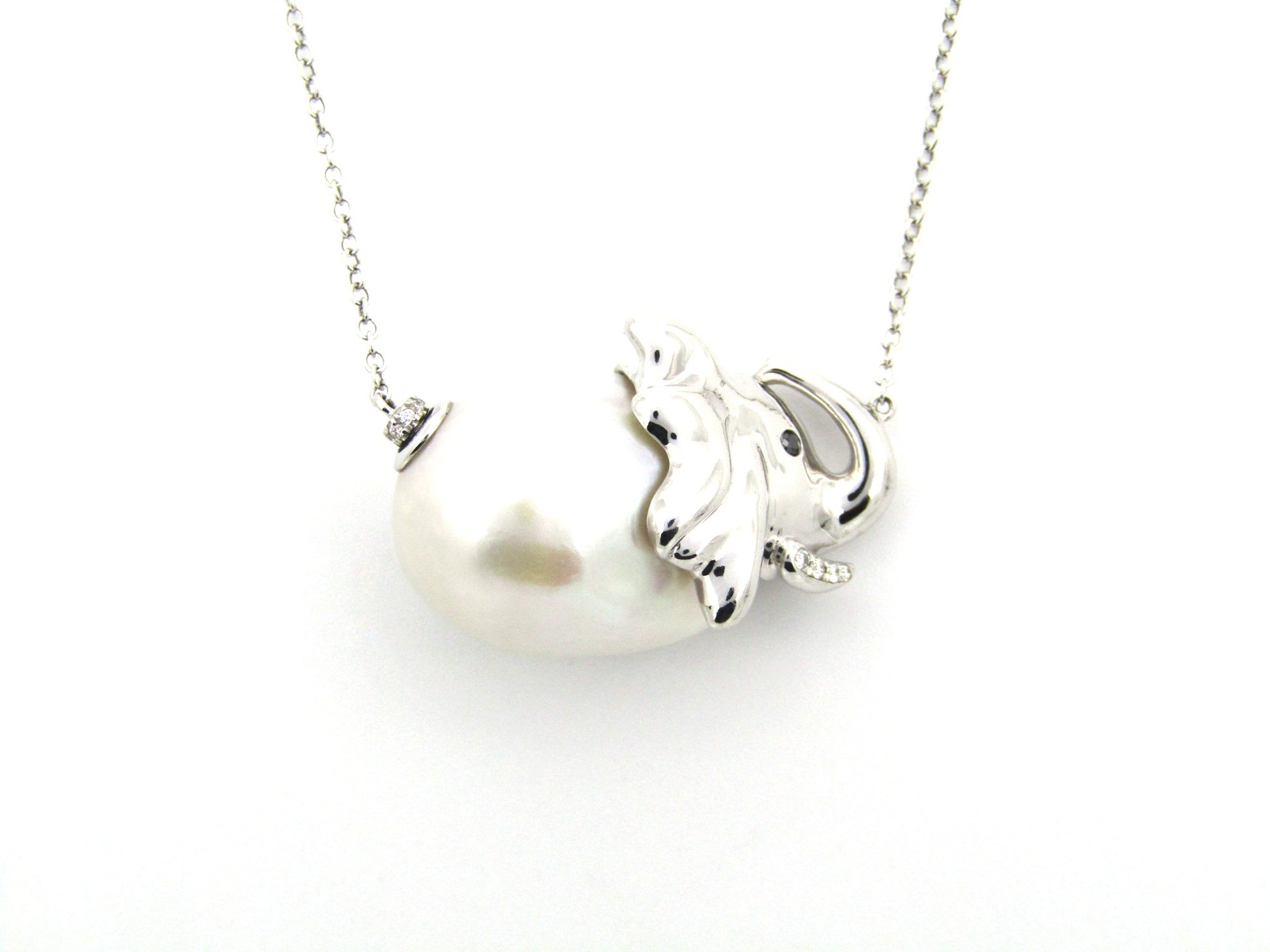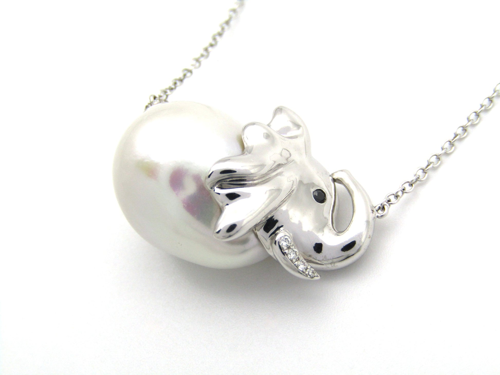 The biggest of The Big Five, with soulful eyes, gently sloping tusks, and a strong, sounding trunk, which represents strength, wisdom, and good luck, is beautifully represented with a baroque pearl body and 14K gold ear, face, and trunk. The tusk is set with sparkly round brilliant cut diamonds, and a single black diamond is the eye. The cute tail is set with diamonds and can be pressed down to open the necklace. Made by Jack Friedman.