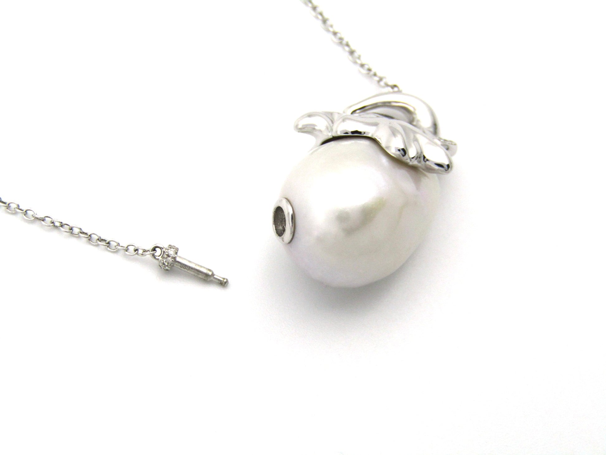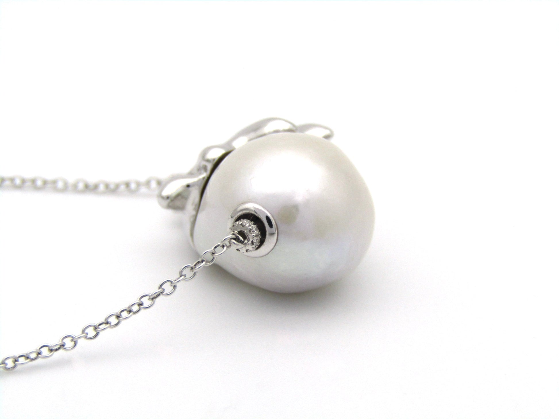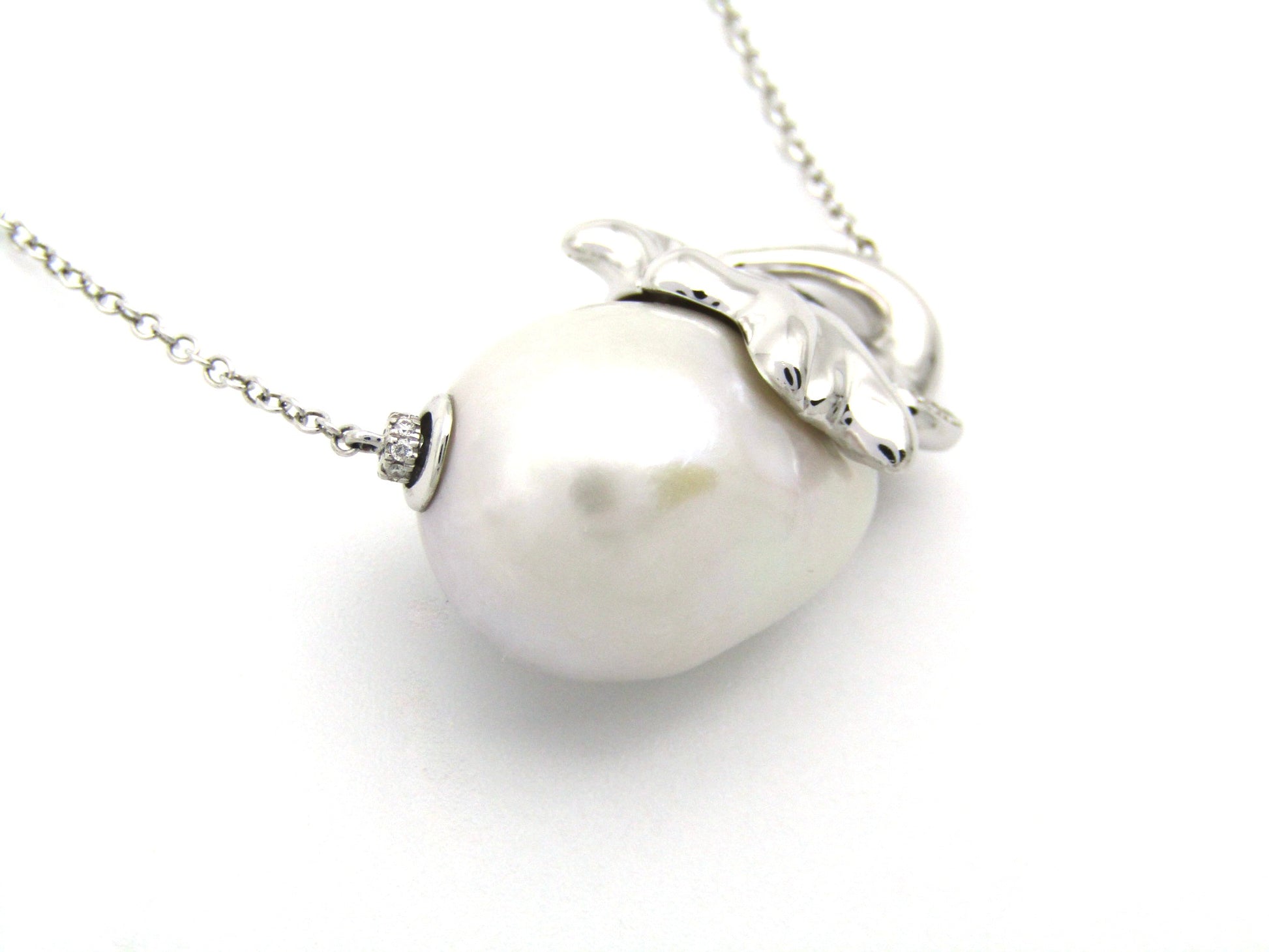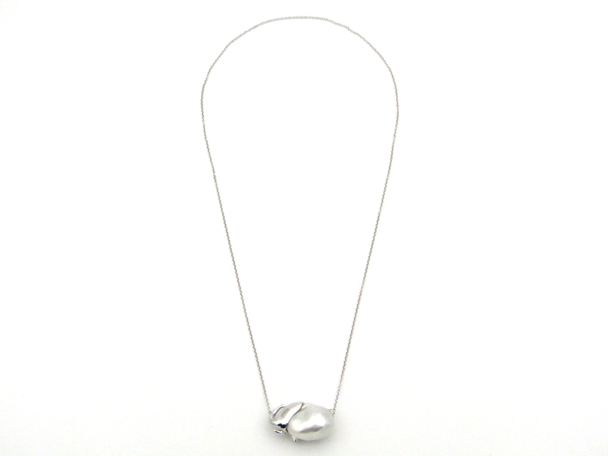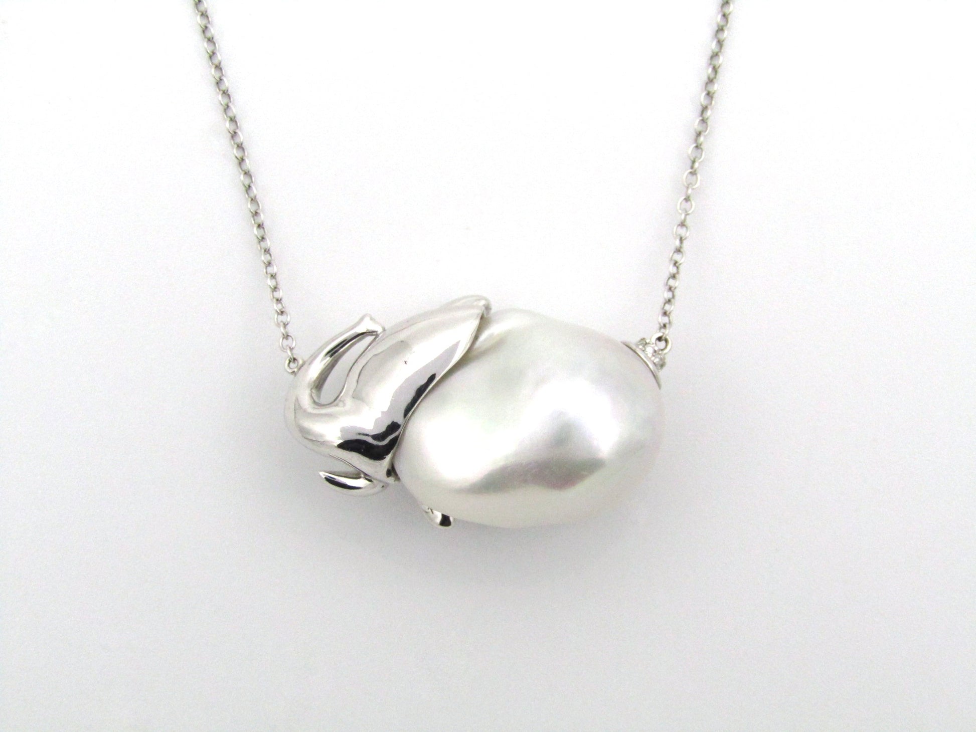 The biggest of The Big Five, with soulful eyes, gently sloping tusks, and a strong, sounding trunk, which represents strength, wisdom, and good luck, is beautifully represented with a baroque pearl body and 14K gold ear, face, and trunk. The tusk is set with sparkly round brilliant cut diamonds, and a single black diamond is the eye. The cute tail is set with diamonds and can be pressed down to open the necklace. Made by Jack Friedman.
