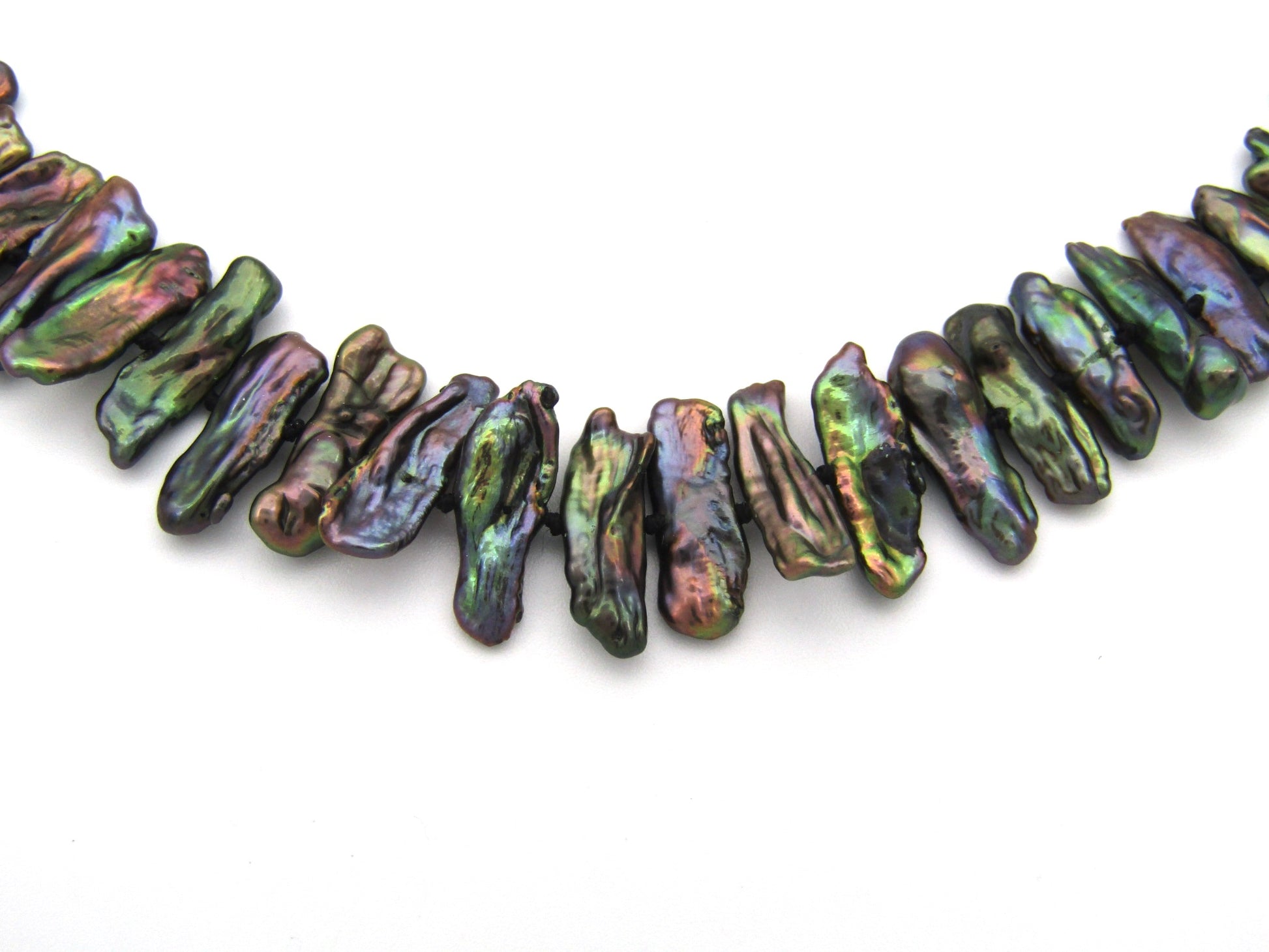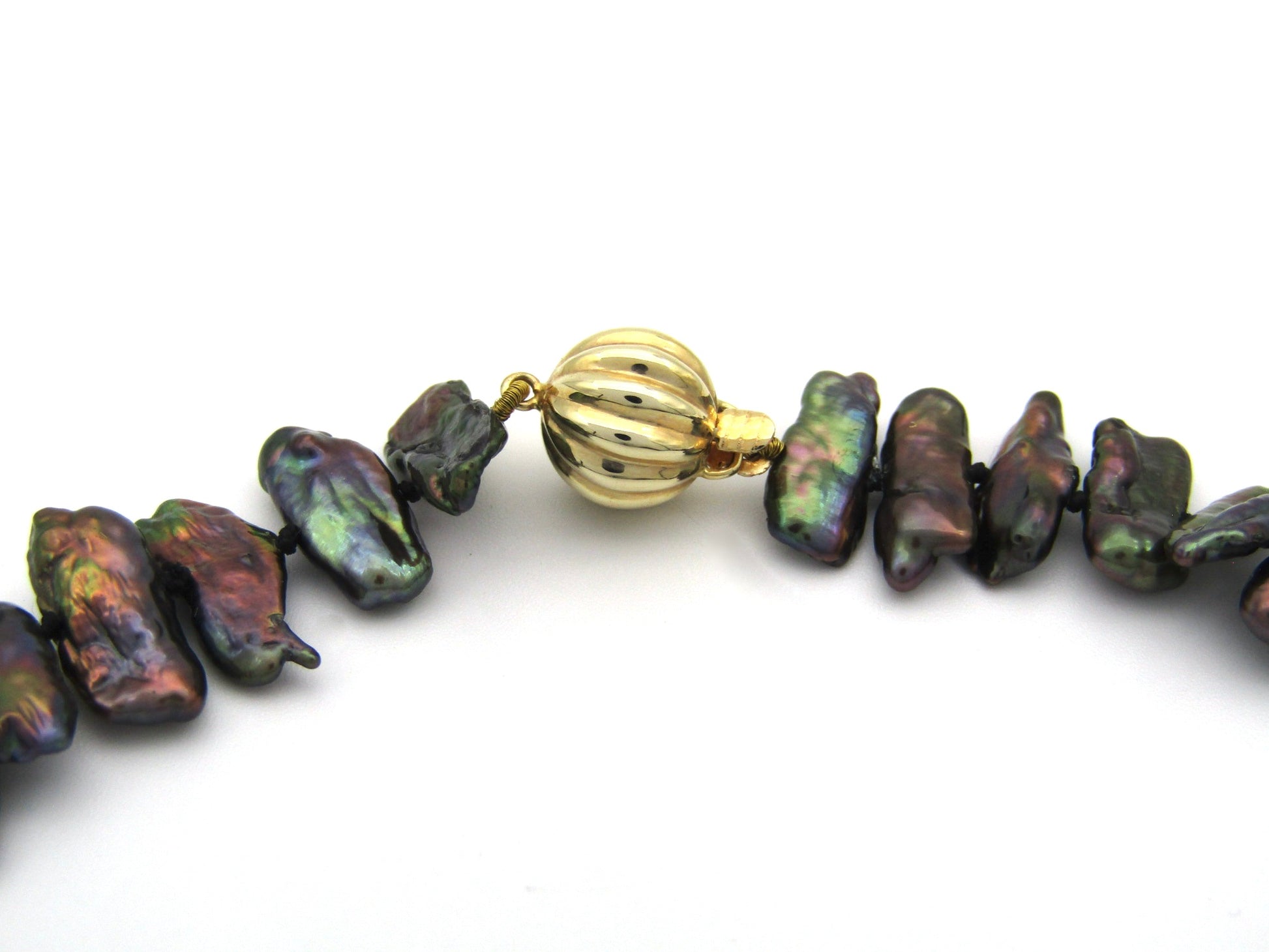 Rich, lustrous, aubergine-coloured freshwater pearls have been hand-strung in this necklace filled with lots of character. The irregularly-shaped pearls have striking colours and tie behind your neck with a 14k yellow gold textured ball clasp. Made by Jack Friedman.