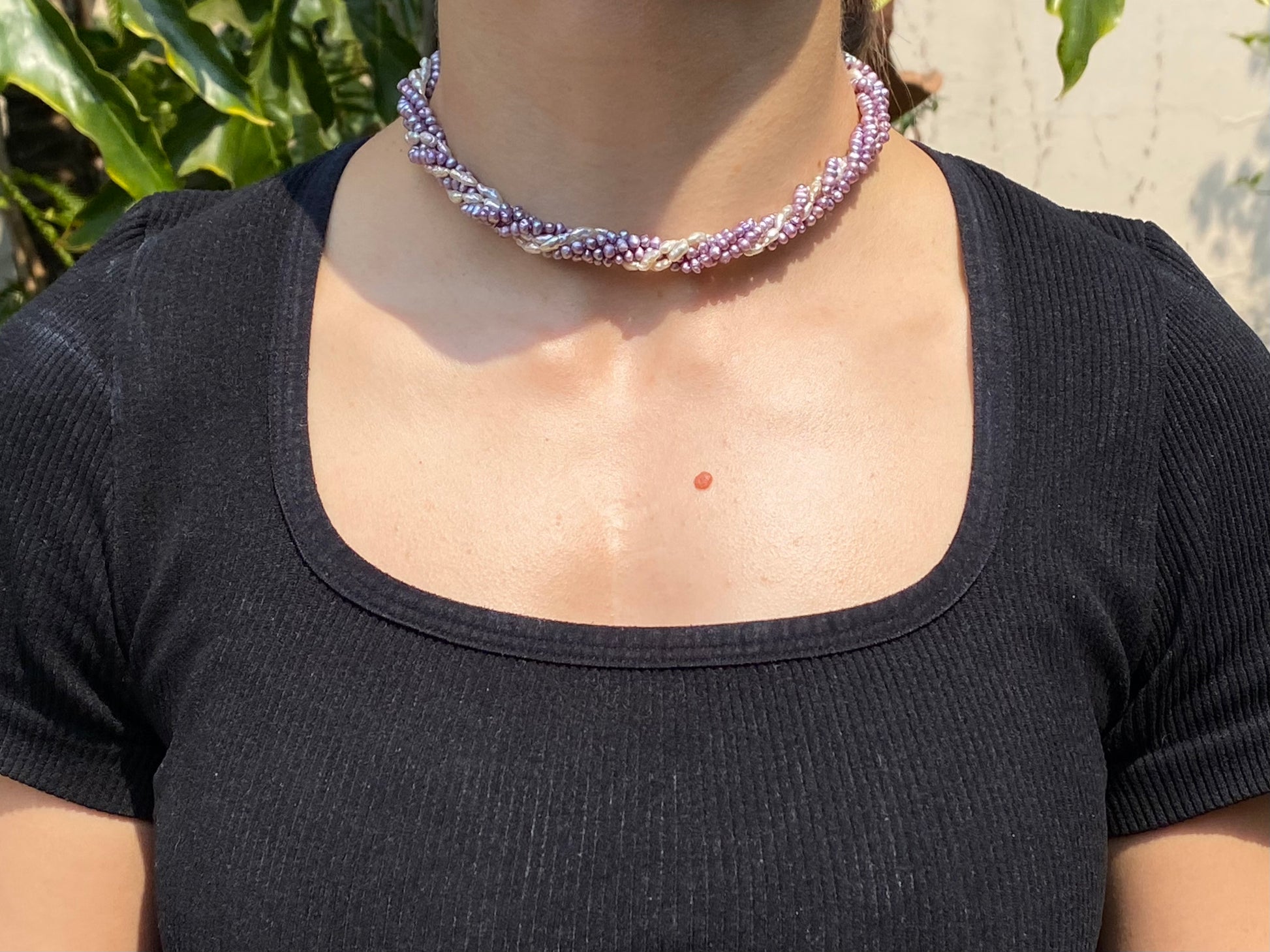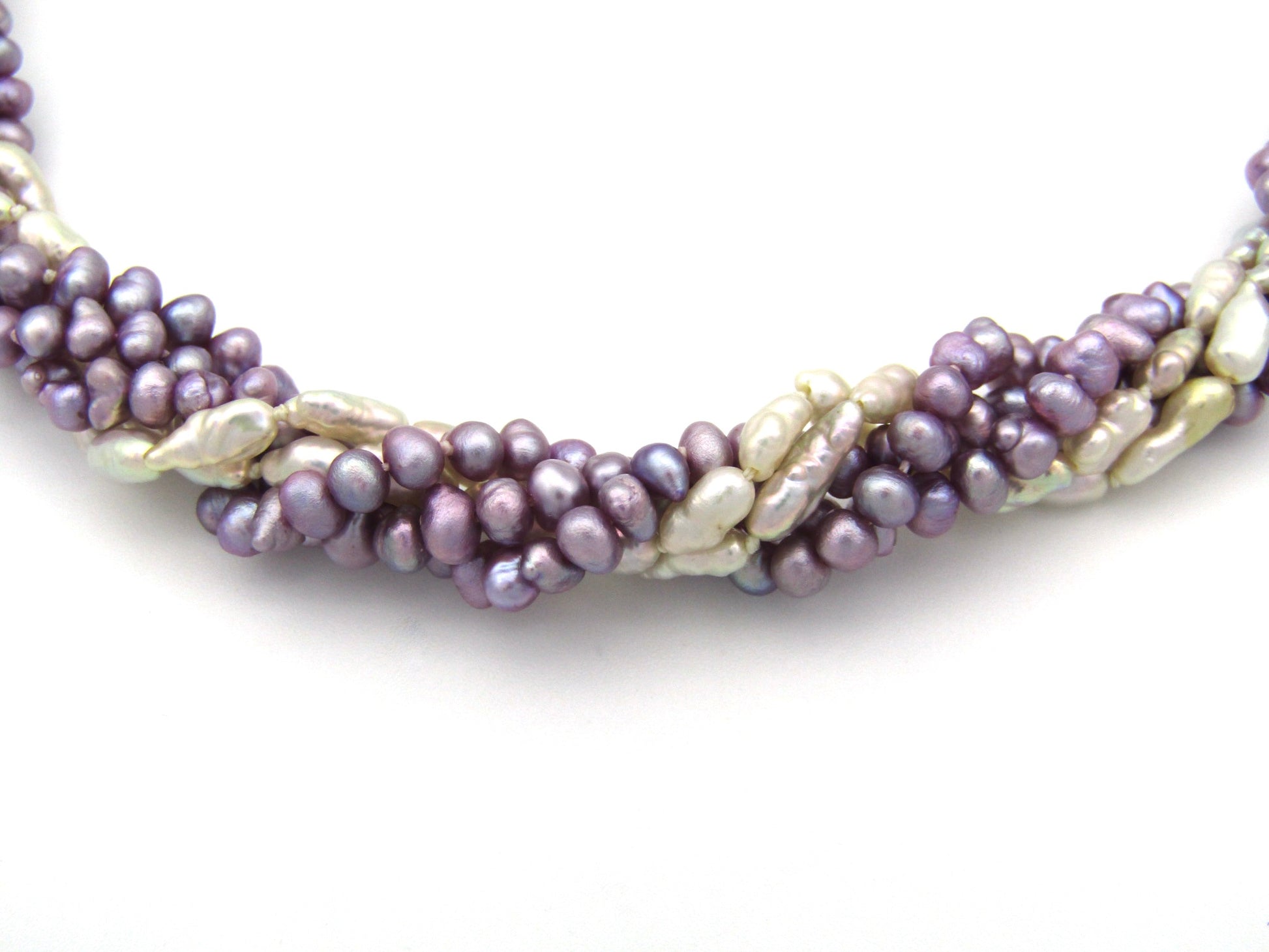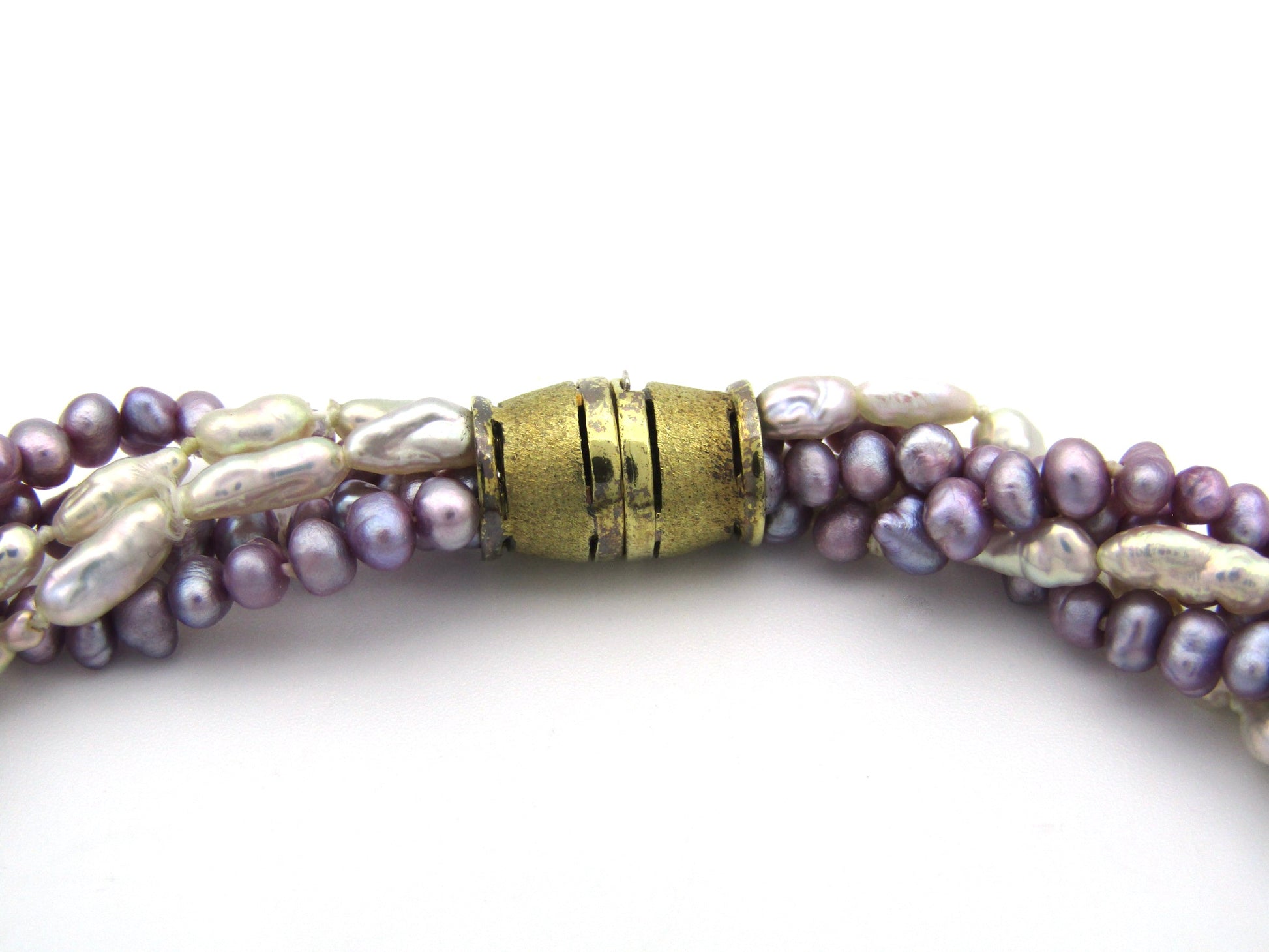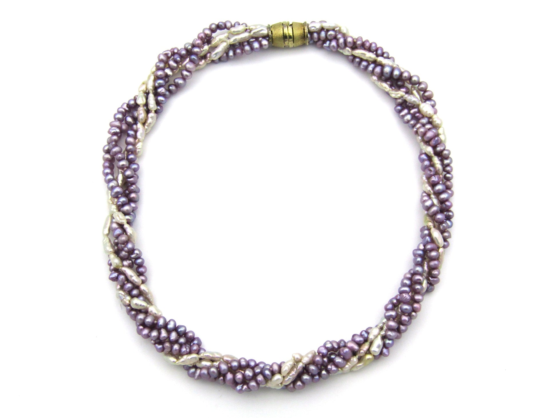 Strands of lavender purple and pearly white freshwater pearls have been twisted around one another creating character and style in this beautiful necklace. The lovely barrel-shaped clasp has been crafted by Jka Khöle of Pforzheim, Germany, and the necklace was made by Jack Friedman, circa 1970's.