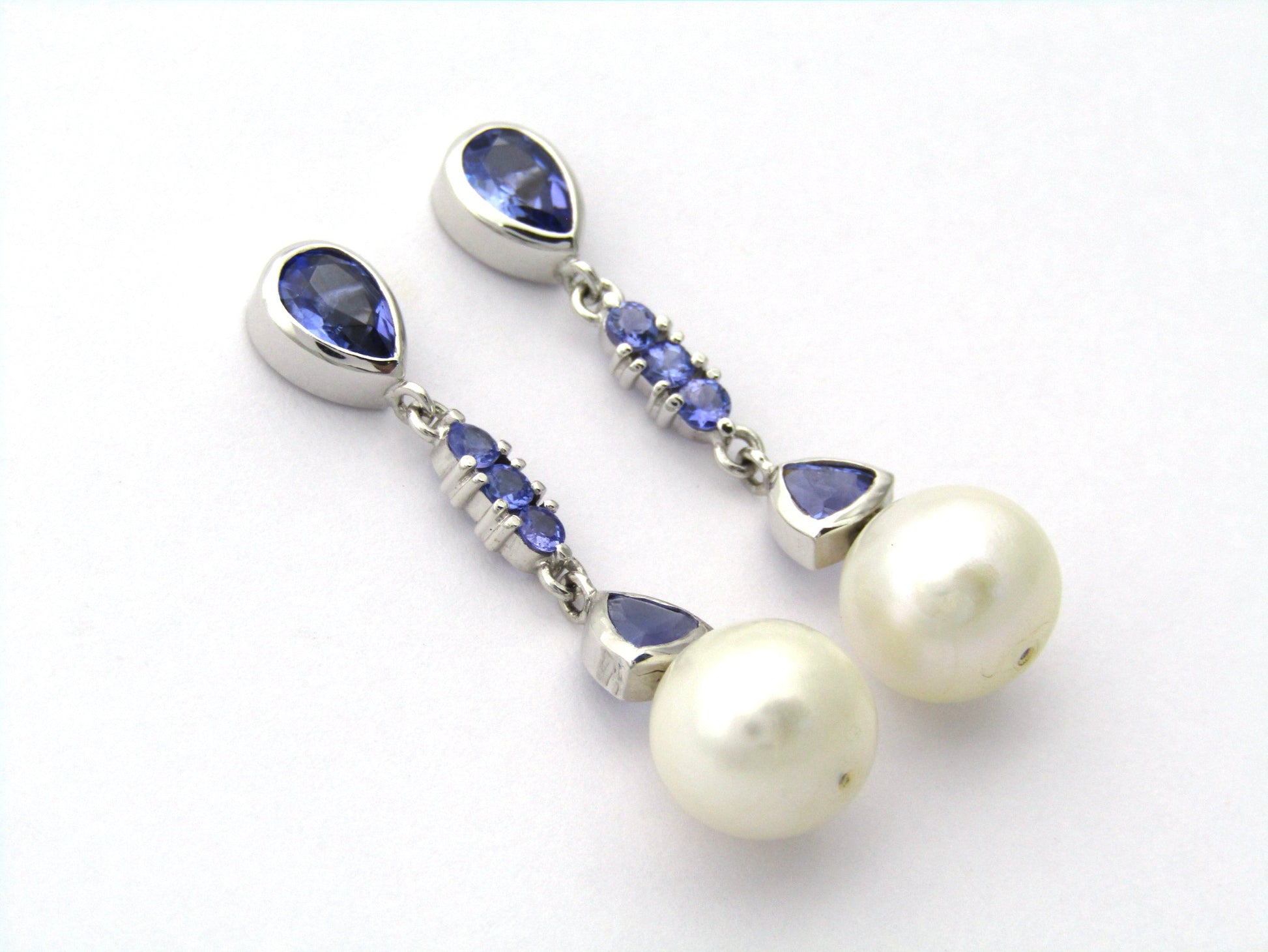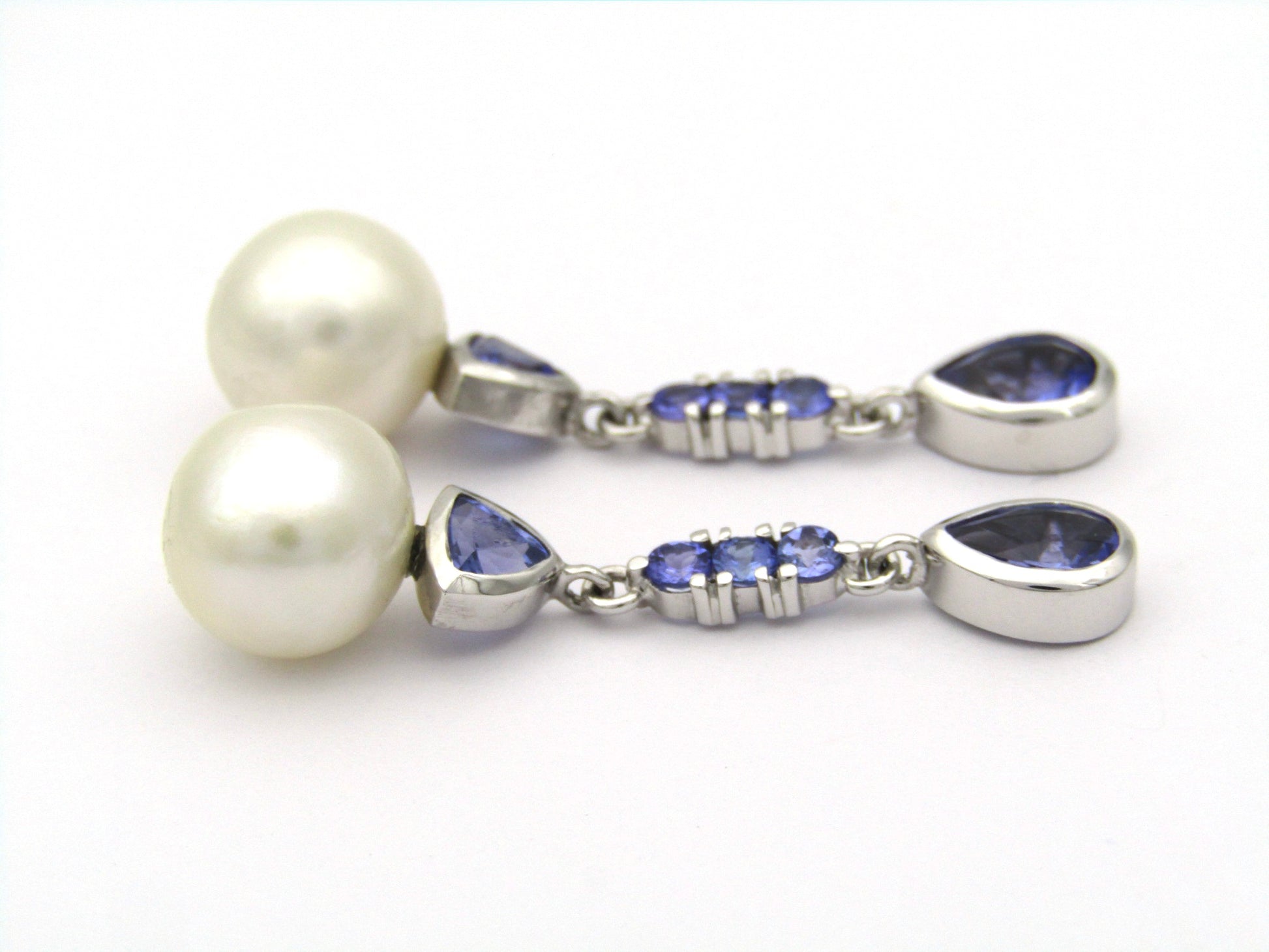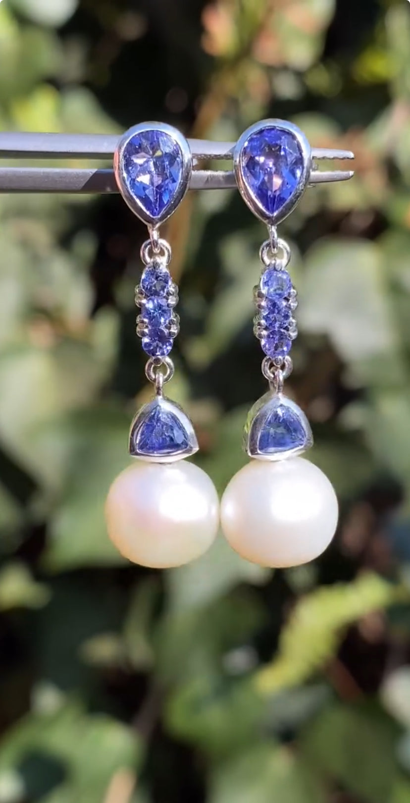 A stunning pair of 14K white gold earrings set with radiant pear-, round-, and triangular-shaped tanzanites, with a dreamy freshwater pearl dangling at the bottom.
