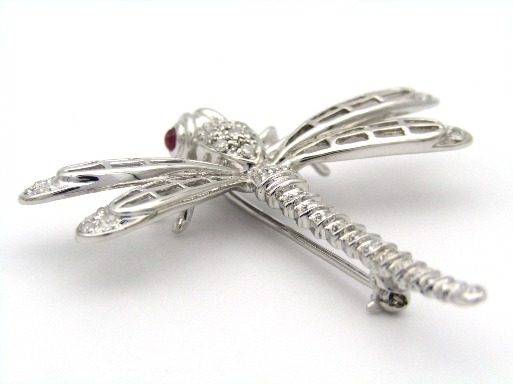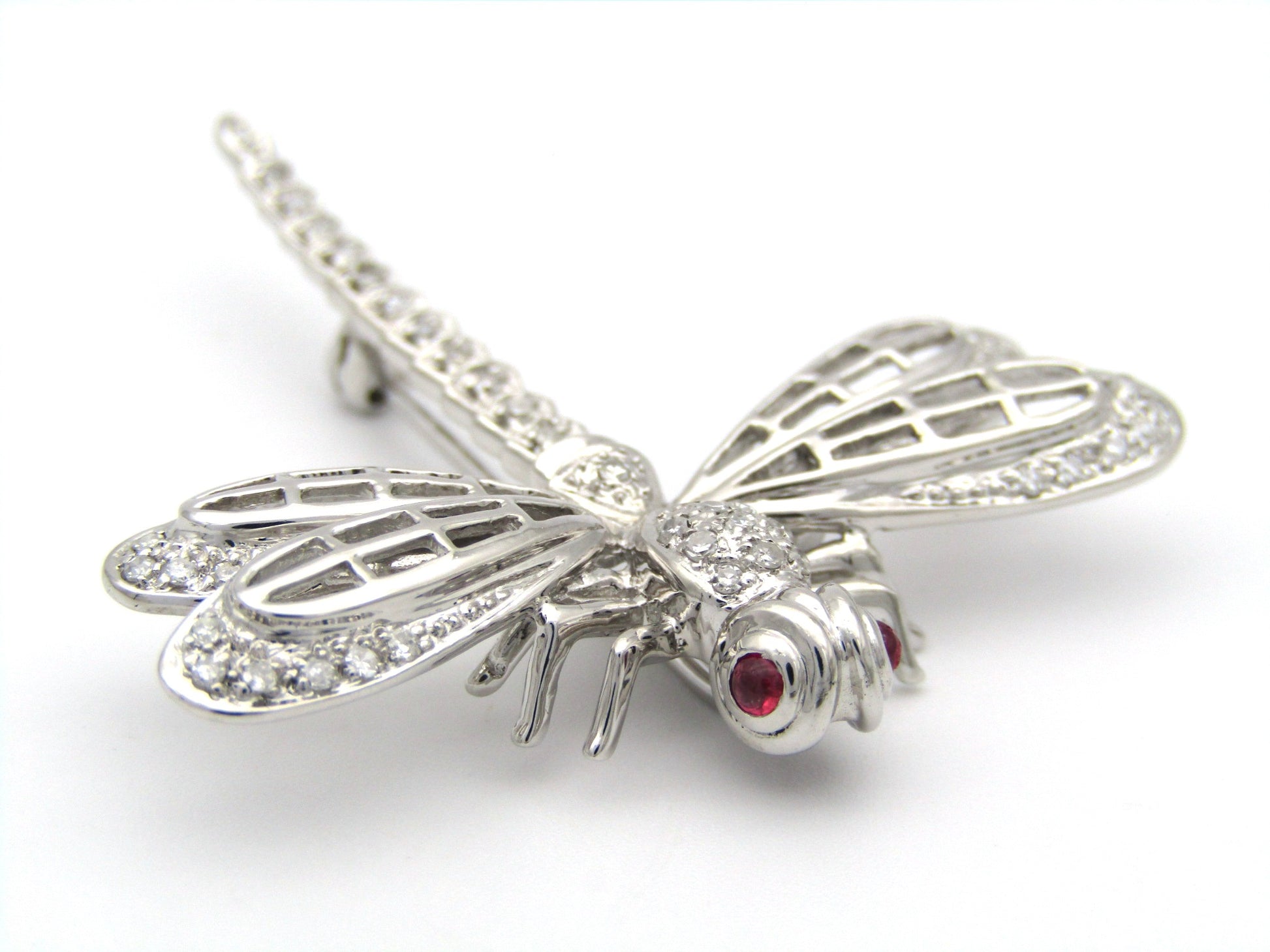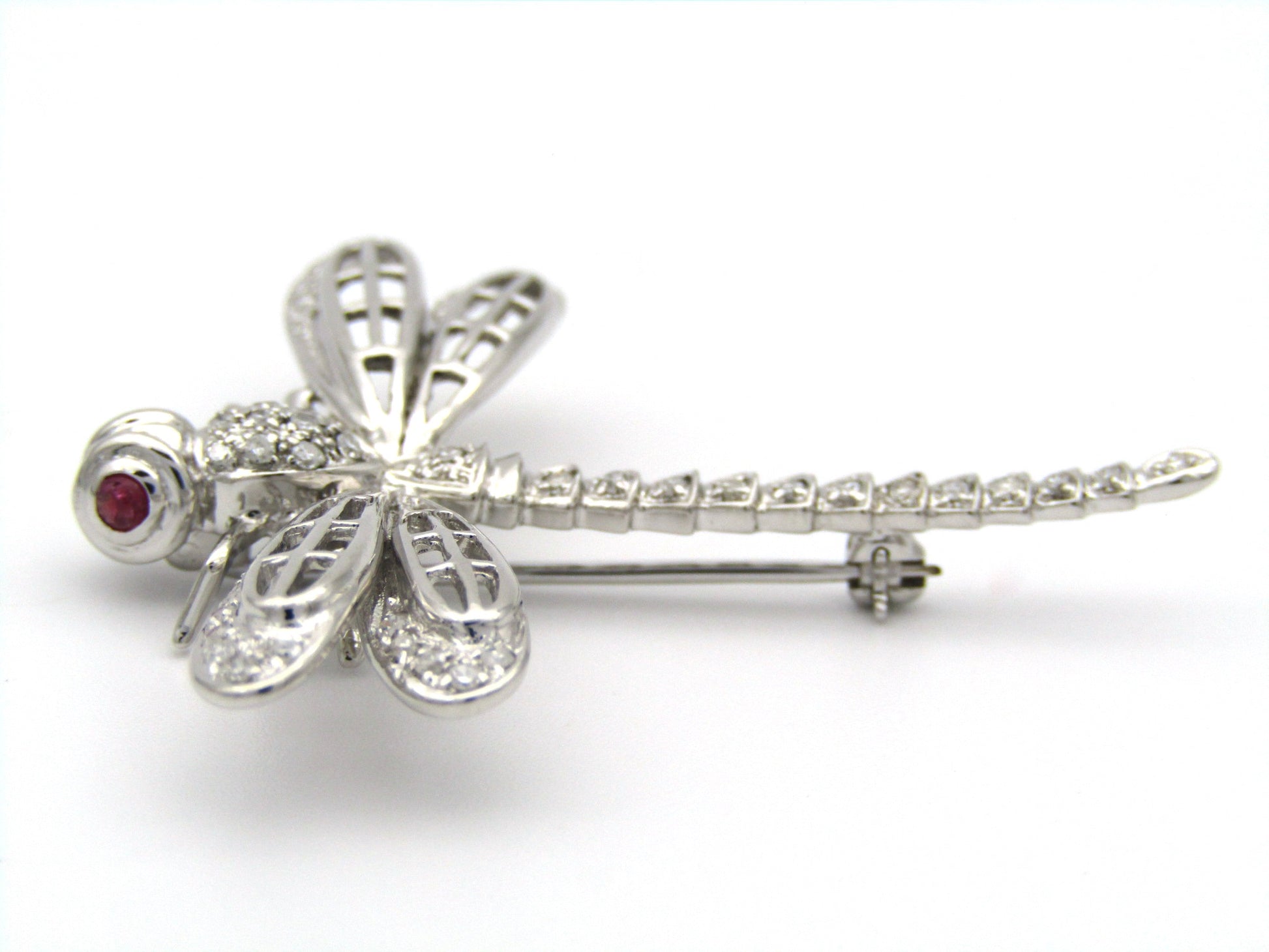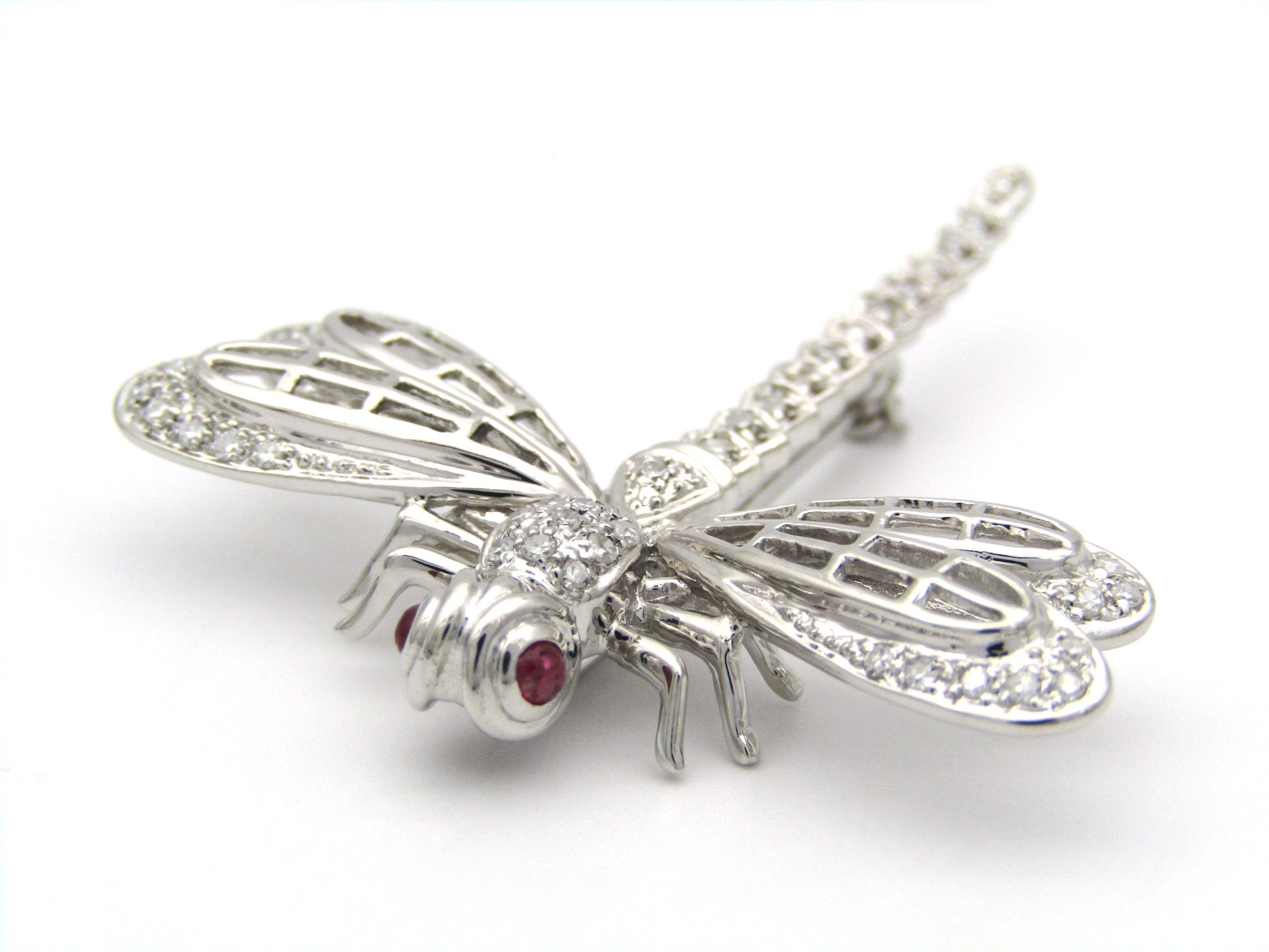 Exceptional flyers, with near 360 degree vision, the dragonfly is a remarkable insect in the animal kingdom who's metamorphosis from water to air is a powerful symbol for profound personal change, shedding old limitations, and embarking on new, vibrant beginnings. In this stunning creation, cranberry-red ruby eyes twinkle in the sun, while a masterfully crafted diamond-set body dazzles the eye. Handcrafted in 14K white gold and made circa 1940's, this marvellous brooch is the perfect companion to your lapel.