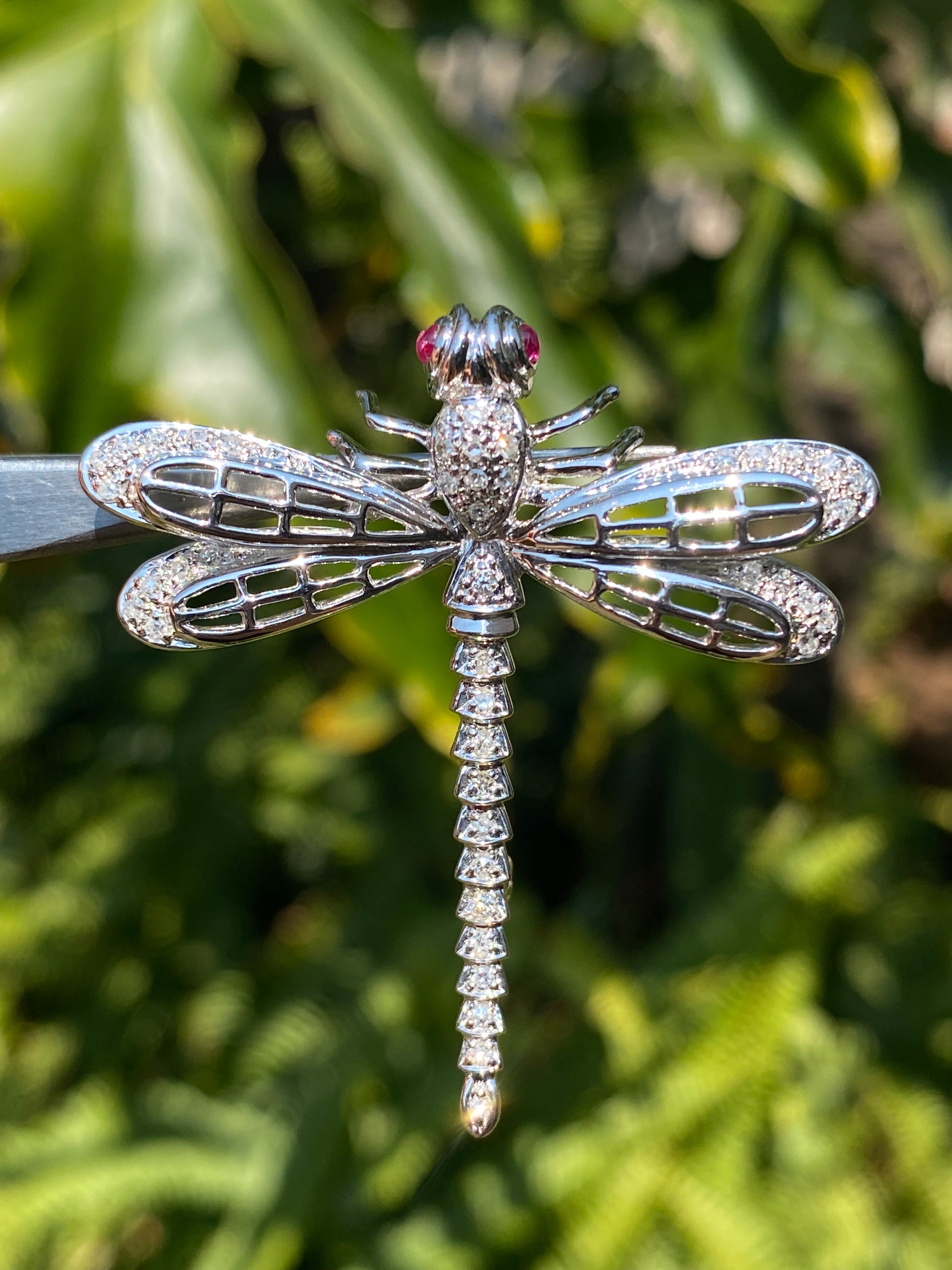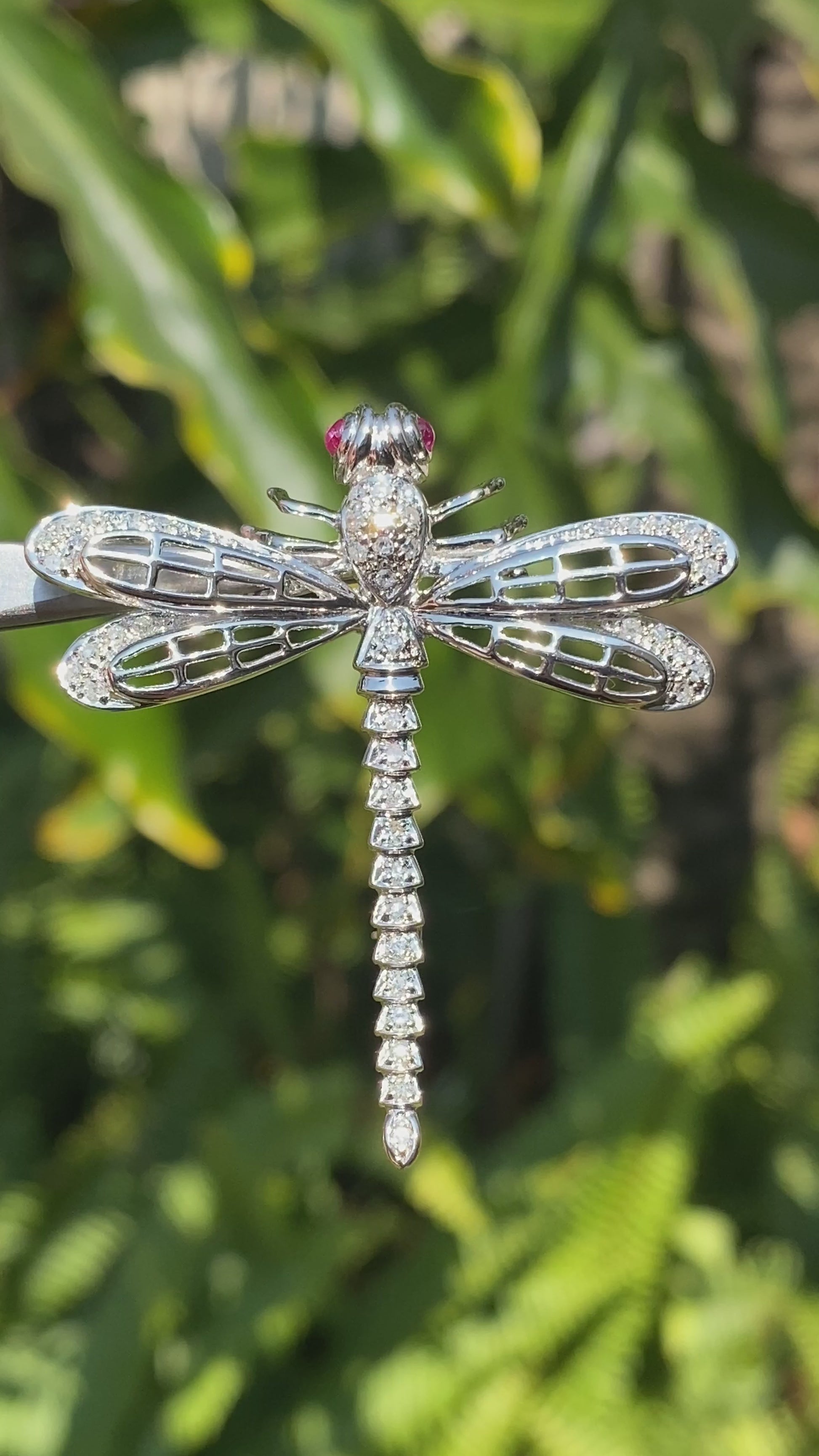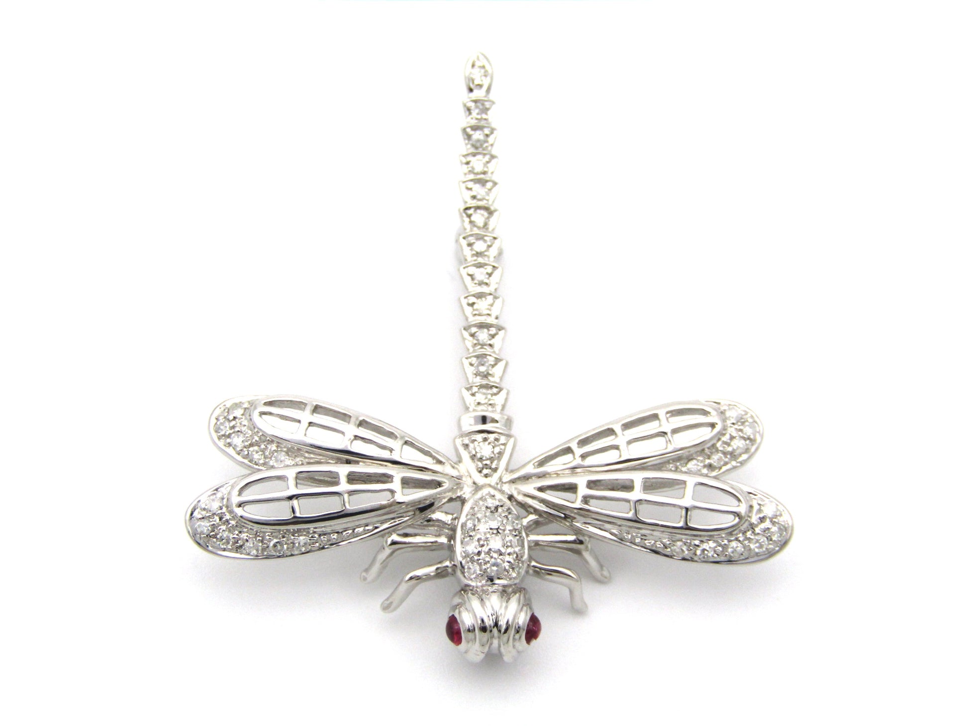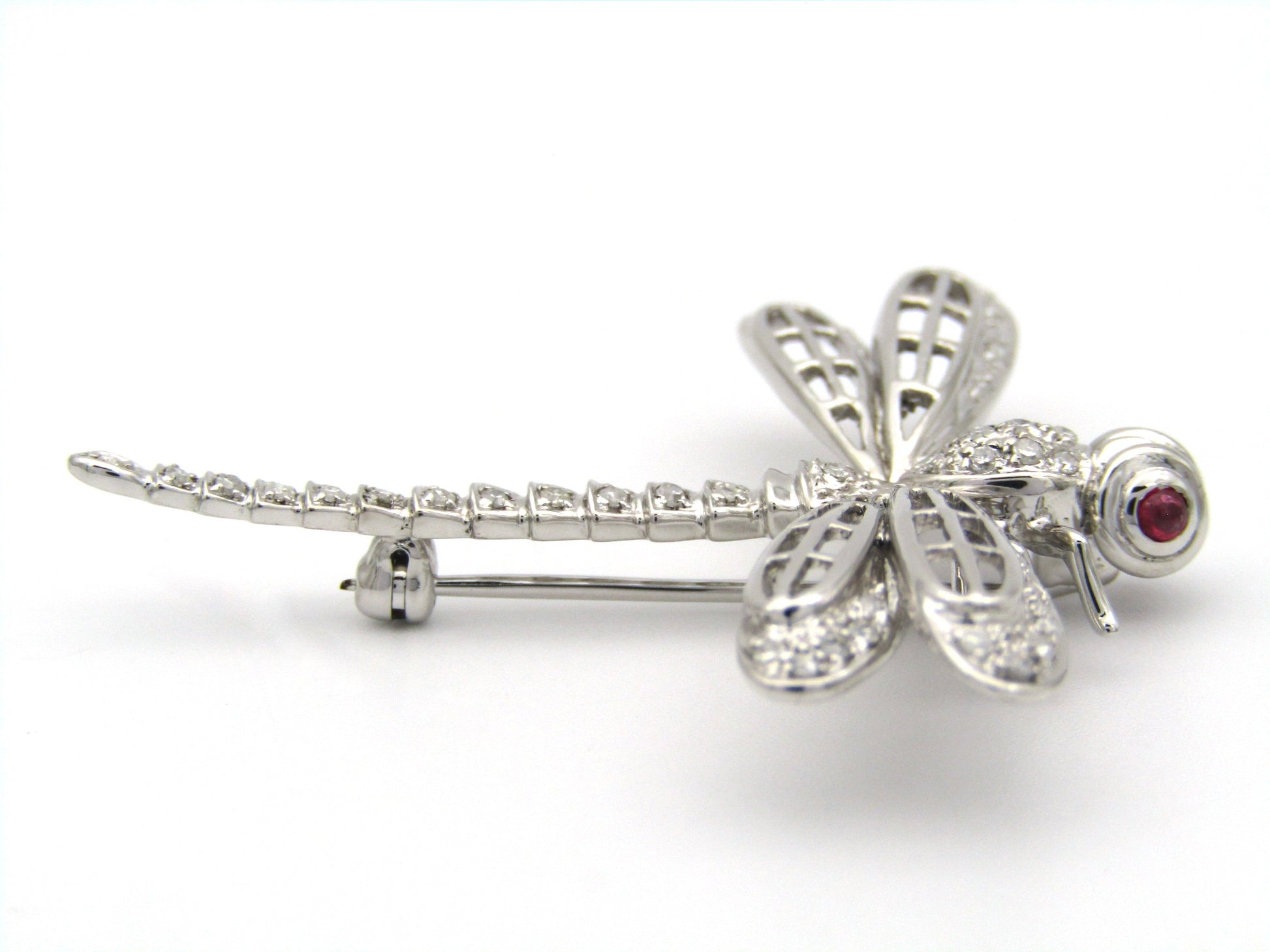 Exceptional flyers, with near 360 degree vision, the dragonfly is a remarkable insect in the animal kingdom who's metamorphosis from water to air is a powerful symbol for profound personal change, shedding old limitations, and embarking on new, vibrant beginnings. In this stunning creation, cranberry-red ruby eyes twinkle in the sun, while a masterfully crafted diamond-set body dazzles the eye. Handcrafted in 14K white gold and made circa 1940's, this marvellous brooch is the perfect companion to your lapel.