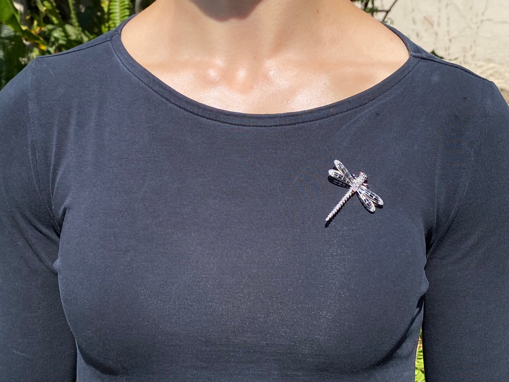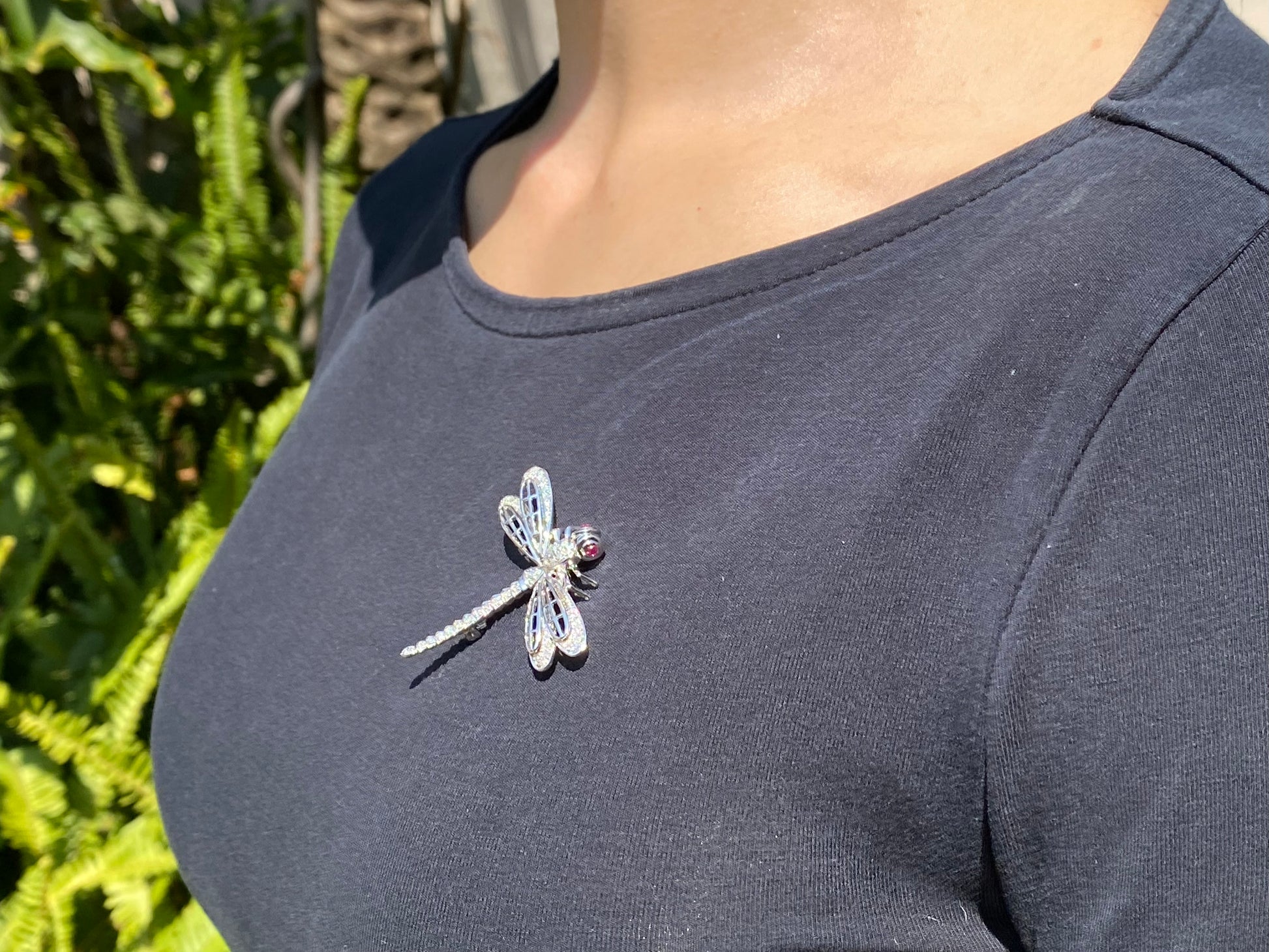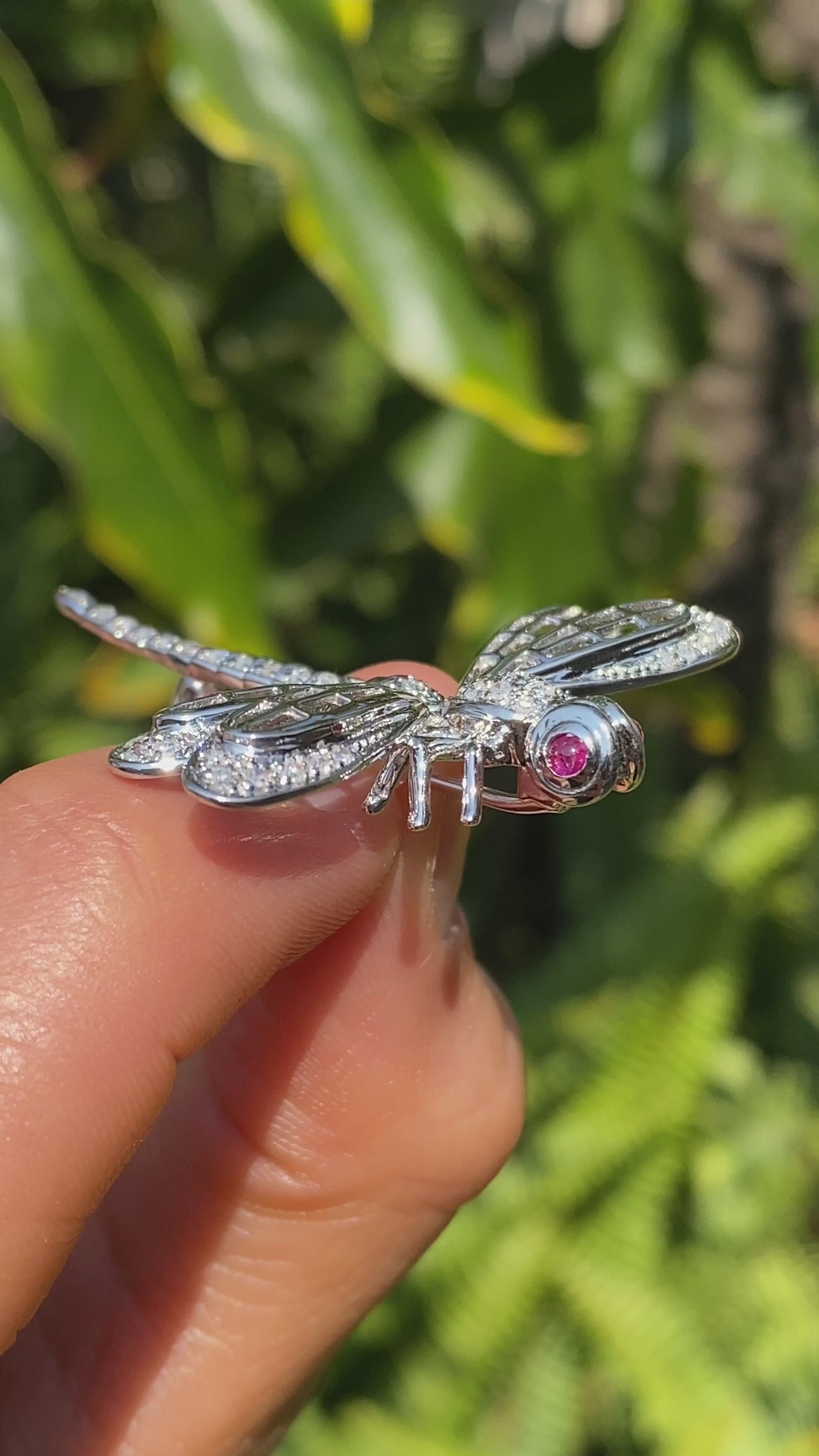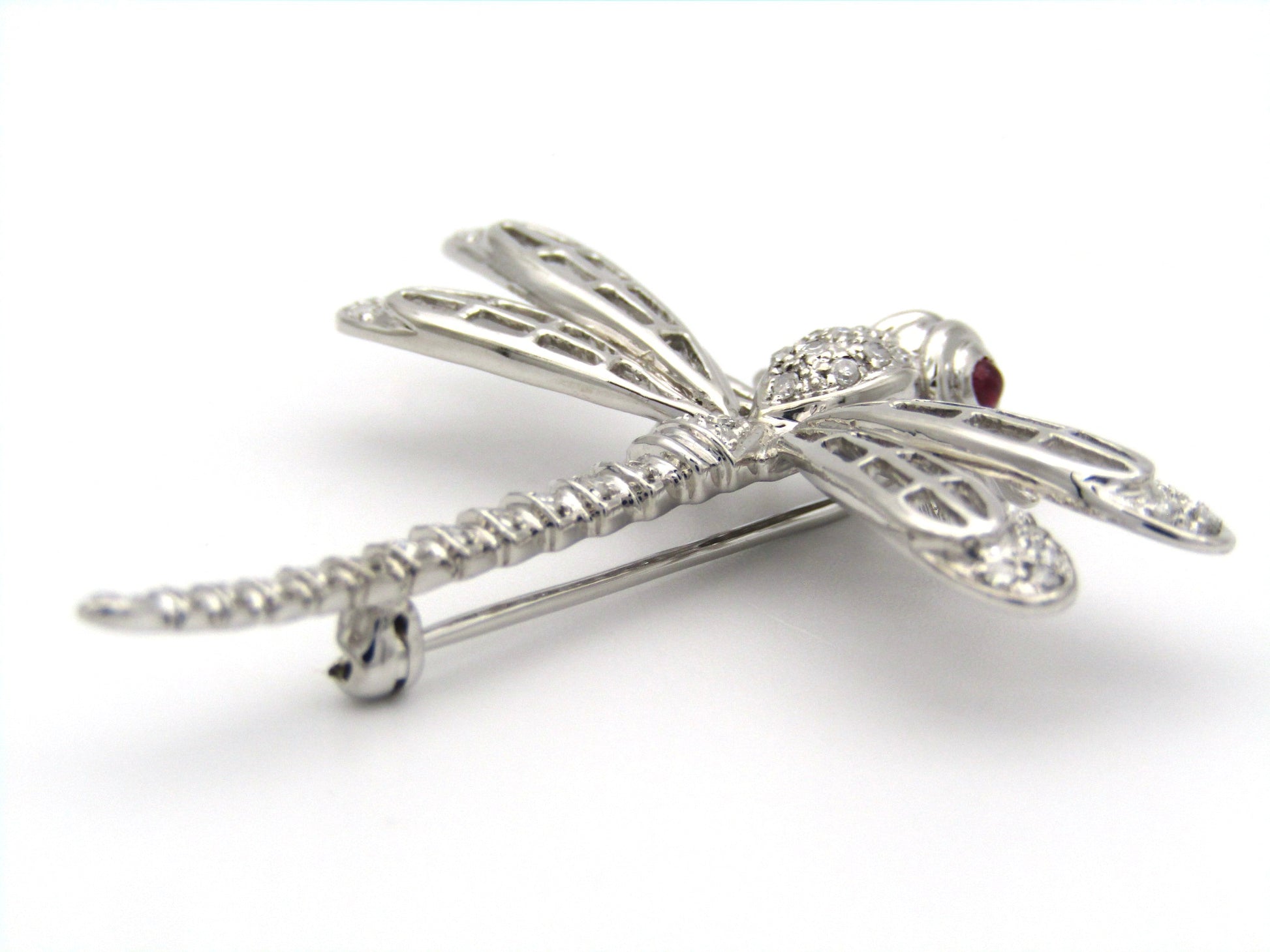 Exceptional flyers, with near 360 degree vision, the dragonfly is a remarkable insect in the animal kingdom who's metamorphosis from water to air is a powerful symbol for profound personal change, shedding old limitations, and embarking on new, vibrant beginnings. In this stunning creation, cranberry-red ruby eyes twinkle in the sun, while a masterfully crafted diamond-set body dazzles the eye. Handcrafted in 14K white gold and made circa 1940's, this marvellous brooch is the perfect companion to your lapel.