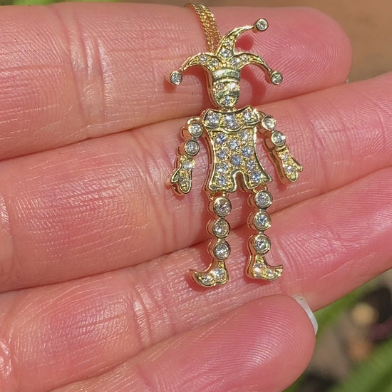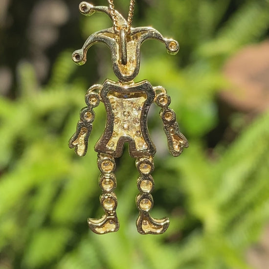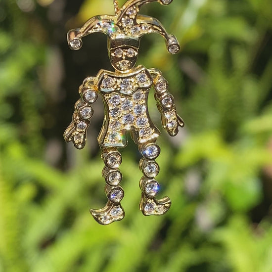 Seriously, this is no laughing matter - who thought it was a good idea to make the fool of the court in the finest 18K gold, encrusted with top quality ice-white diamonds, and be able to move his arms, legs, head, and torso? All to be worn around your neck? This is comedic! Have the joy of wearing such a marvellous creation of what must have been a remarkable jeweller. At social gatherings and dinner conversations you will never be short of a topic, as your very own wearable Jester will be the focal point of the evening. Chain included.