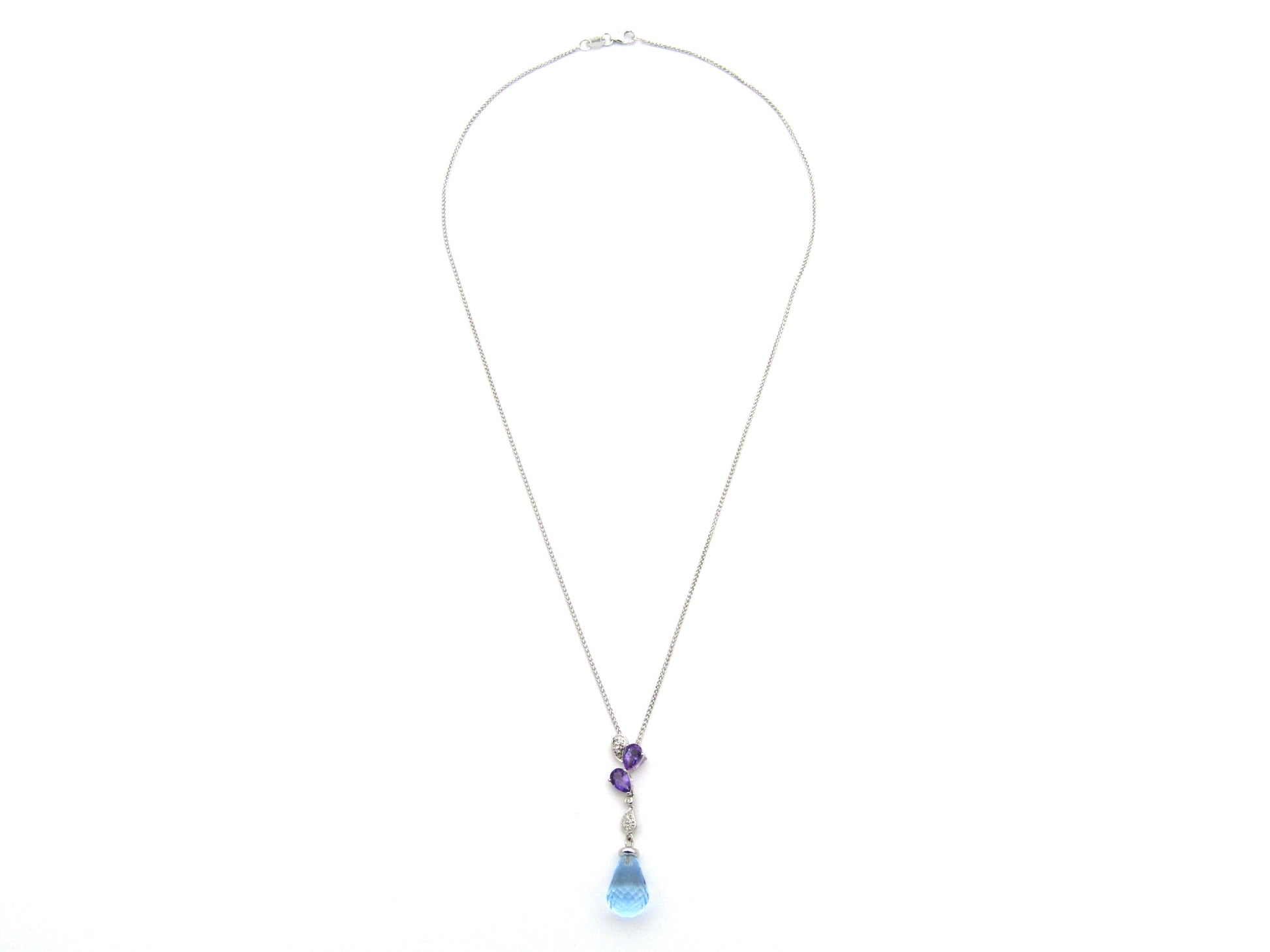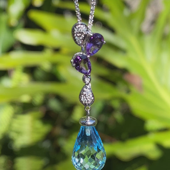 A sky-blue briolette cut blue topaz shimmers and shines while dangling off the end of this lovely pendant. Accented by sparkling diamonds in a droplet design, two grape-coloured pear-shaped amethysts, and another droplet containing diamonds, this magnificent jewel was made in 18K white gold by Jack Friedman.