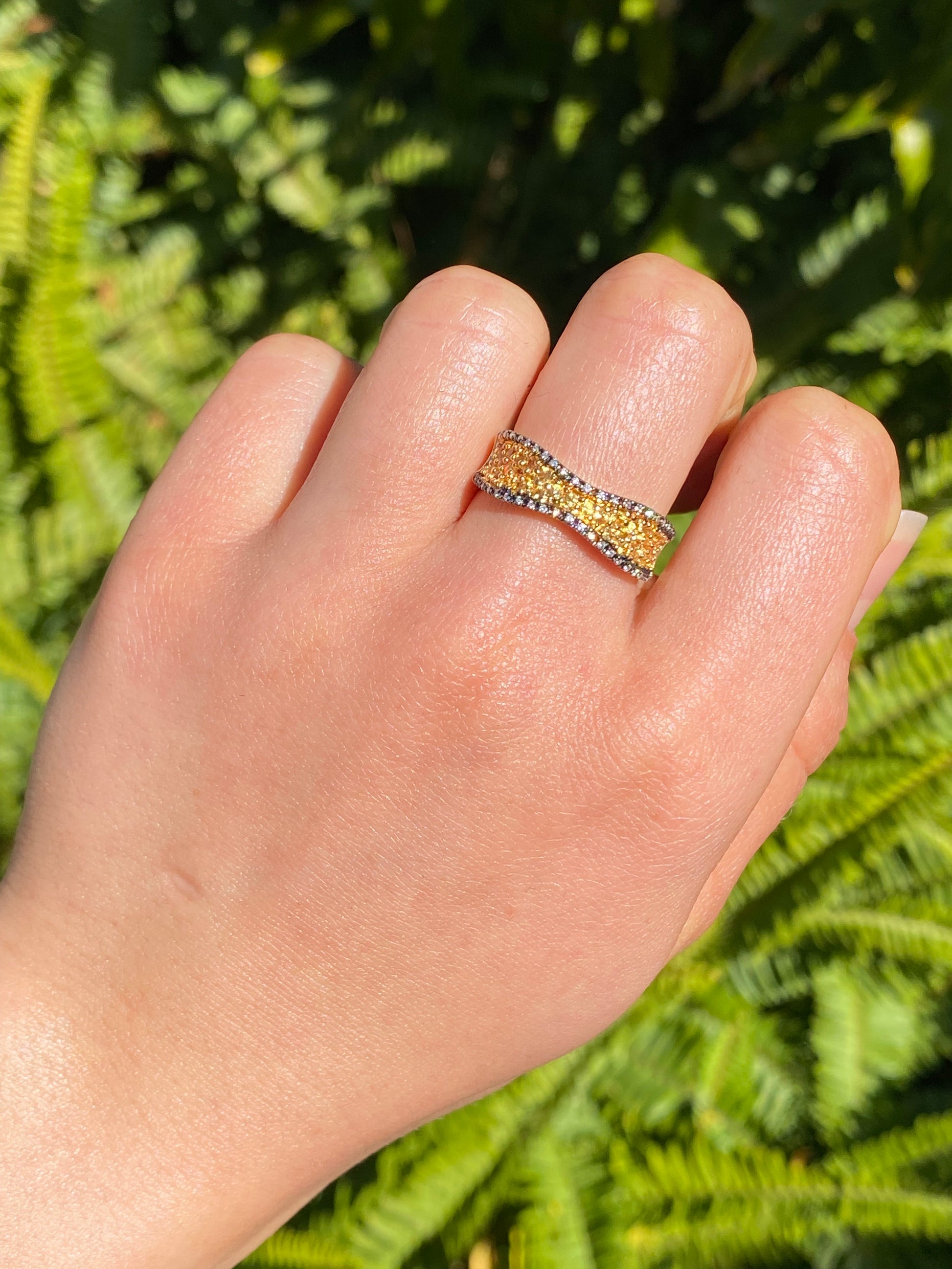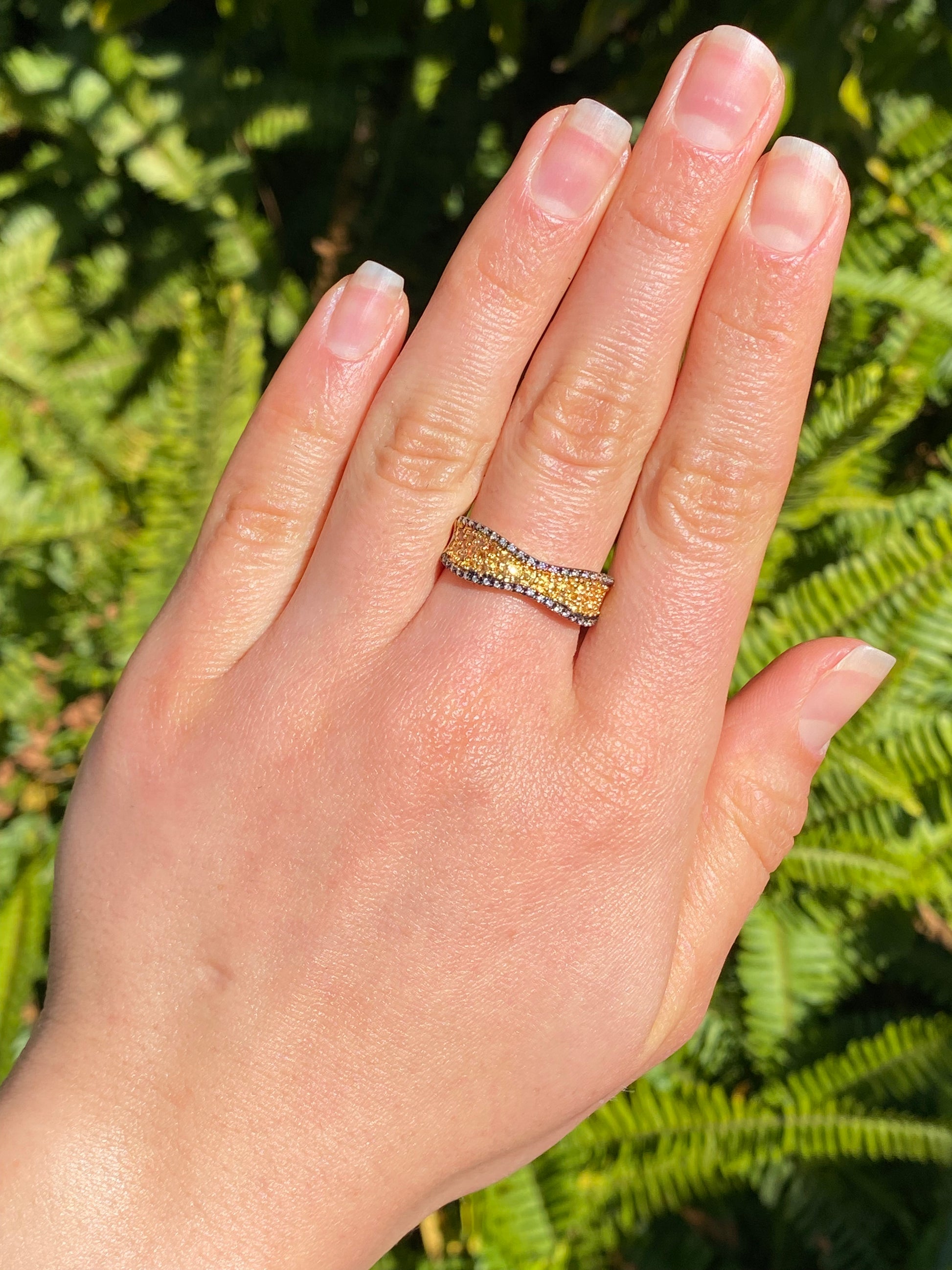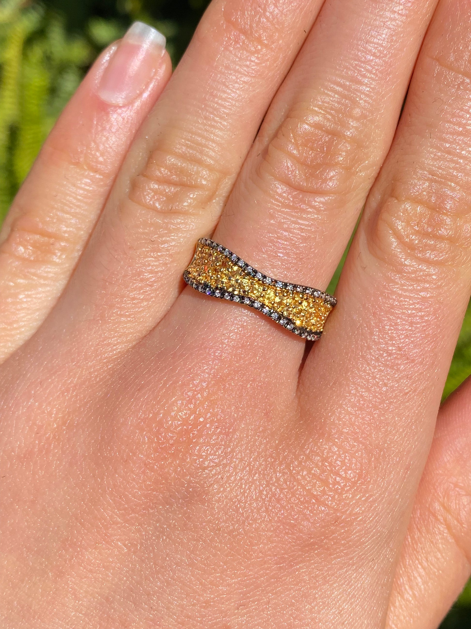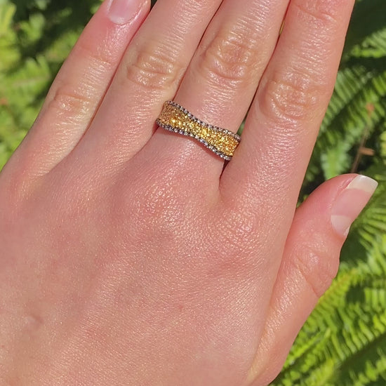 A change from the ordinary - yellow diamonds sparkle across the centre of your finger in their bright yellow gold setting. Designed to be wider at the ends, and narrower in the centre, this striking ring incorporates some black rhodium plating edges set with colourless diamonds in stark contrast to their background. A unique and striking ring for sure! Designed by Jack Friedman.
