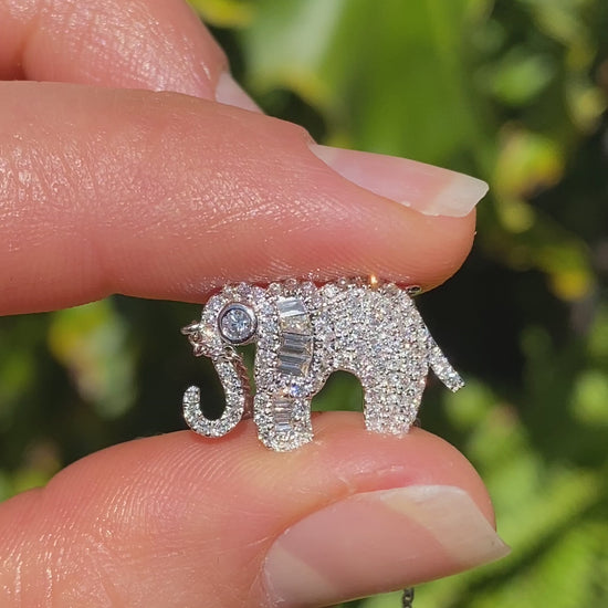 The largest land mammal with a trunk for hands, thick skinned, incredibly intelligent, and of course vegetarians - the Ellie is a special part of the Big Five. Fully decked out in diamonds, the appreciation for elephants are clearly seen in this master crafted pendant. With beautiful claw-set diamonds from trunk to tail, baguette diamonds in the large floppy ear, and a single bezel-set larger round brilliant cut diamond for the eye. This magnificent necklace has been crafted in gleaming 18K white gold by Jack Friedman.