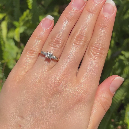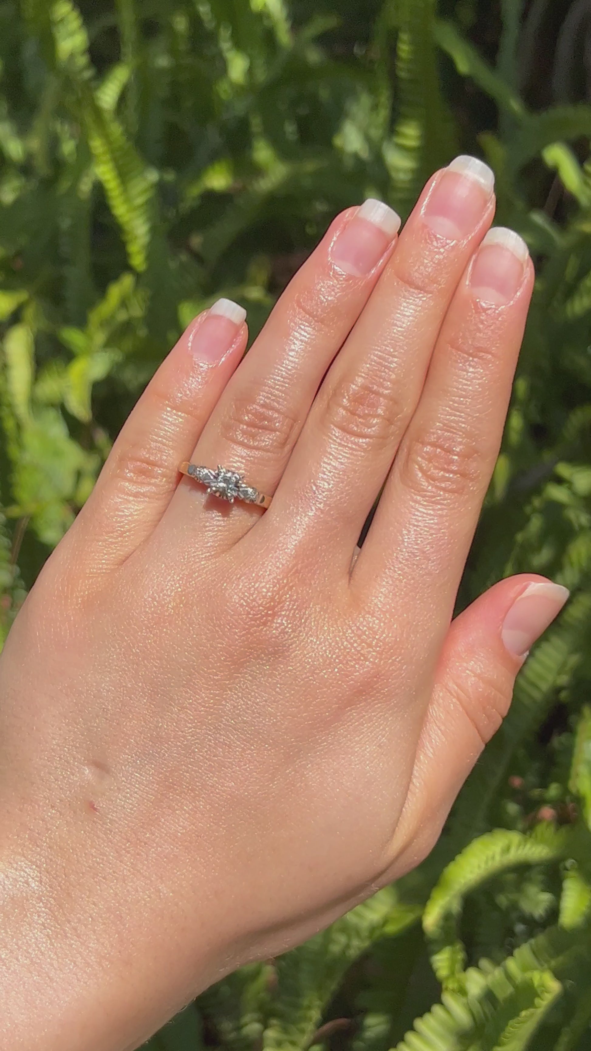 Steeped in vintage charm, this elegant ring is a treasure from Birmingham, crafted in 1989 with timeless artistry. The band of warm 18K rose gold flows gracefully into a white gold setting, where a brilliant diamond takes center stage, flanked by two delicate accents that shimmer with quiet grace.