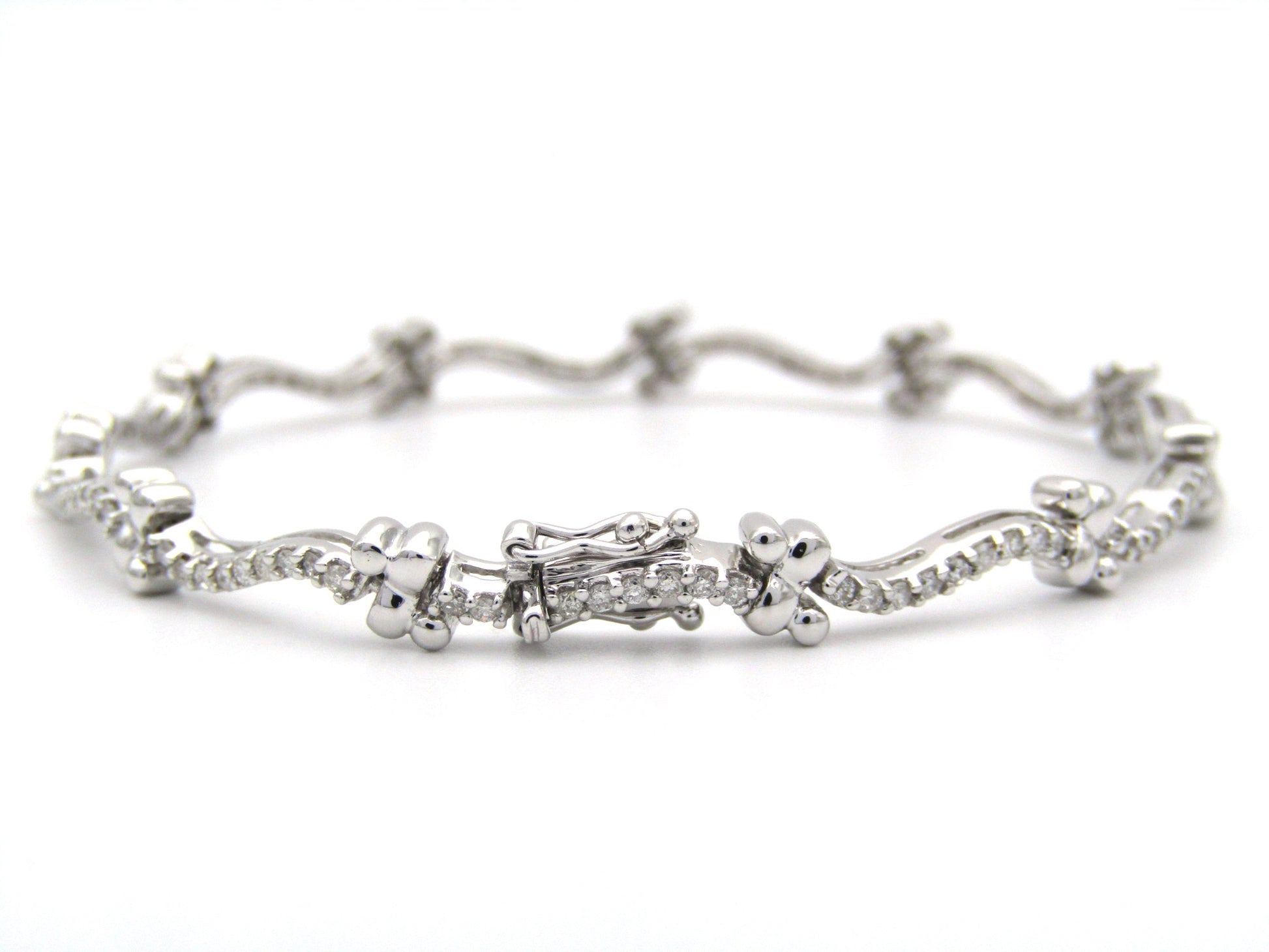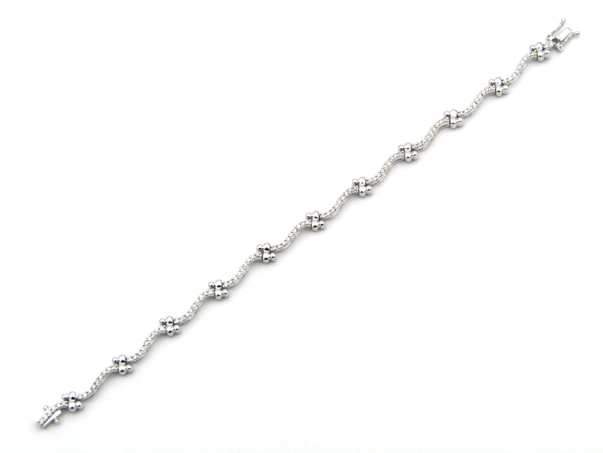 This graceful bracelet captures timeless beauty with a touch of contemporary flair. Crafted in 18K white gold, it features a flowing wave design accented by sparkly brilliant round-cut diamonds, each set along the gentle curves to create a continuous shimmer. The wave-shaped links are connected by elegant floral-inspired clusters, adding texture and charm to the piece. The bracelet offers a perfect balance of sophistication and sparkle — ideal for both everyday wear and special occasions. A secure box clasp with safety latch ensures comfort and confidence in wear.