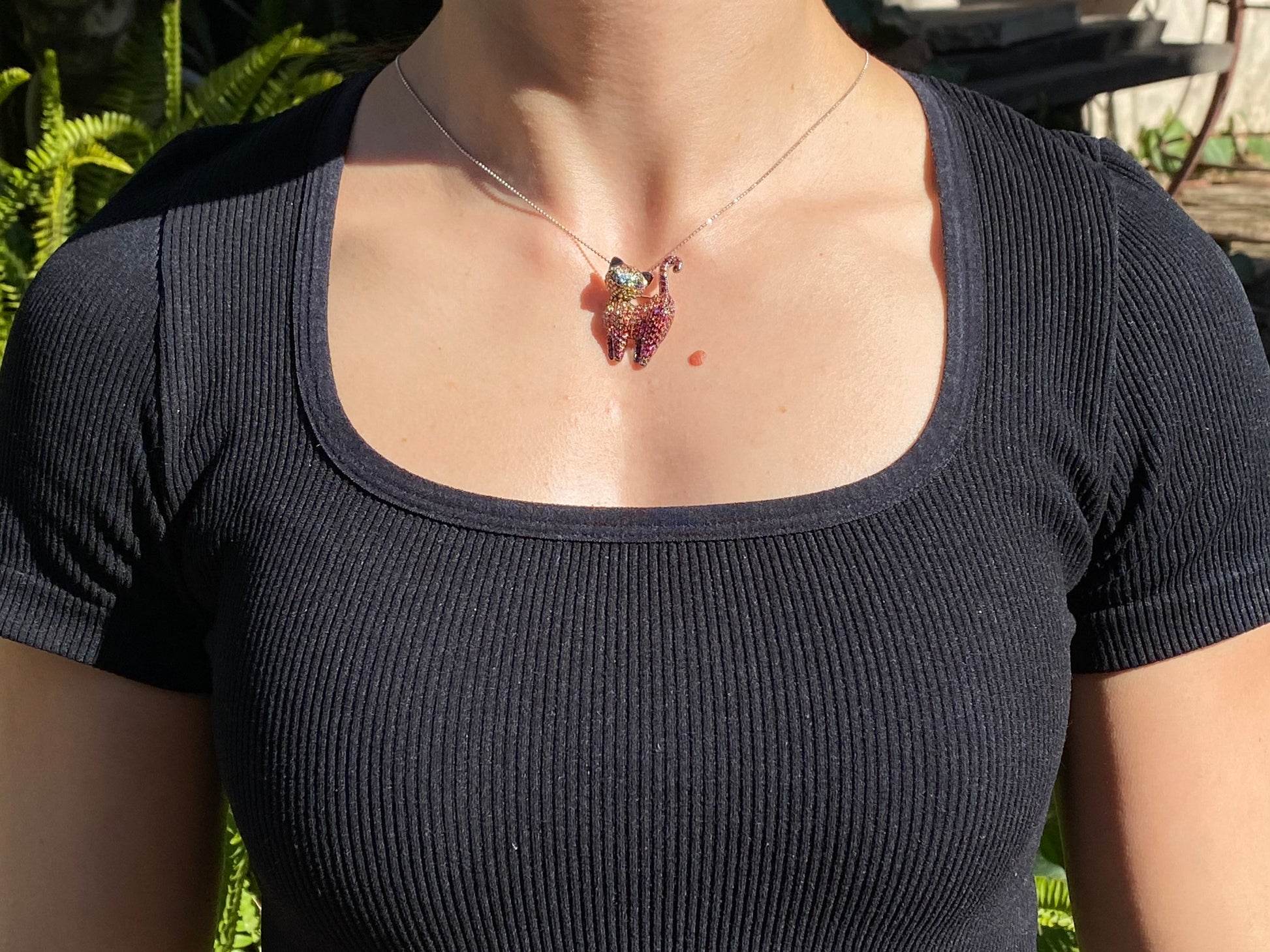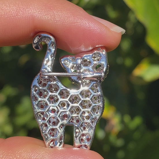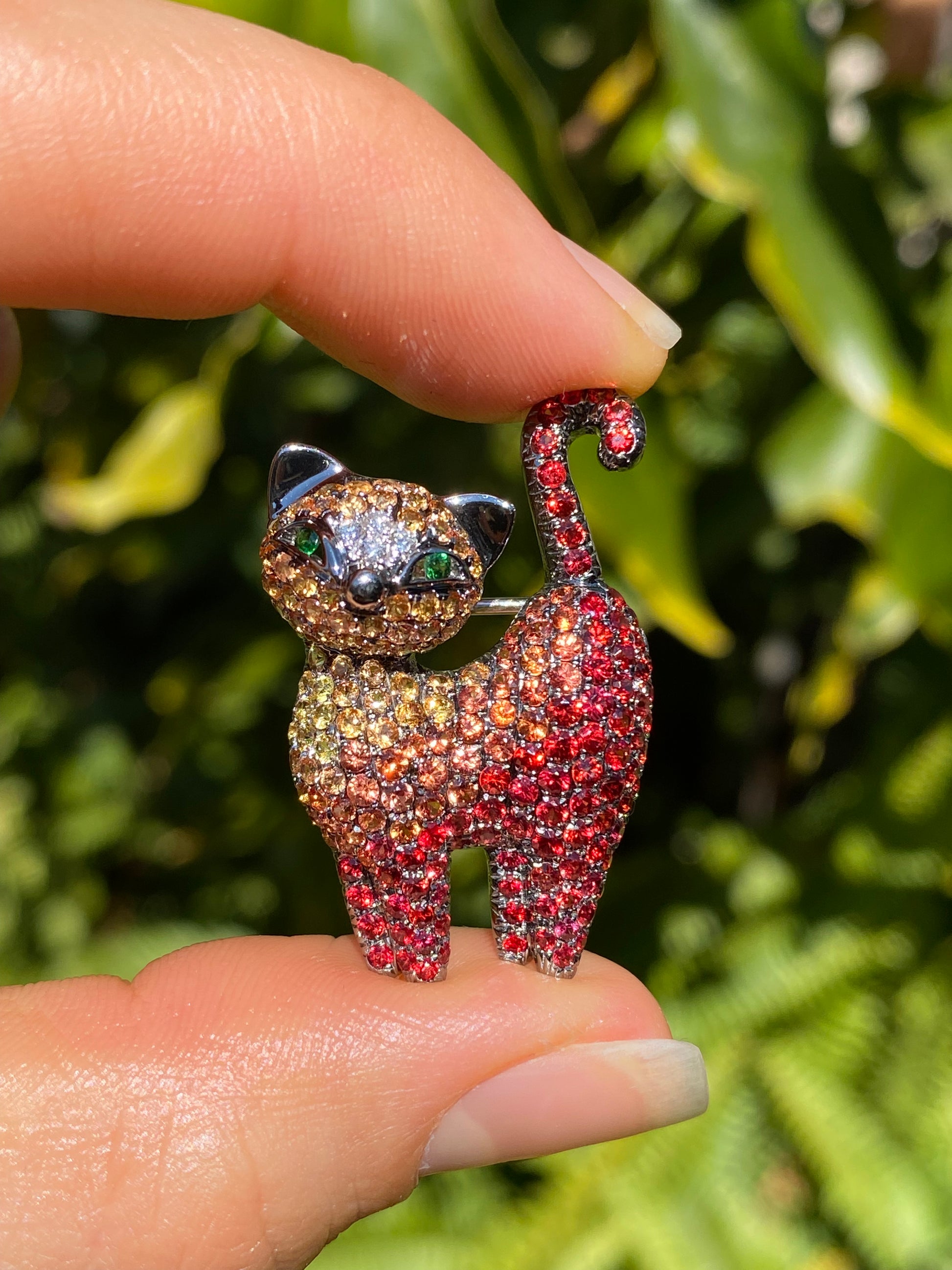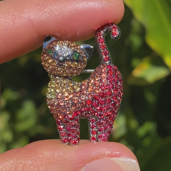 Mee-Wow! What a magnificent piece of jewellery! A sleek fancy sapphire-set body sparkling in hues from deep orange to bright yellow, a bright white diamond-set patch on its forehead, and bright green eyes like a lush Scottish forest. If this wasn't enough, the front has been black rhodium plated to show off the feline's strikingly beautiful body colours. The back of the kitty has been made with punched hexagonal shapes and can be worn as either a pendant or a brooch whatever the occasion should call for. Made By Jack Friedman. (Chain is excluded and is used for illustrative purposes only).