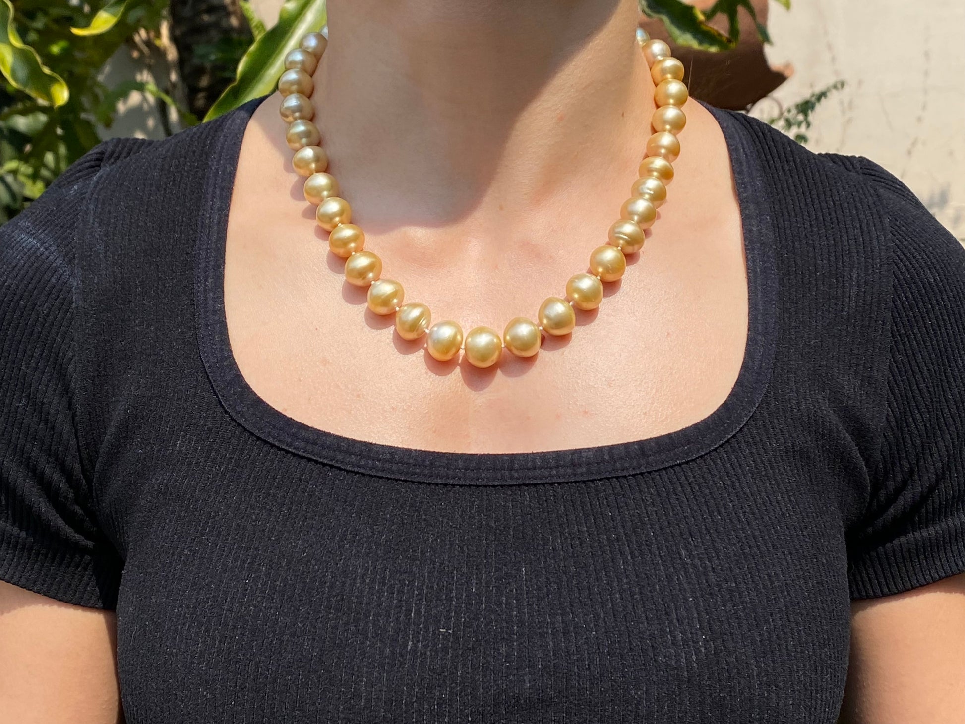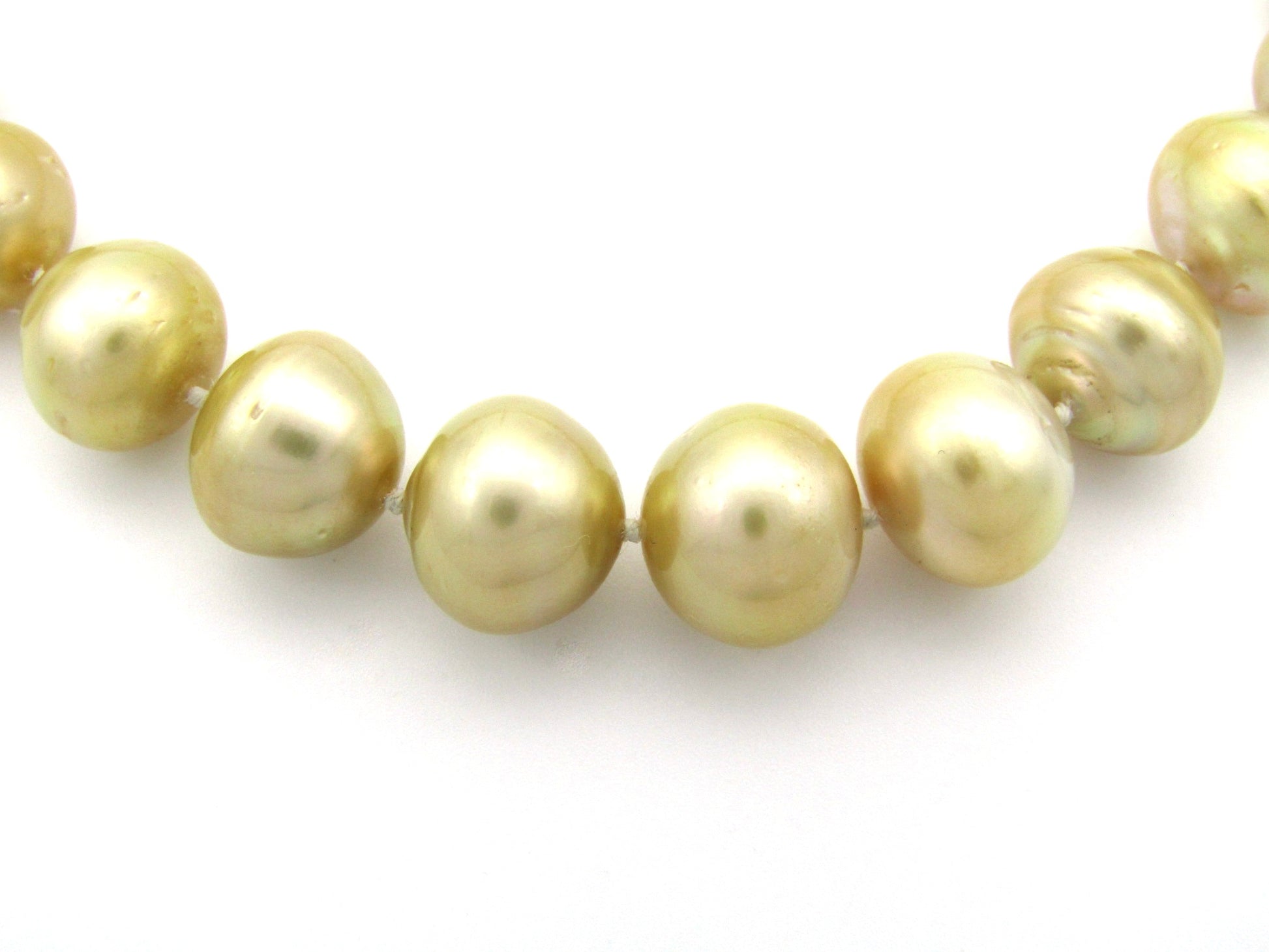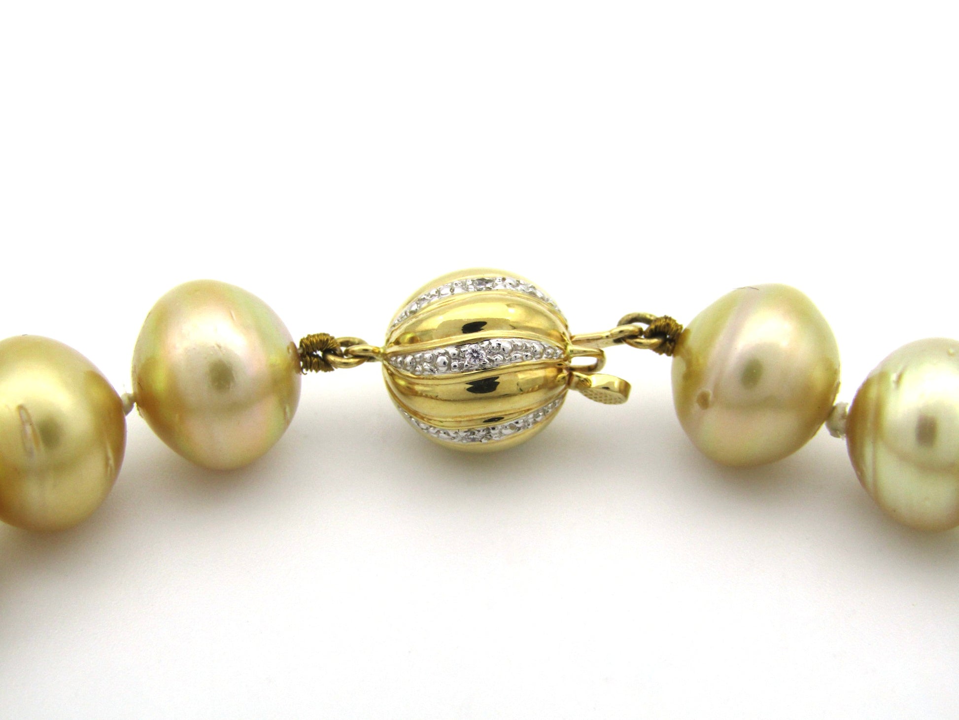 Give off a golden glow while wearing this striking pearl necklace. Striking golden-coloured freshwater pearls give off a soft glow around your neck. This beautiful strand is fastened at the back with an 18K yellow and white gold clasp set with eight small diamonds. Made by Jack Friedman.