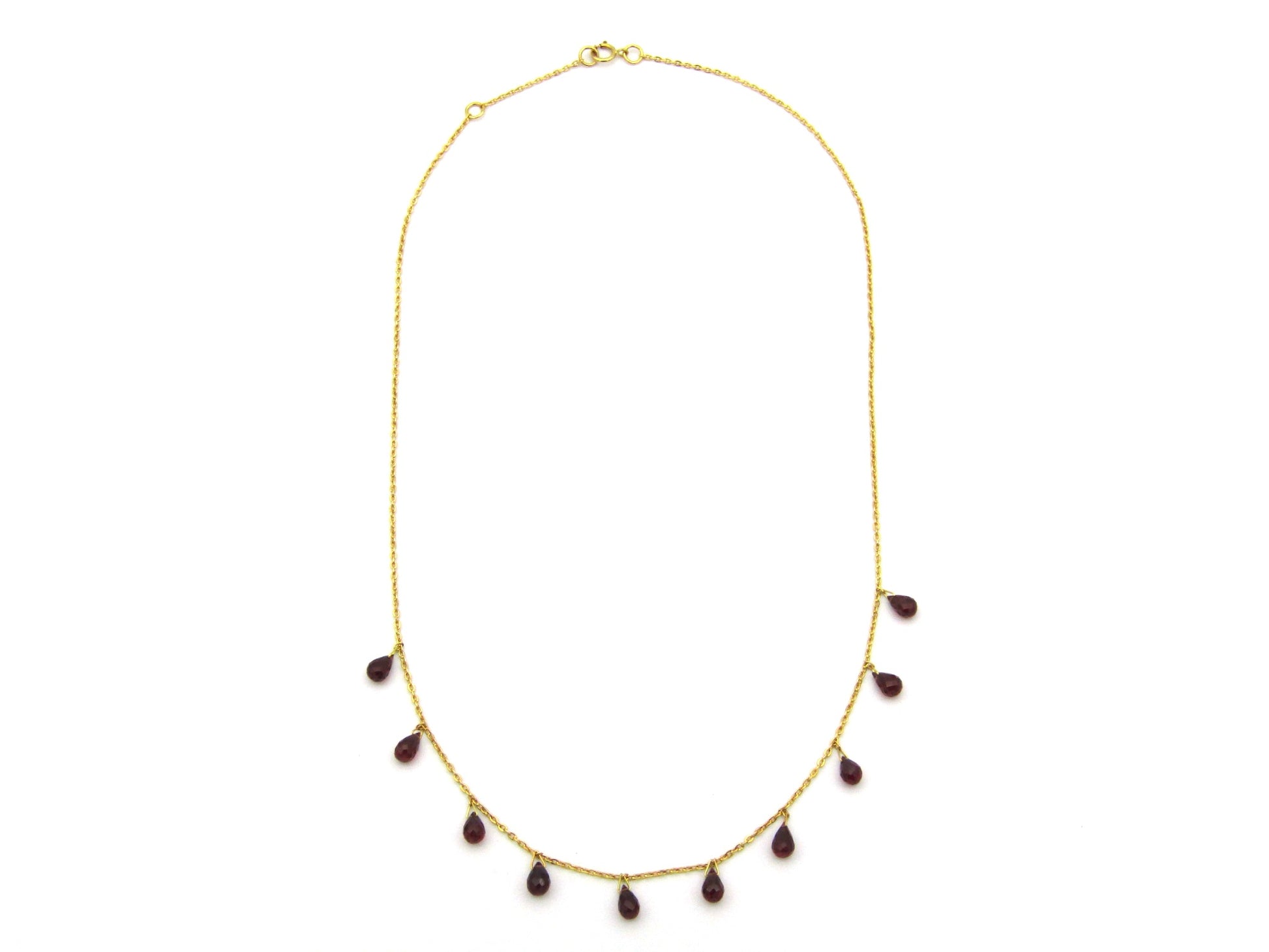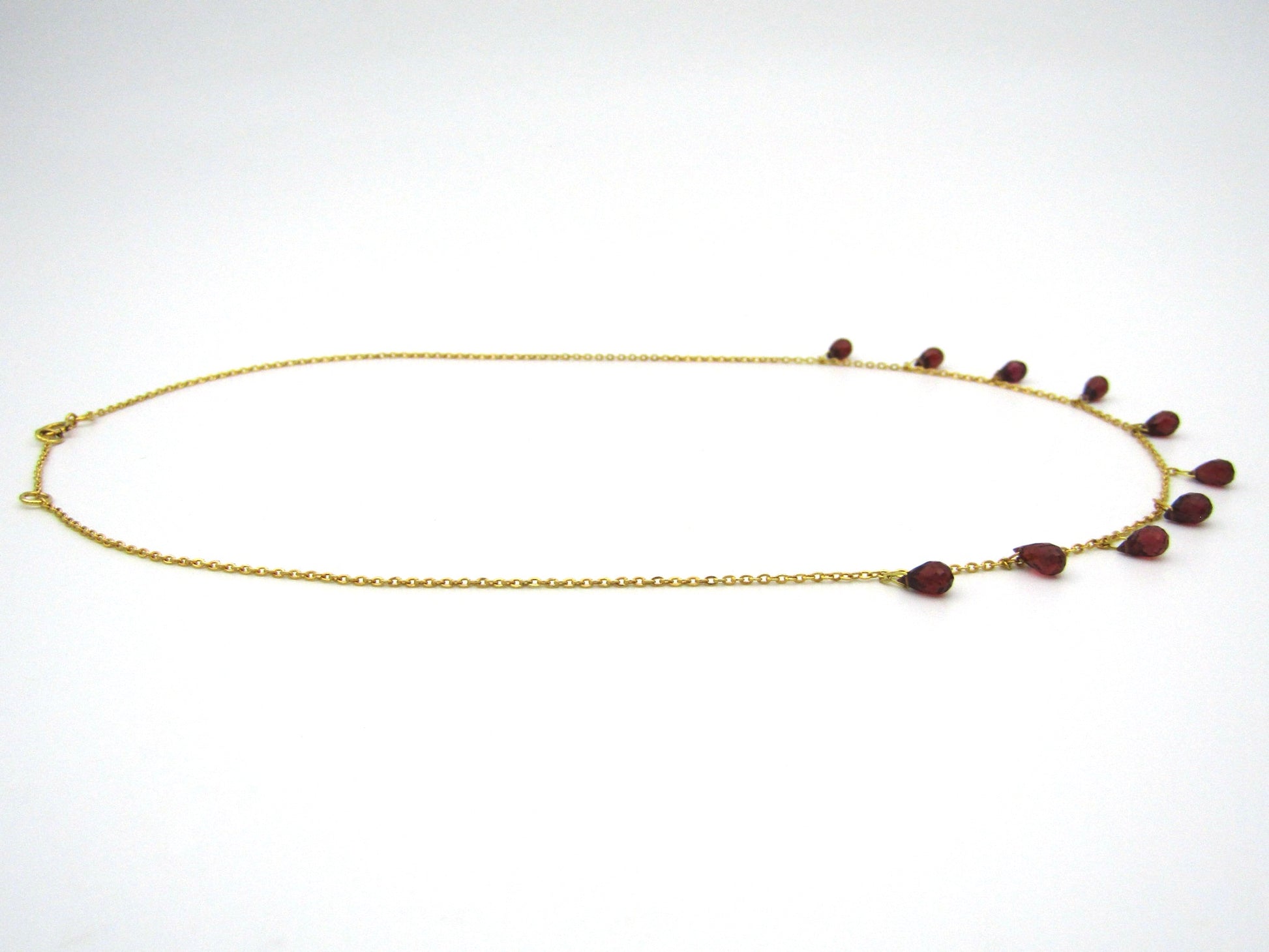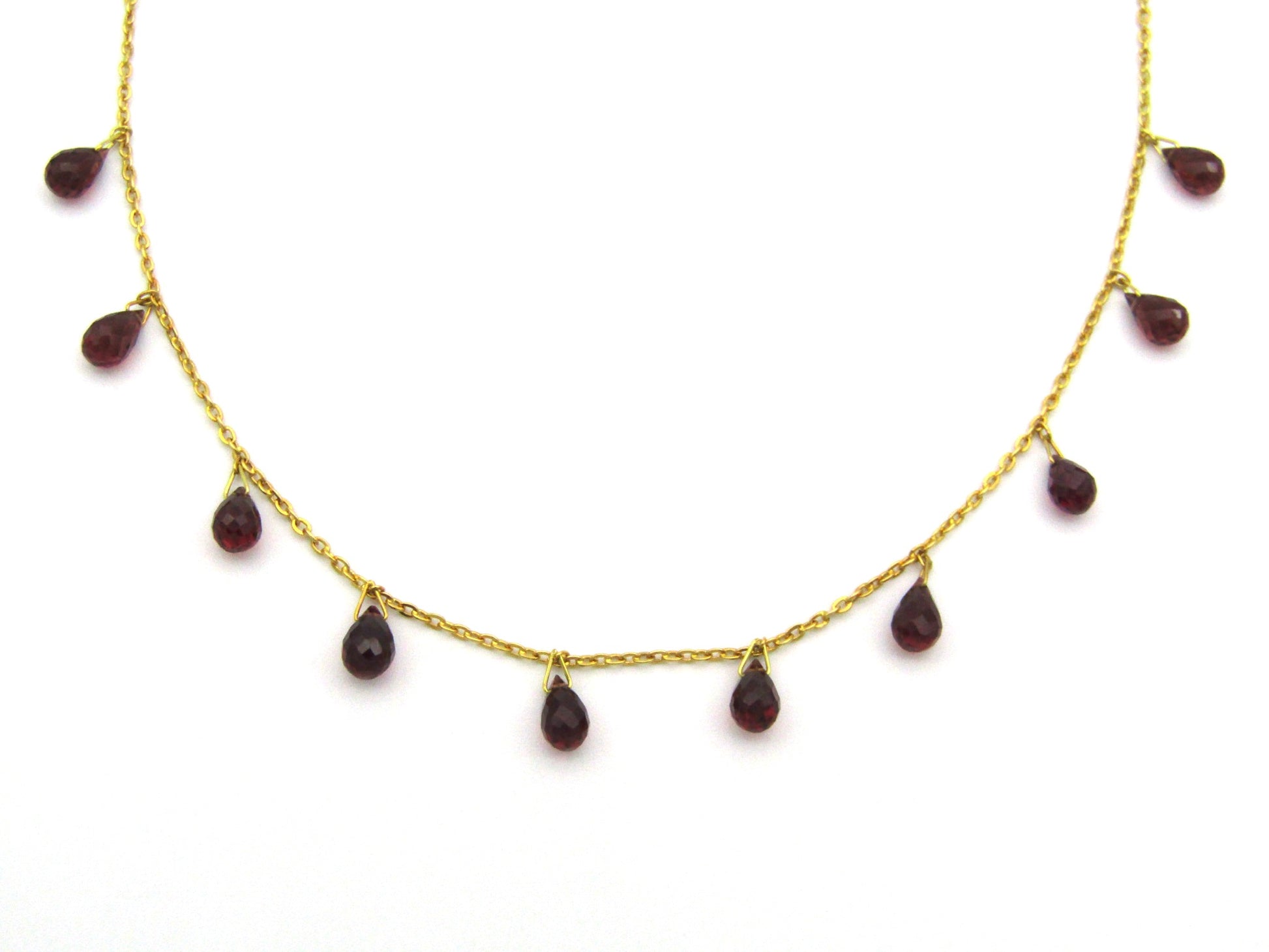 Ten luscious plum-coloured briolette-cut garnets hang prettily from a fine 18K yellow gold chain that drapes around your neck in elegant splendour. Made by David Spilkin.