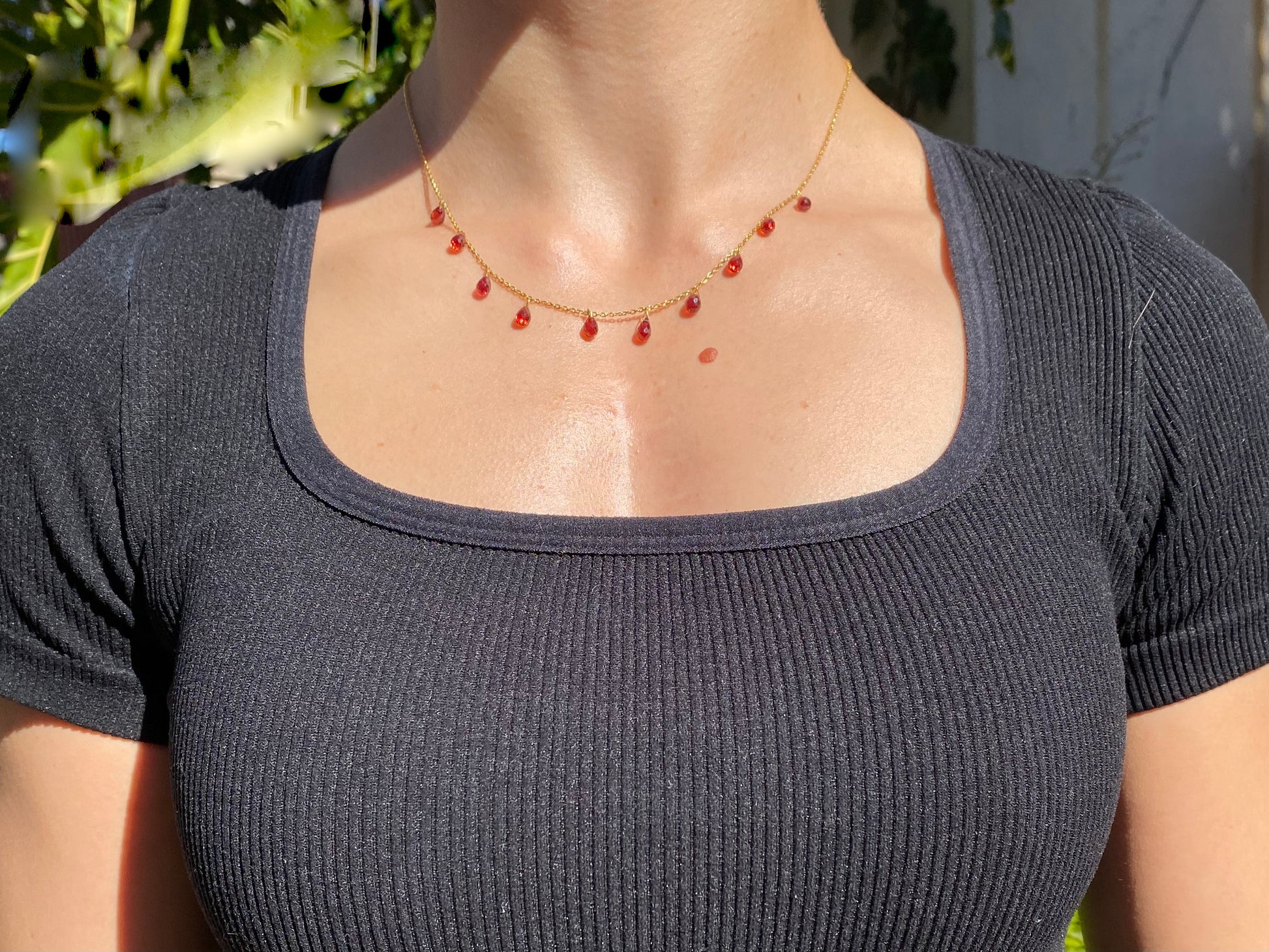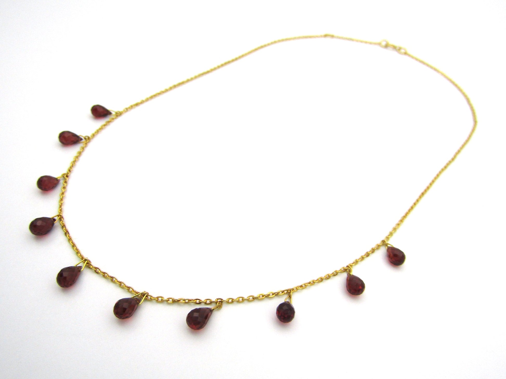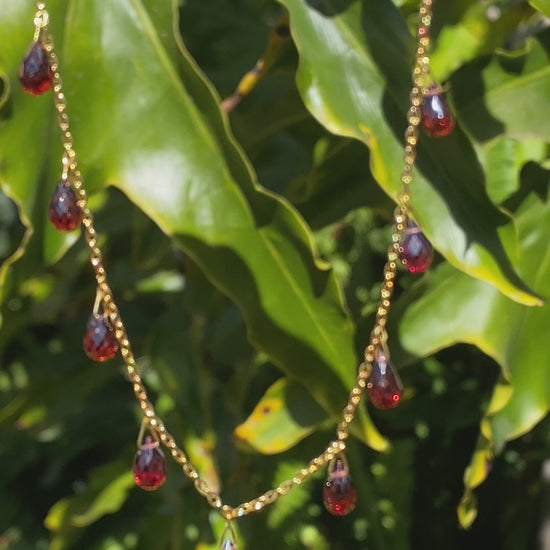 Ten luscious plum-coloured briolette-cut garnets hang prettily from a fine 18K yellow gold chain that drapes around your neck in elegant splendour. Made by David Spilkin.