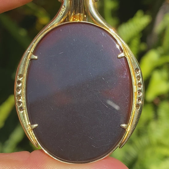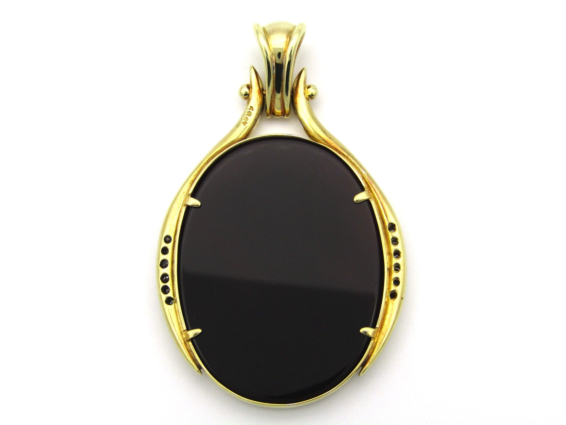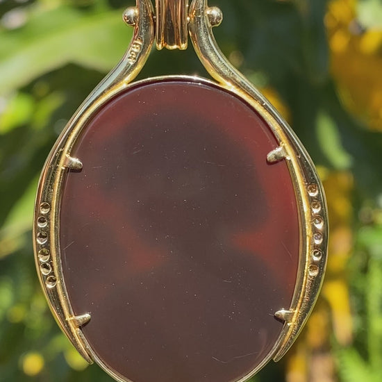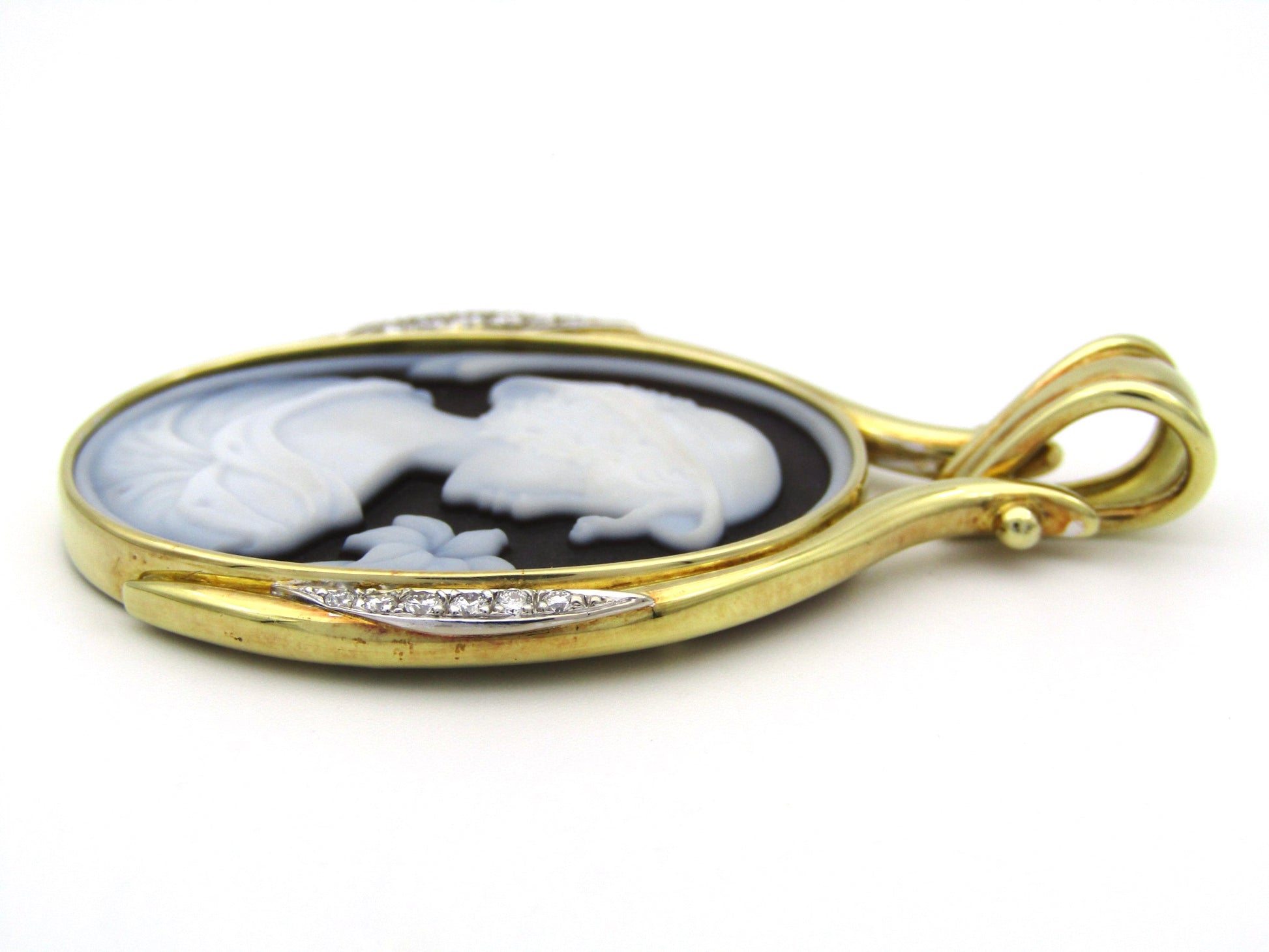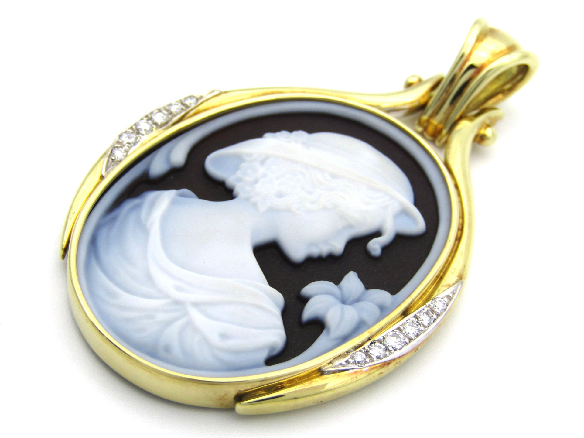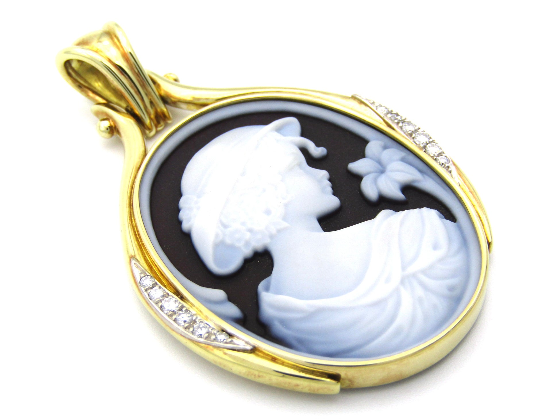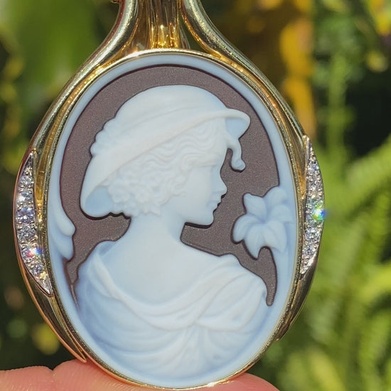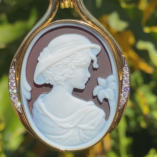 Meticulously carved from sardonyx, a beautiful young lady is shown in profile - her flowing locks held in place by flowers braided into them, a silky robe is her attire and has slid off slightly revealing a delicate shoulder. An Art Deco hat is on her head to protect her soft skin from the harsh sun. She is enveloped by a trumped shaped flower. The dark background adds mystery to the young lady and adds to he innocence. This magnificent carving has been set in brightly polished 18K yellow gold and is accented on either side by six diamonds sparkling brightly in a 18K white gold setting. Made by David Spilkin. (Chain is excluded and is used for illustrative purposes only).
