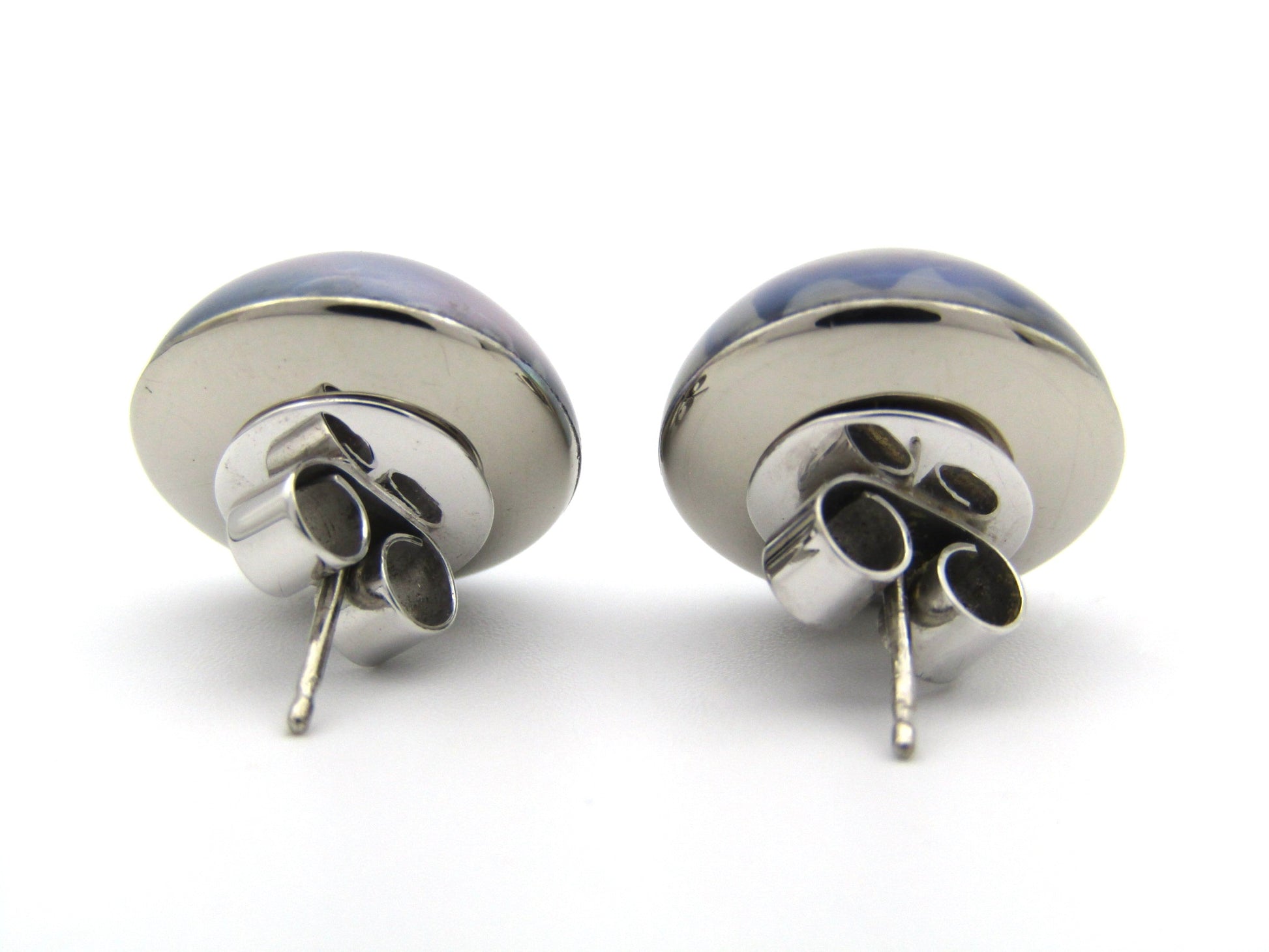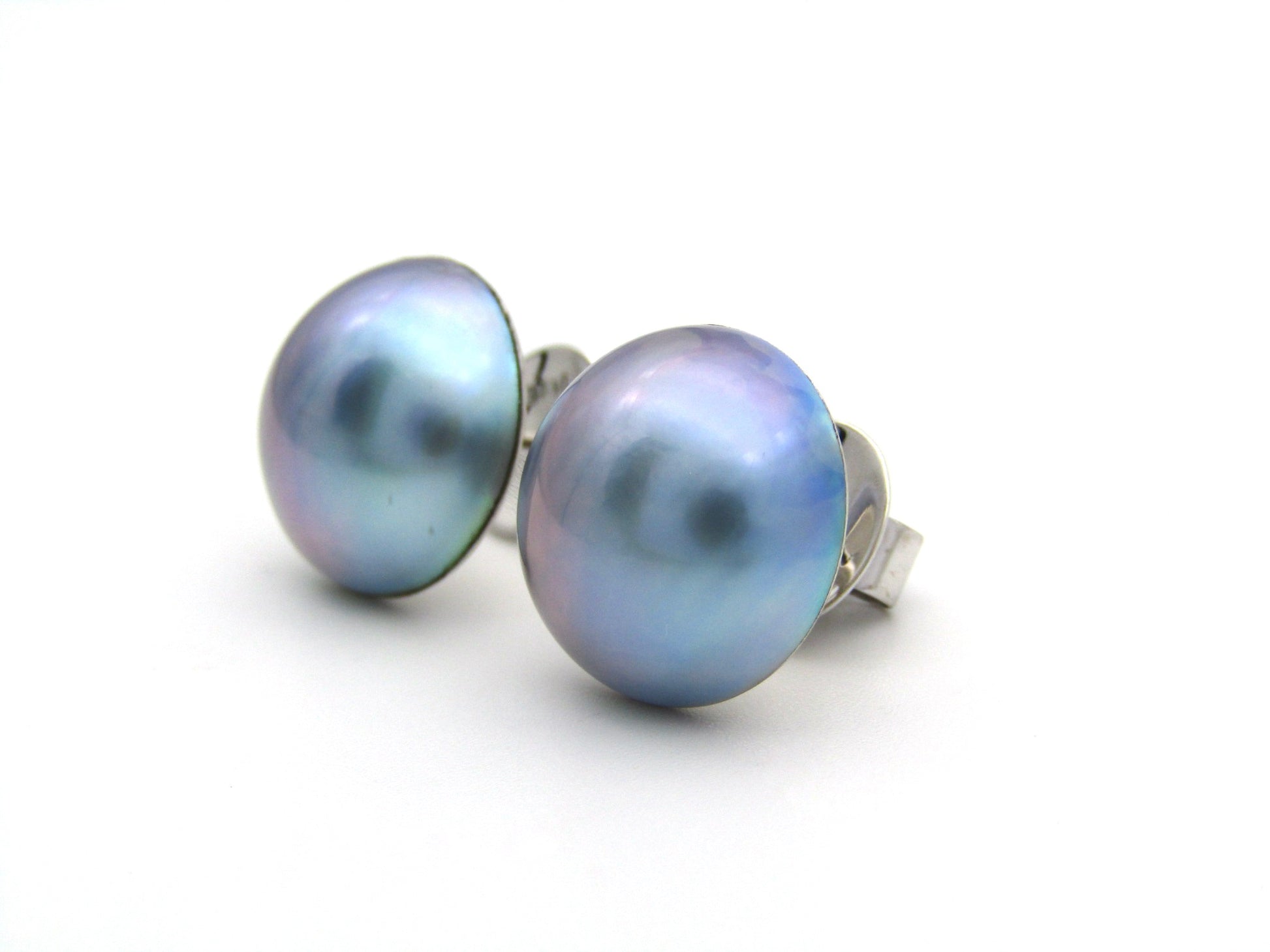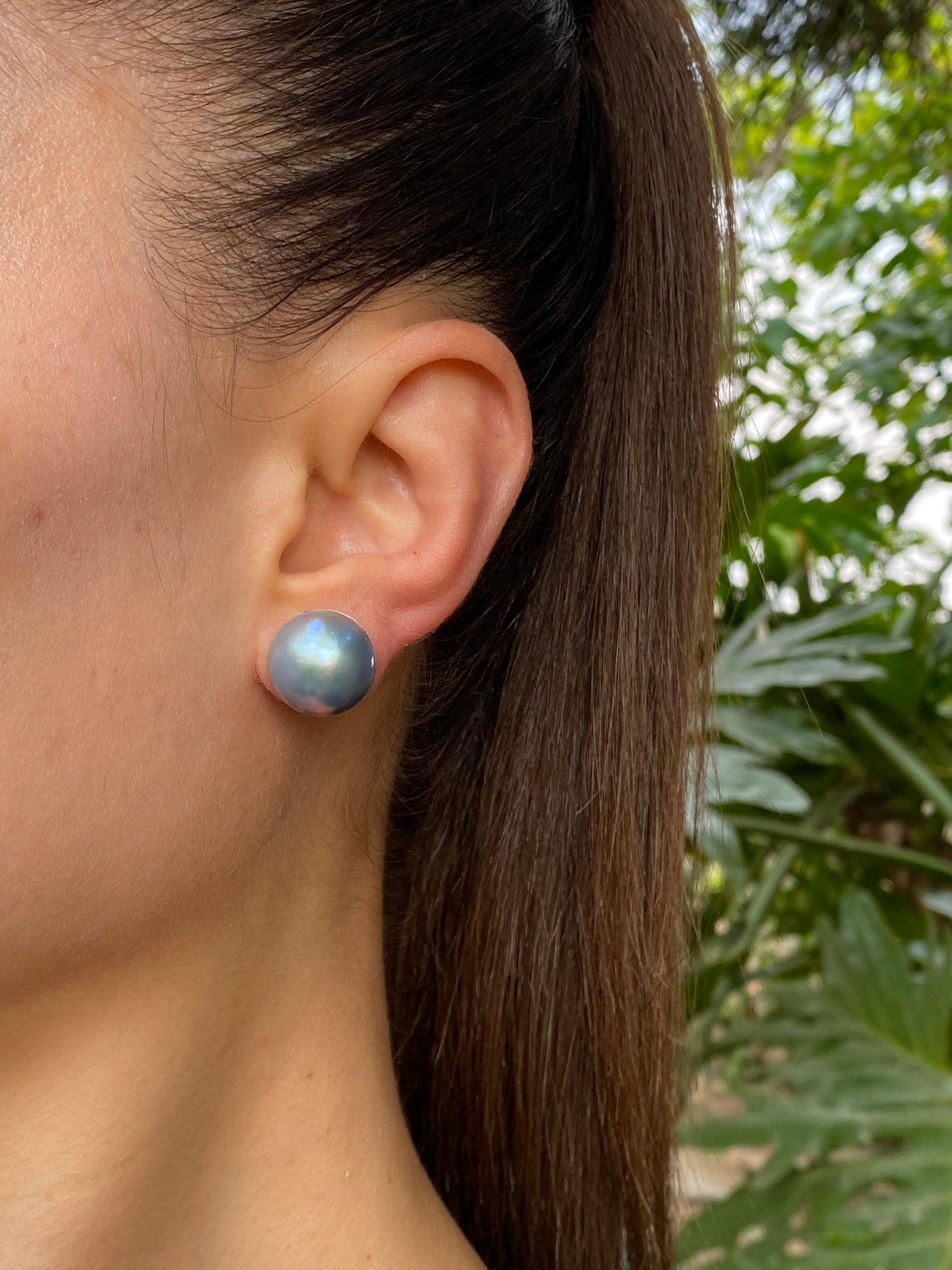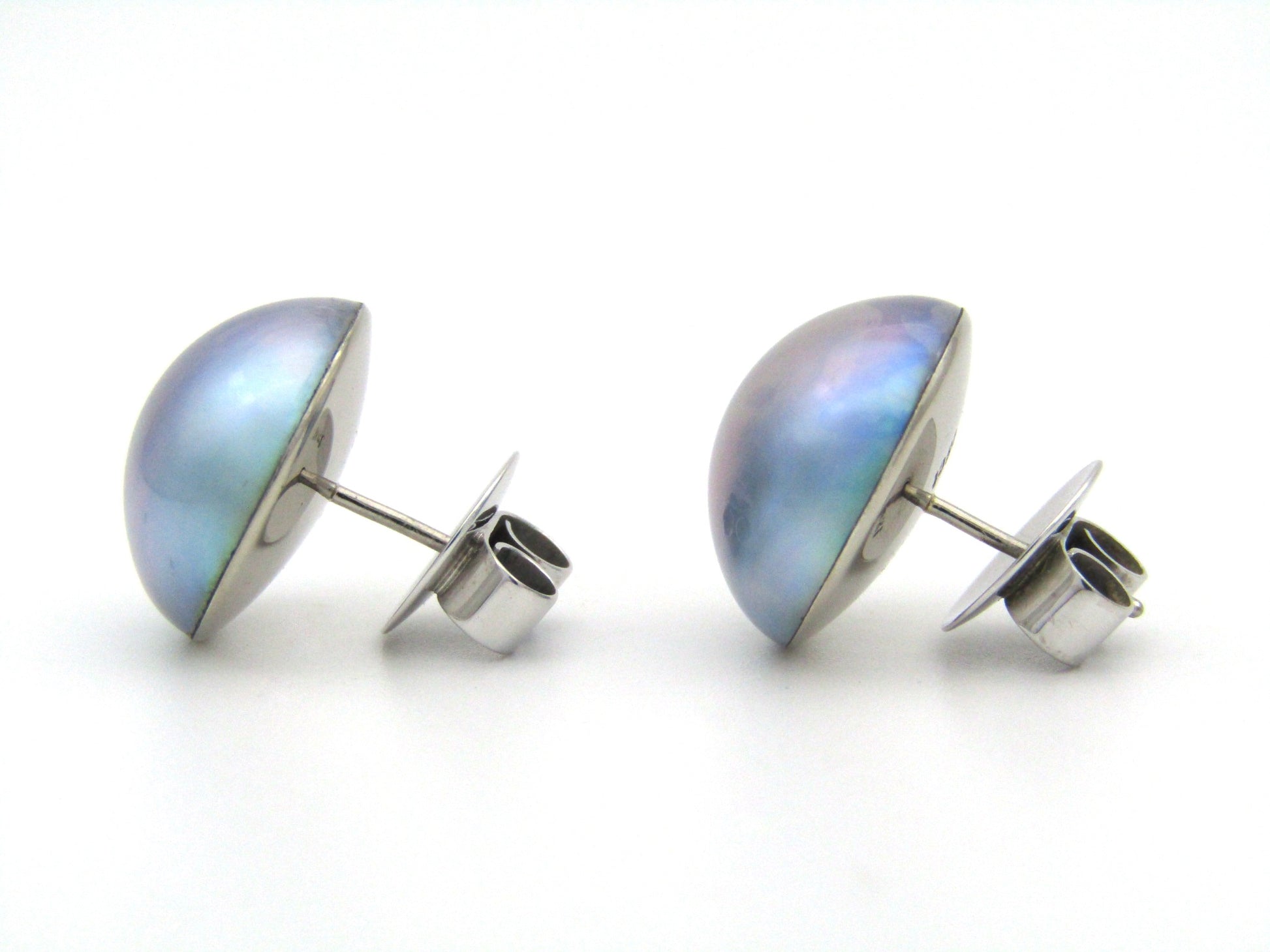 A simple, elegant design with soft, lilac-blue mabé pearls giving off a cool glow. The minimalistic design of these earrings says class and style like no other. Set in polished 18K white gold.