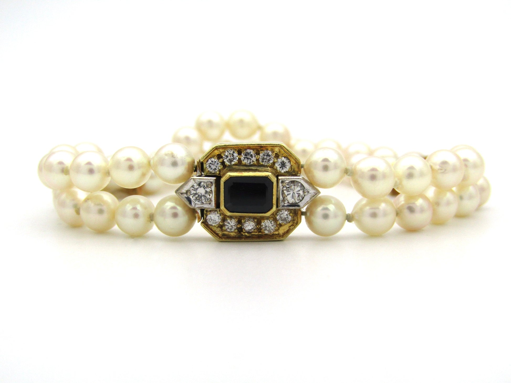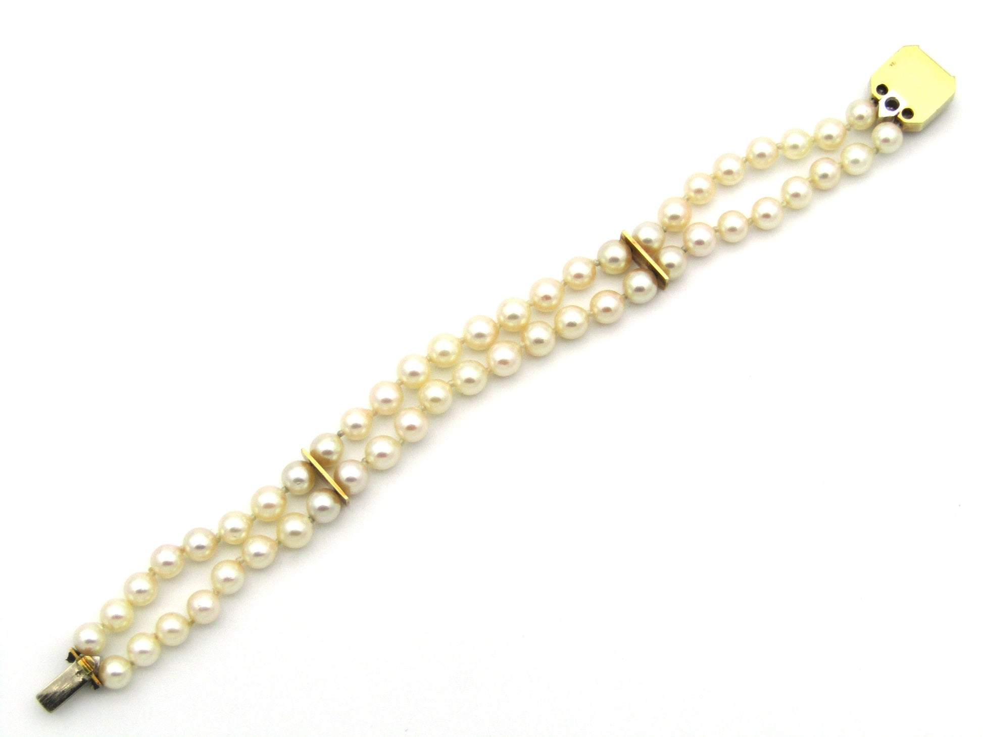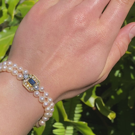 18K gold sapphire and diamond double strand Akoya cultured pearl bracelet, circa 1970's.