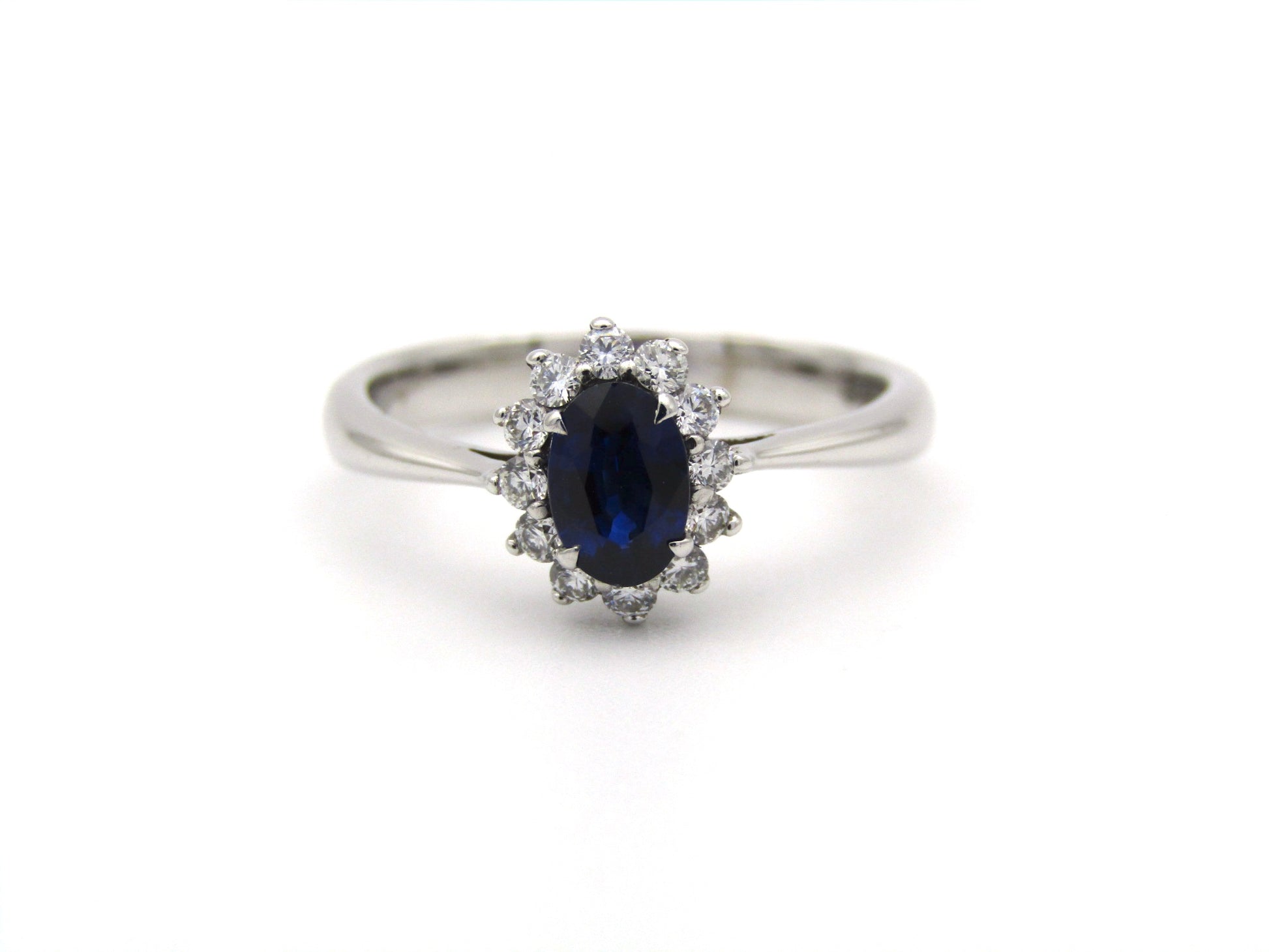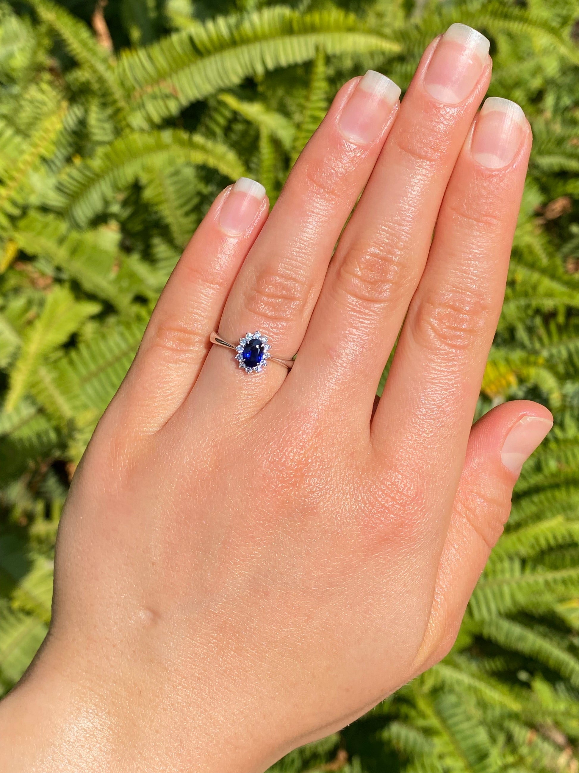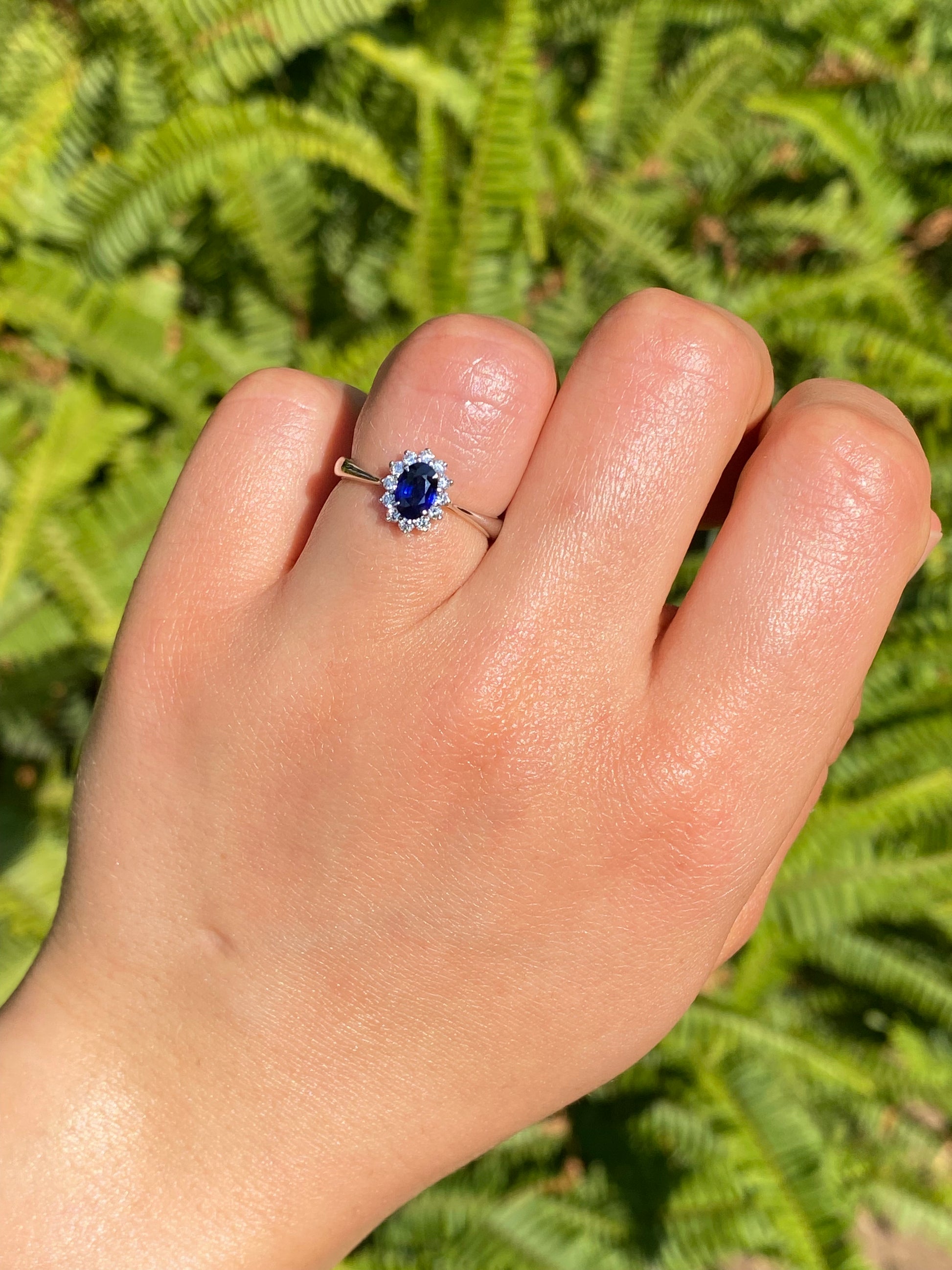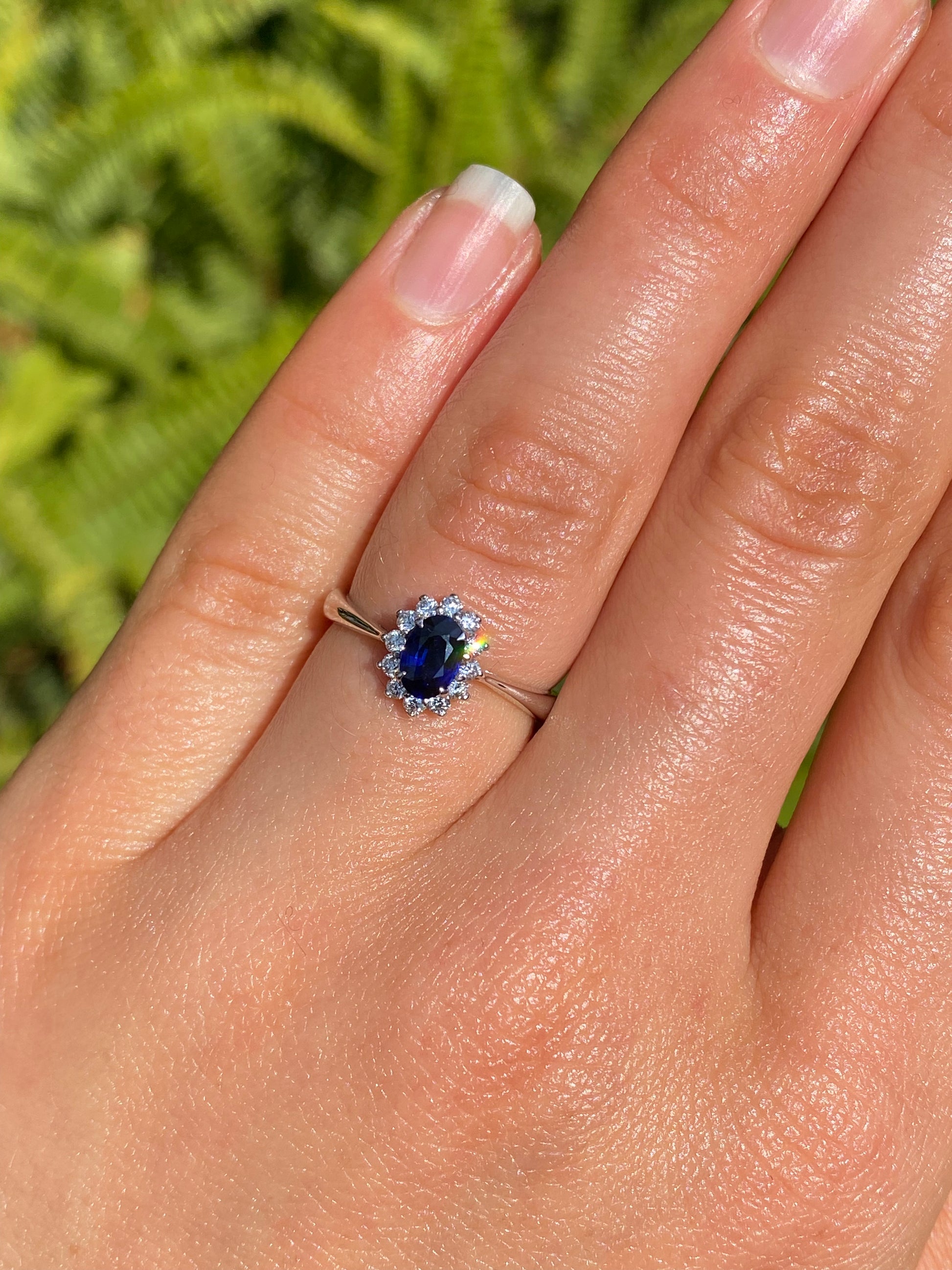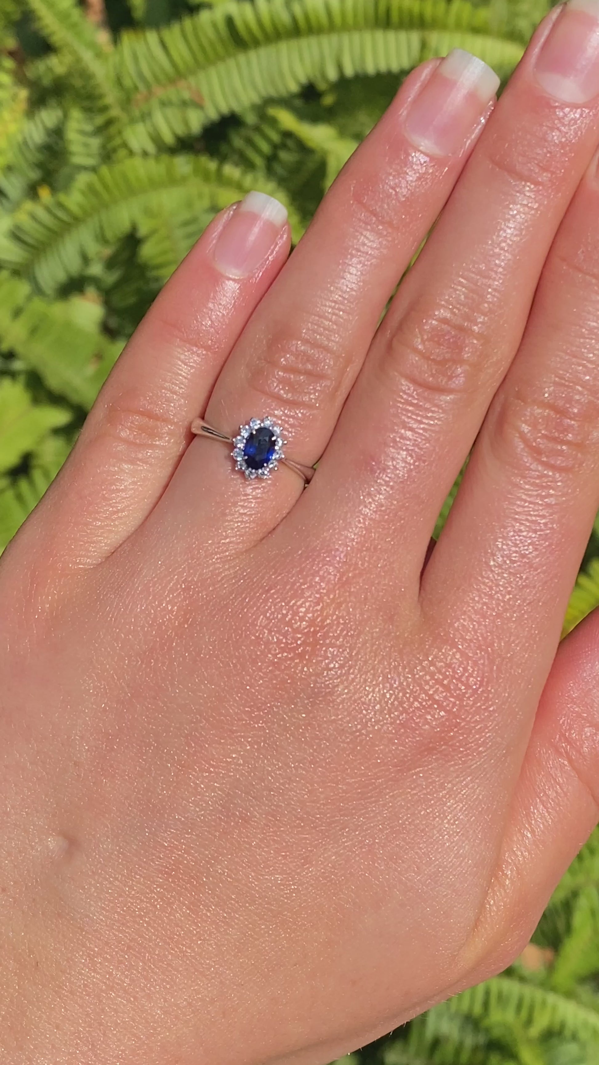 A dark, midnight-blue sapphire catches your eye with its mysterious blue glow. Surrounded by its very own halo of diamonds that sparkle like the stars at night, you have the perfect astral display on your finger. Crafted in gleaming 18K white gold by Browns.