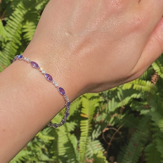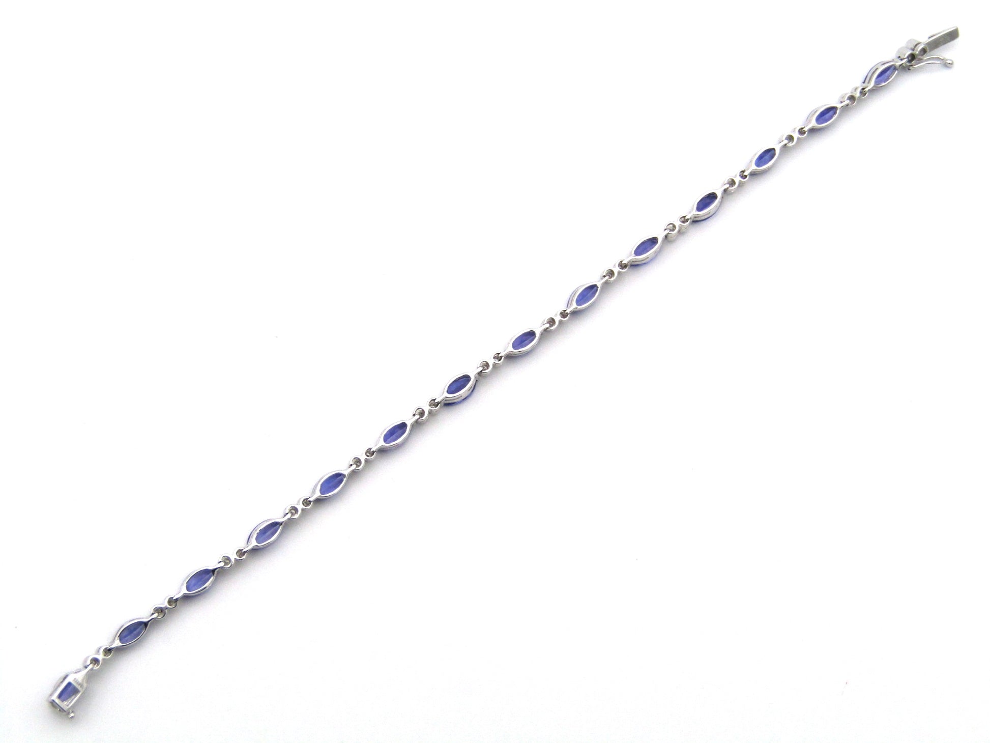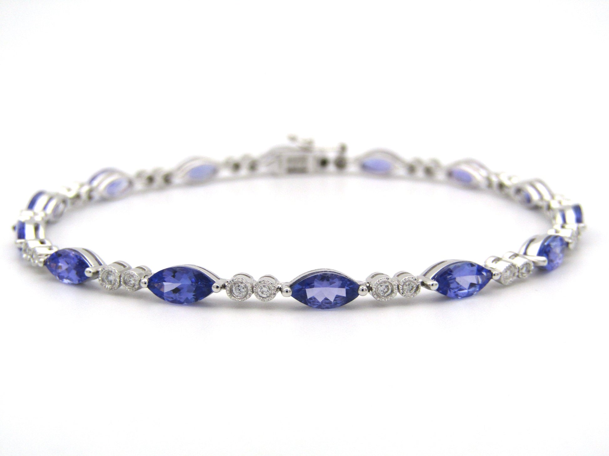 Classy and chic, set in gleaming 18K white gold, 14 marquise shaped tanzanites sparkle like bright berries in a straight line, with two round brilliant cut diamonds set in-between each in bezel settings with millegraine borders. This stunning bracelet was made by Browns in 2009.