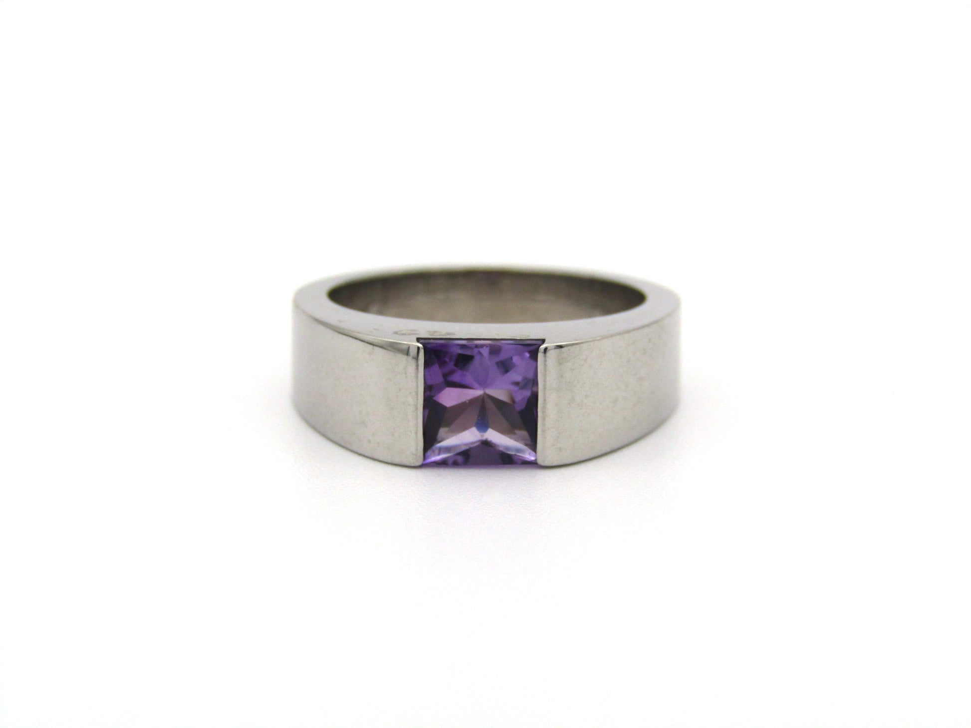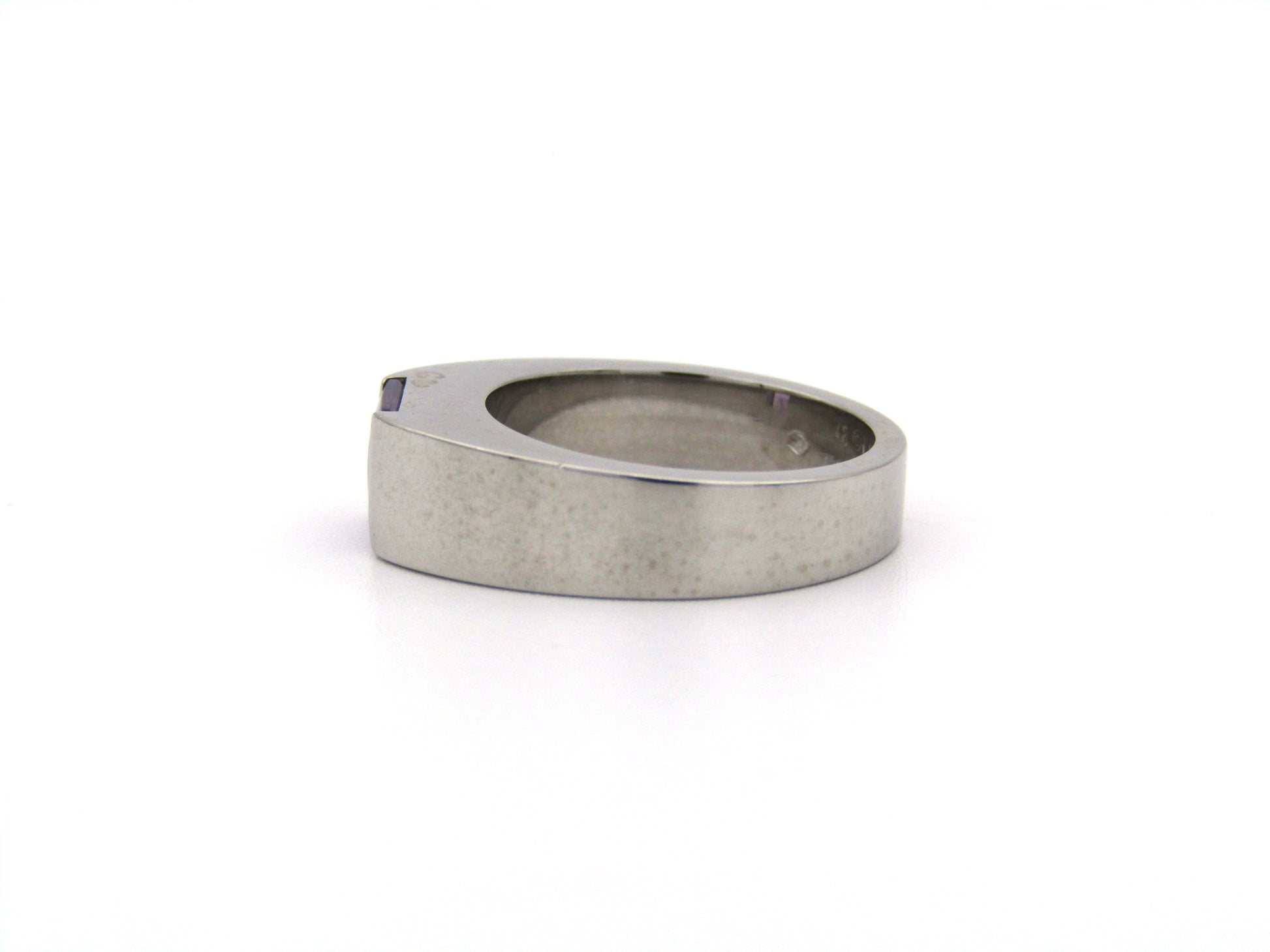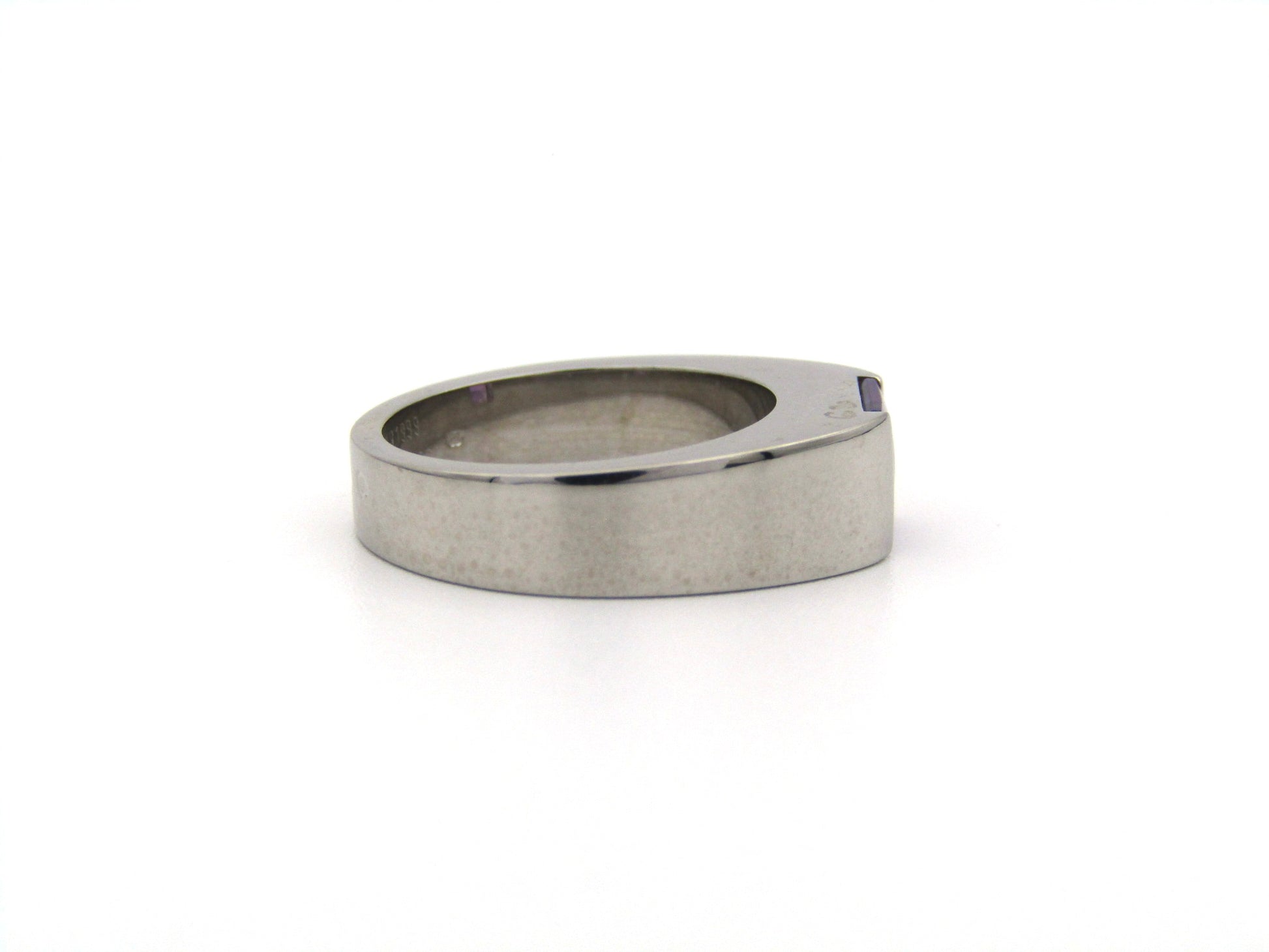 Bring back to life the refined elegance of the 90's with this classy Cartier ring. A 0.83 carat light purple amethyst sits snugly in a sophisticated channel setting, and is enveloped in 18K white gold that has been polished to a mirror-like sheen. The graceful lines and perfect proportions are an ode to Cartier's attention to detail and perfect craftsmanship. This stylish Vintage ring was made in 1999.