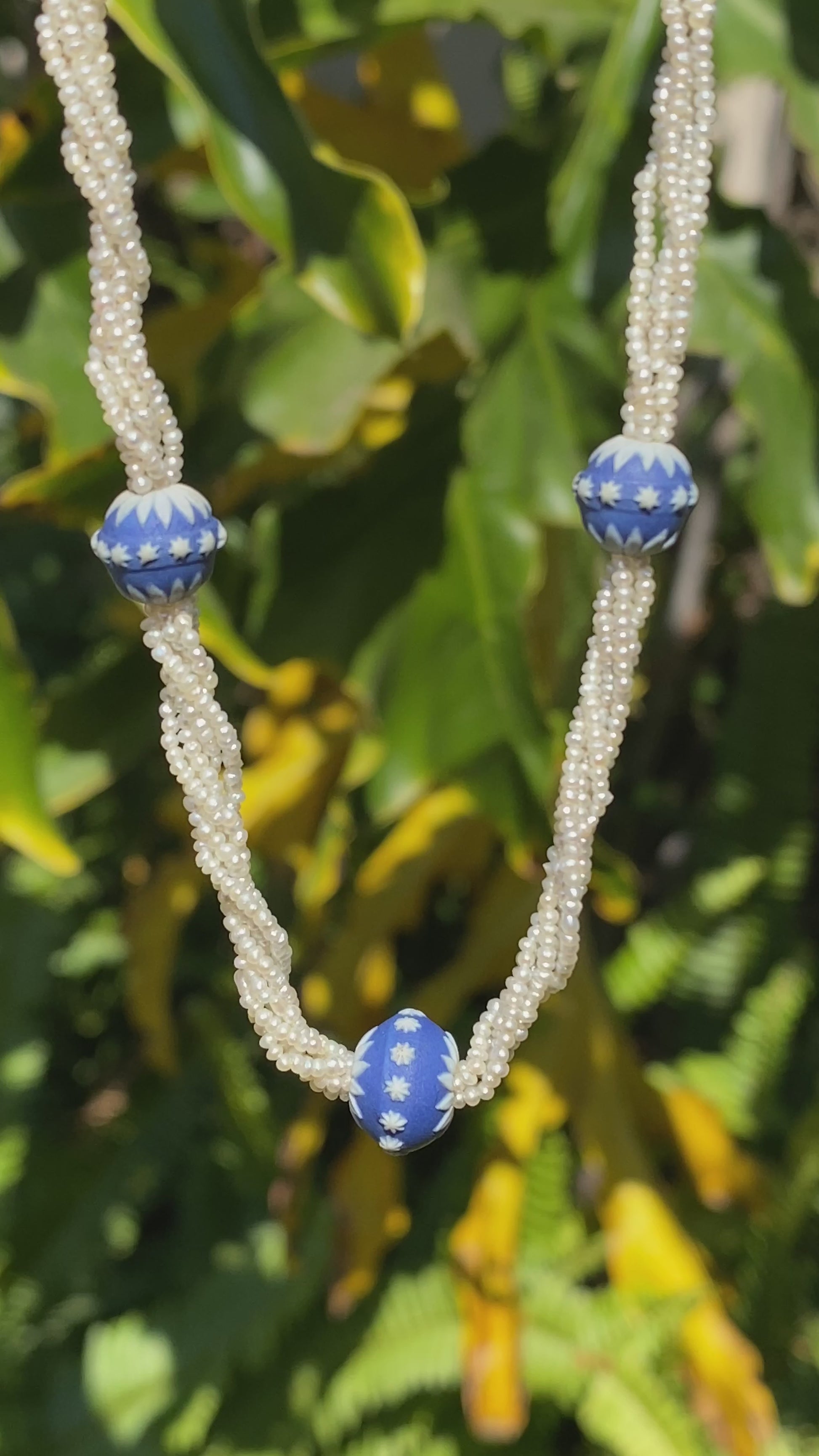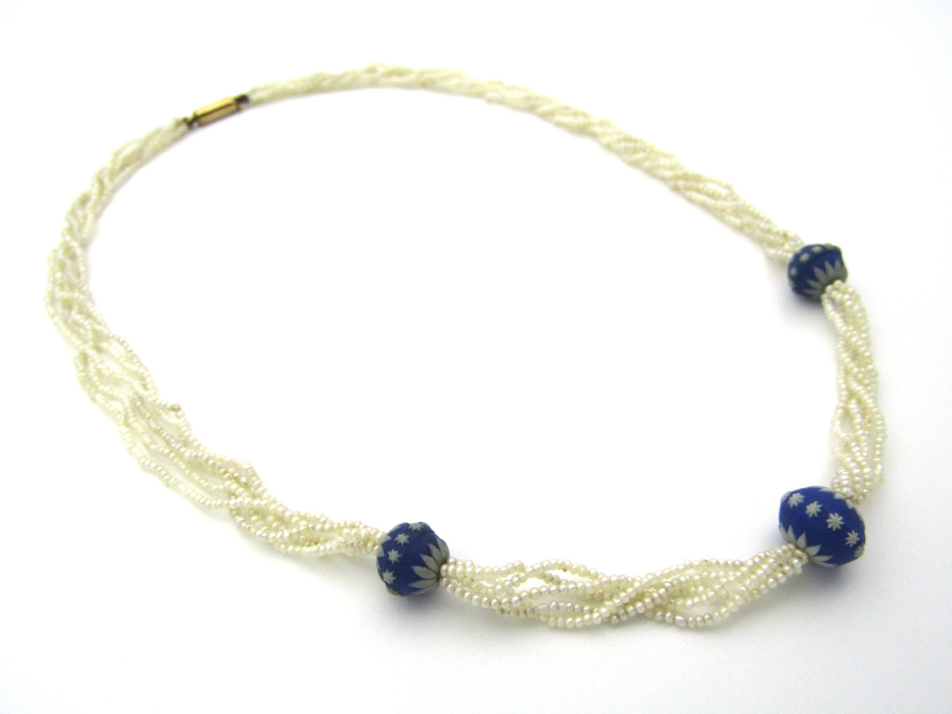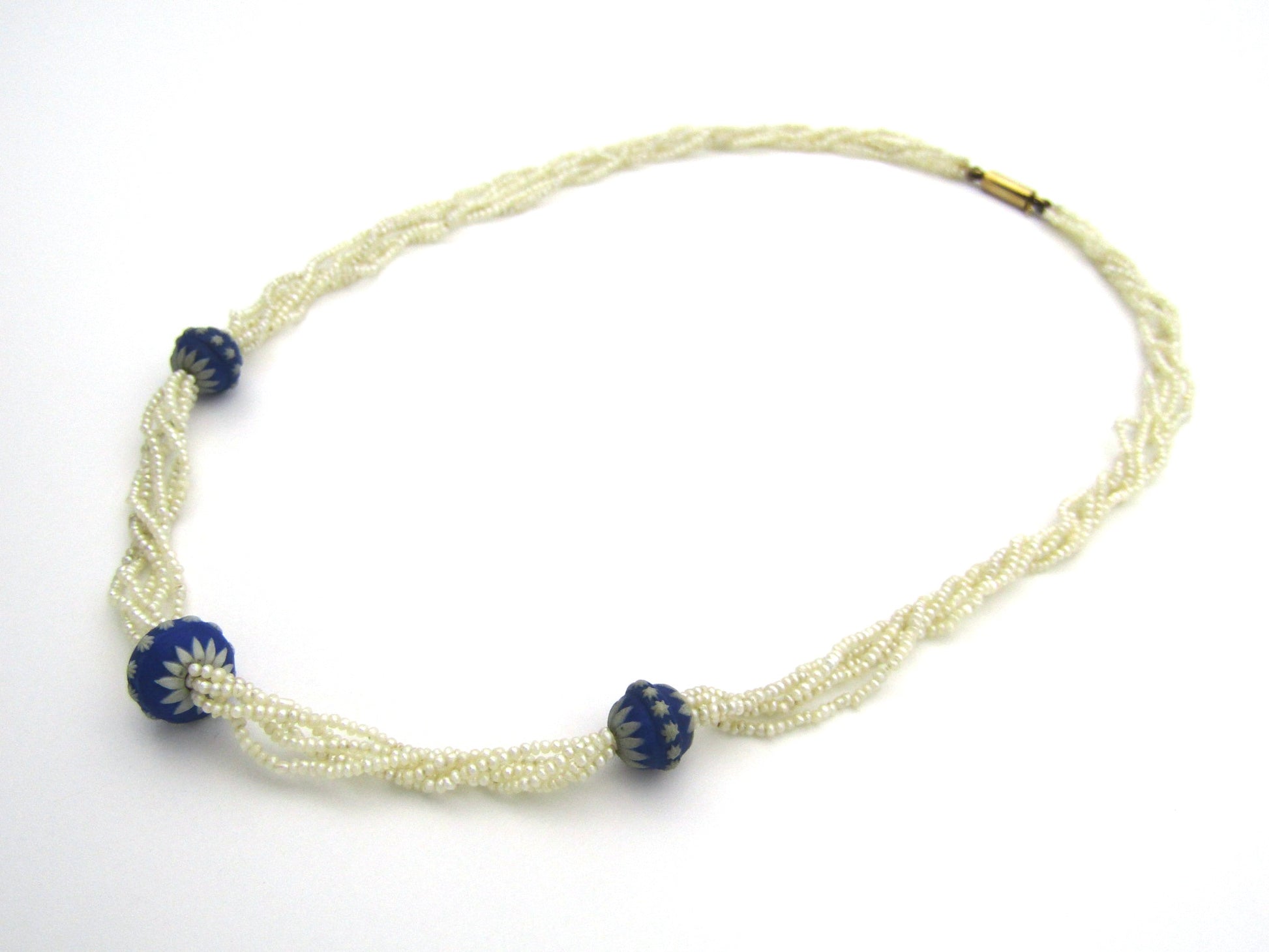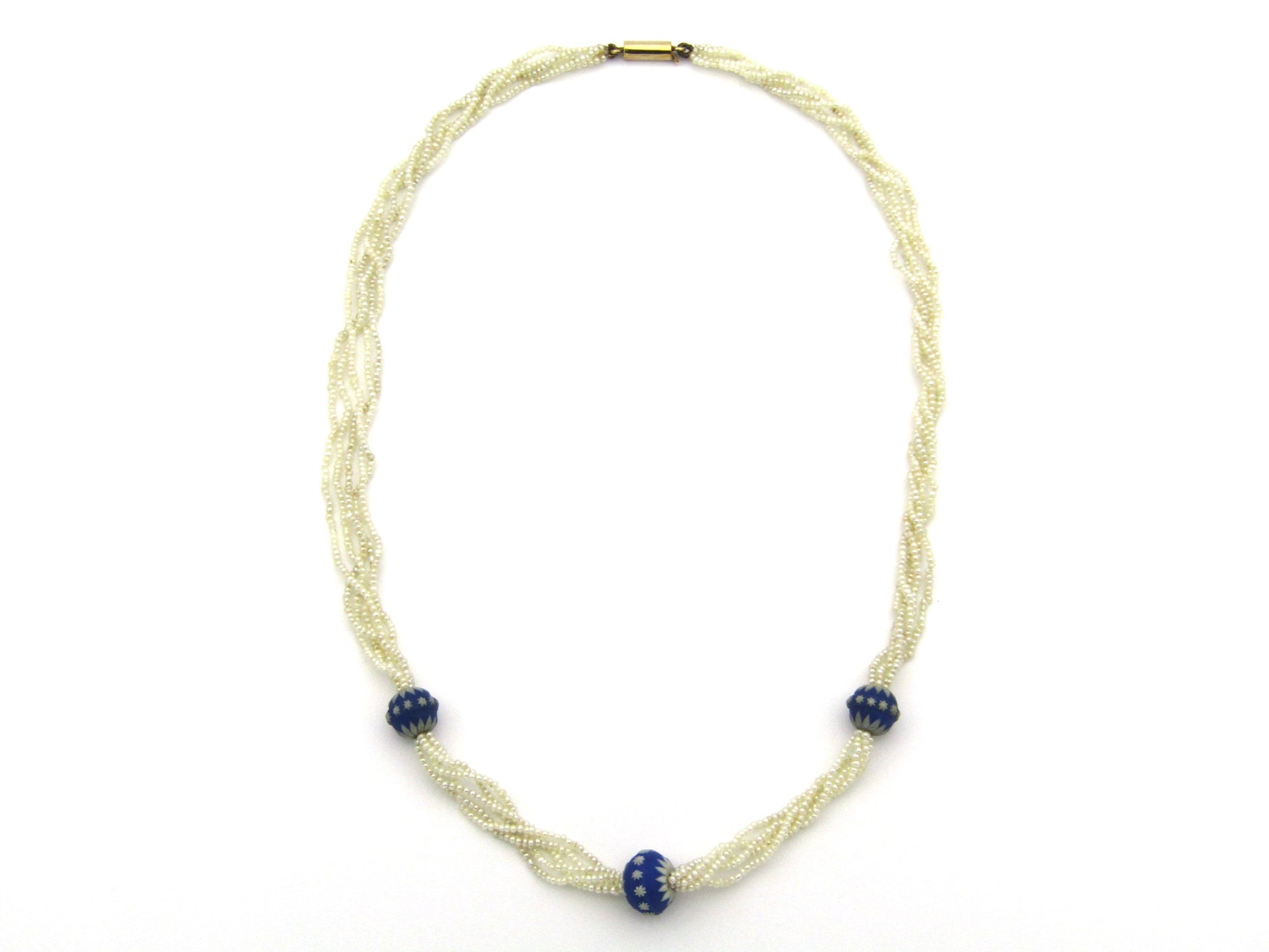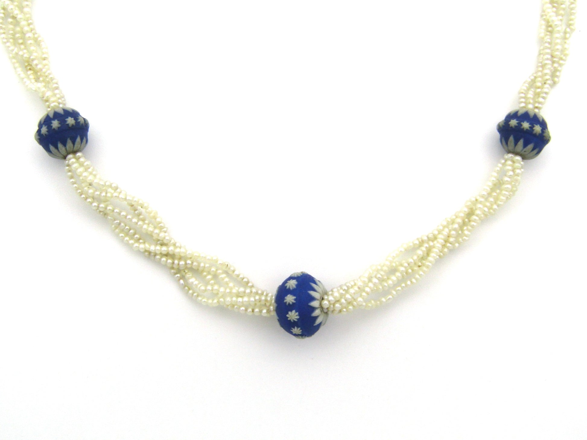 9K gold 5-strand seed pearl Wedgewood Victorian necklace, circa 1880.