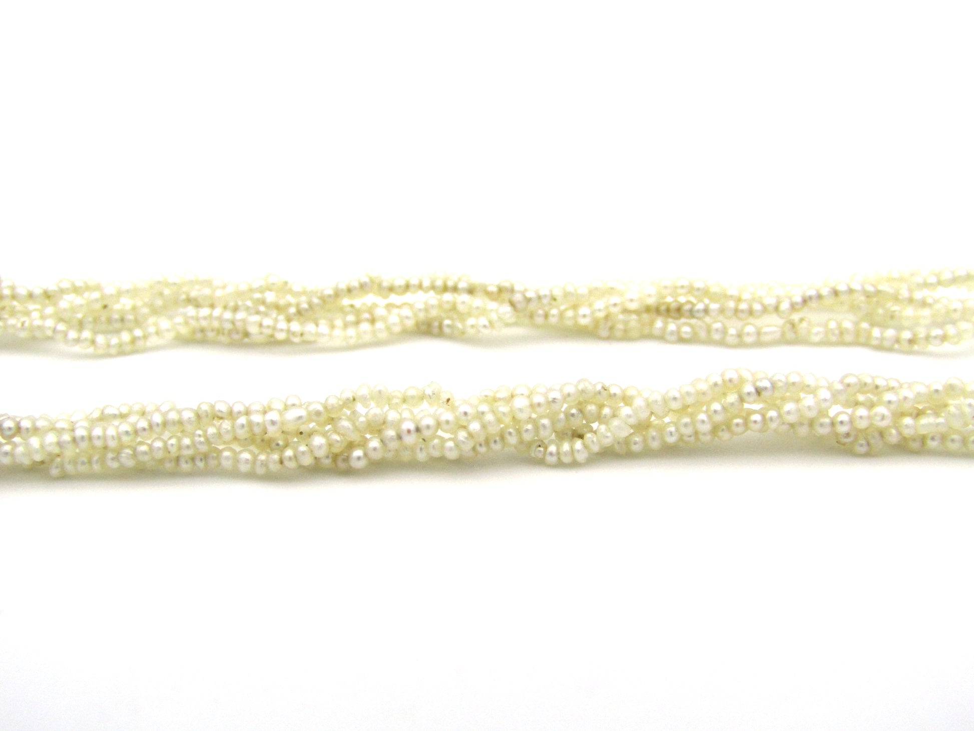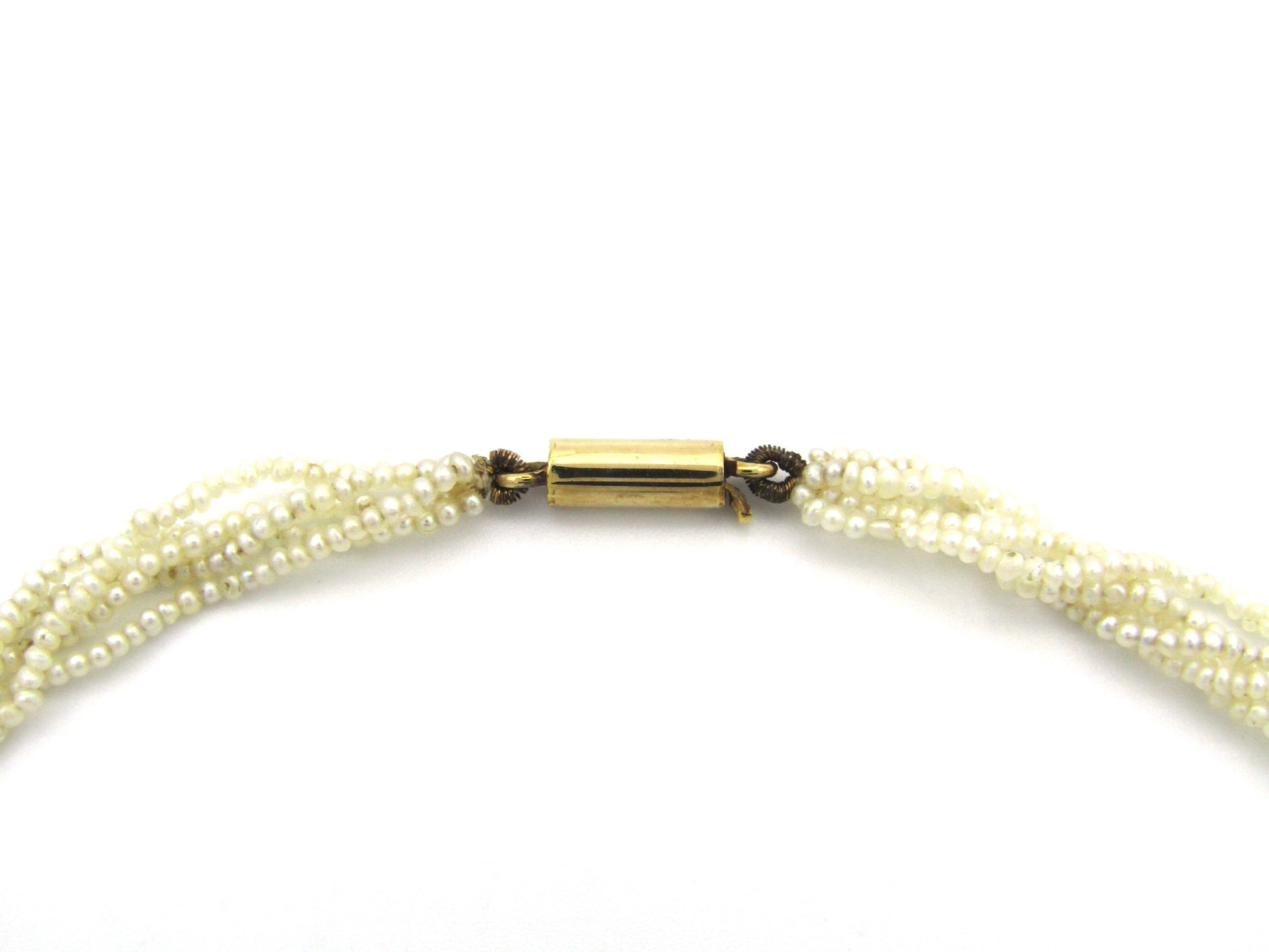 Five strands of pure lustrous beauty shimmer and glimmer around your neckline. Five strands of hundreds of seed pearls (very small and in this case naturally occurring) have been meticulously strung into this beautiful Victorian necklace, and has been interspersed with three Wedgwood beads. Held in place behind your neck by an elegant 9K yellow gold cylindrical-shaped clasp. Such a rare piece!