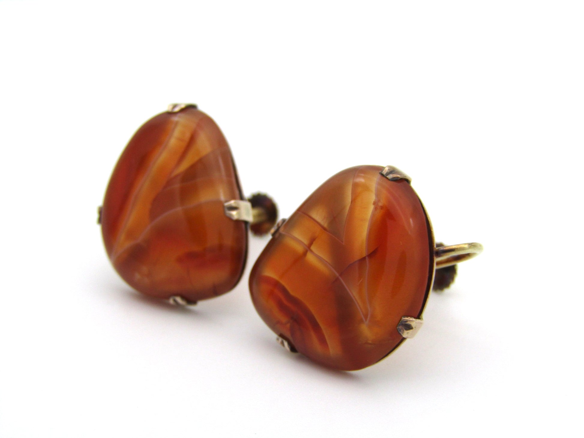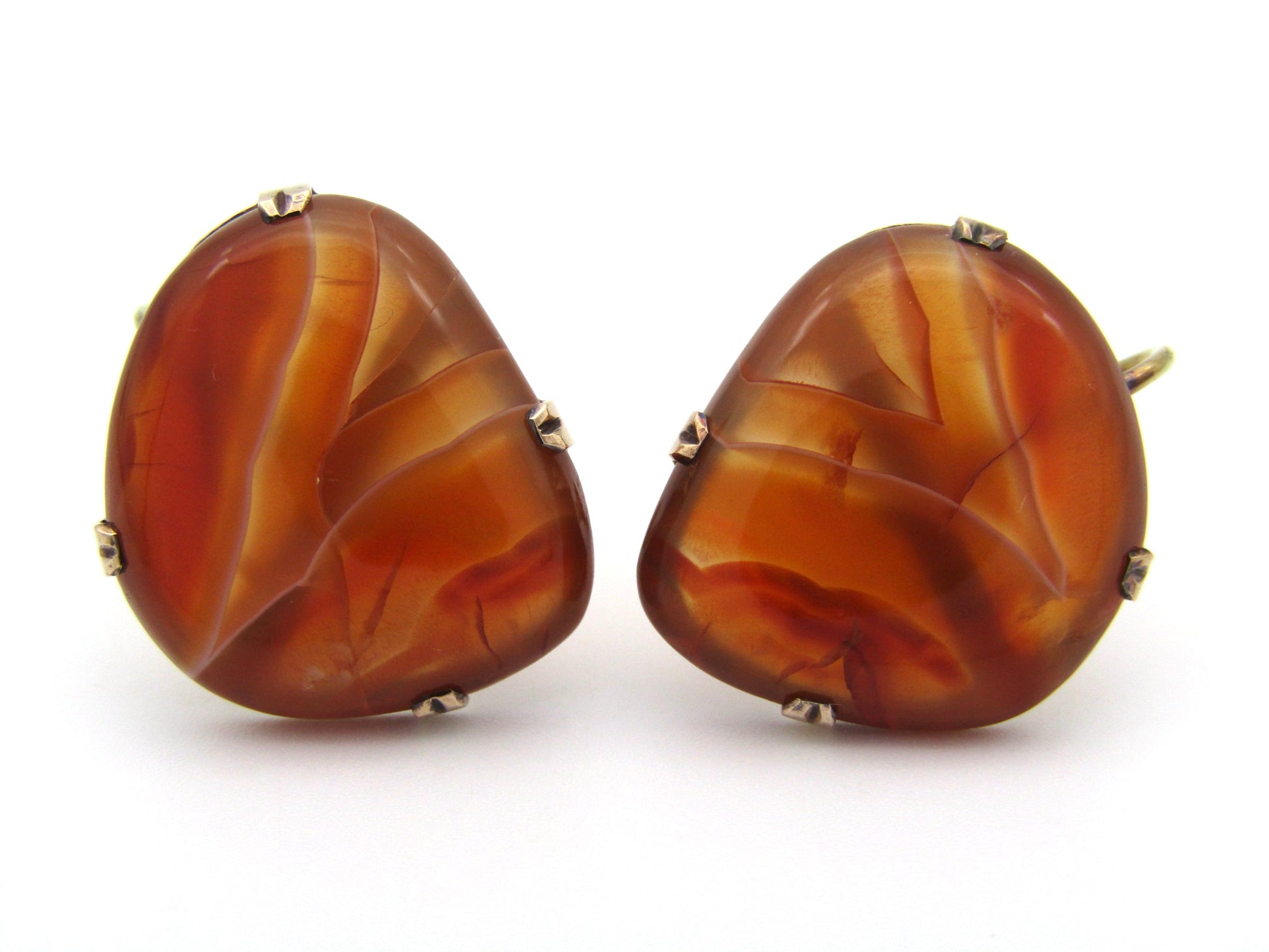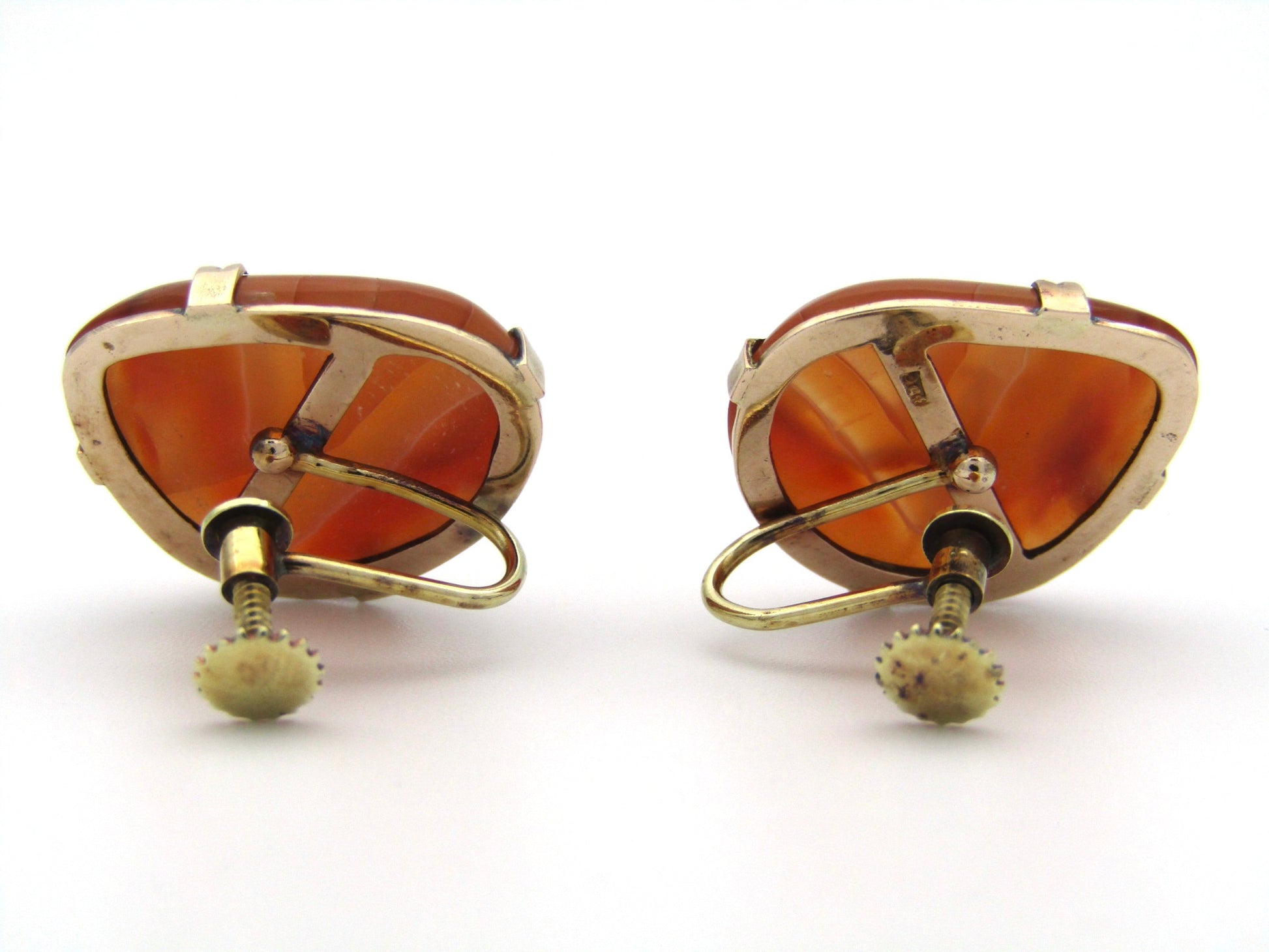 In colours of the evening sunset, and bands reminiscent of a sandy dune landscape, these stand-out agate earrings have been handcrafted in circa 1960's, in 9K rose gold and have screw-on backs for the ladies who don't (or do) have pierced ears.