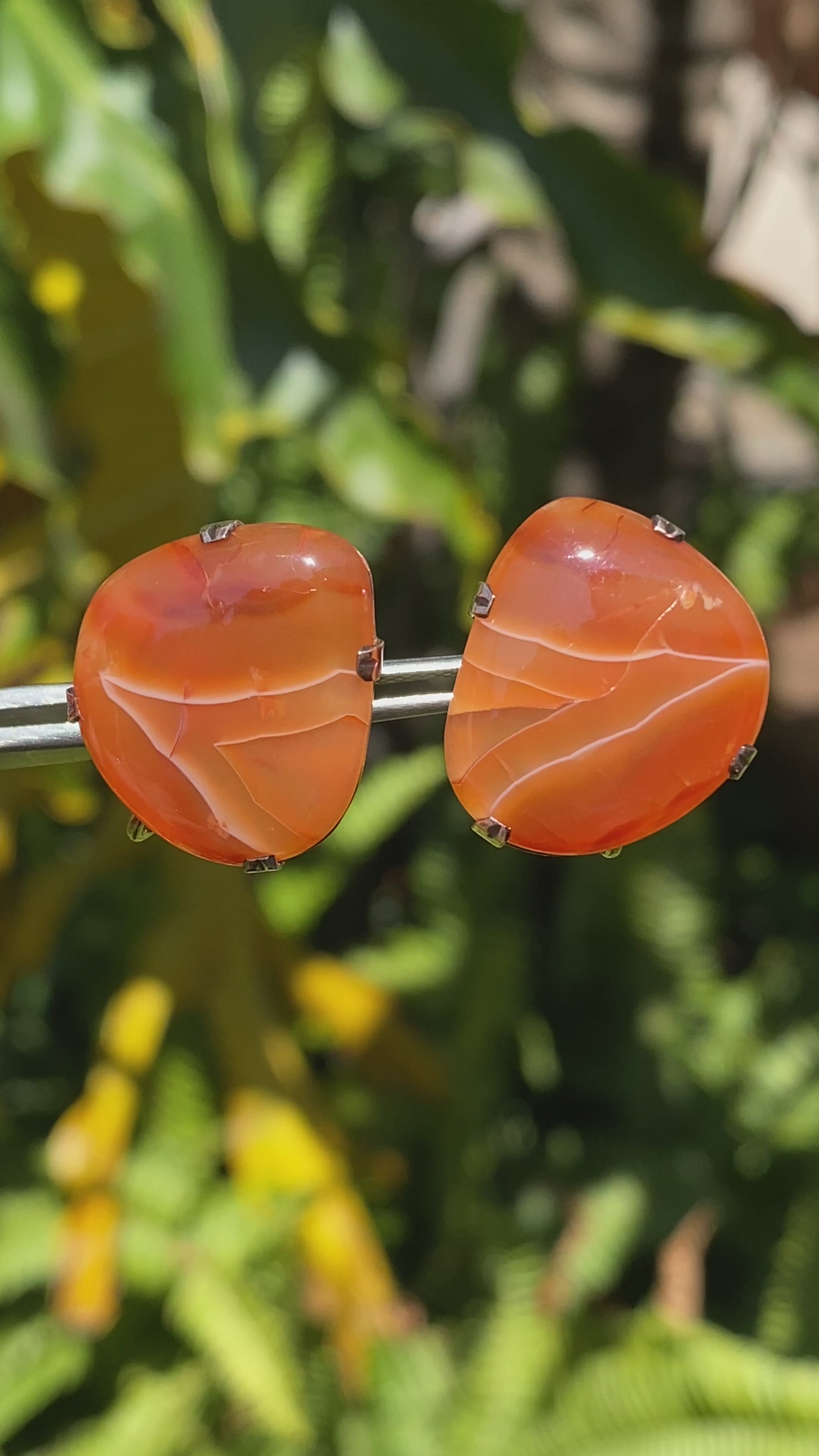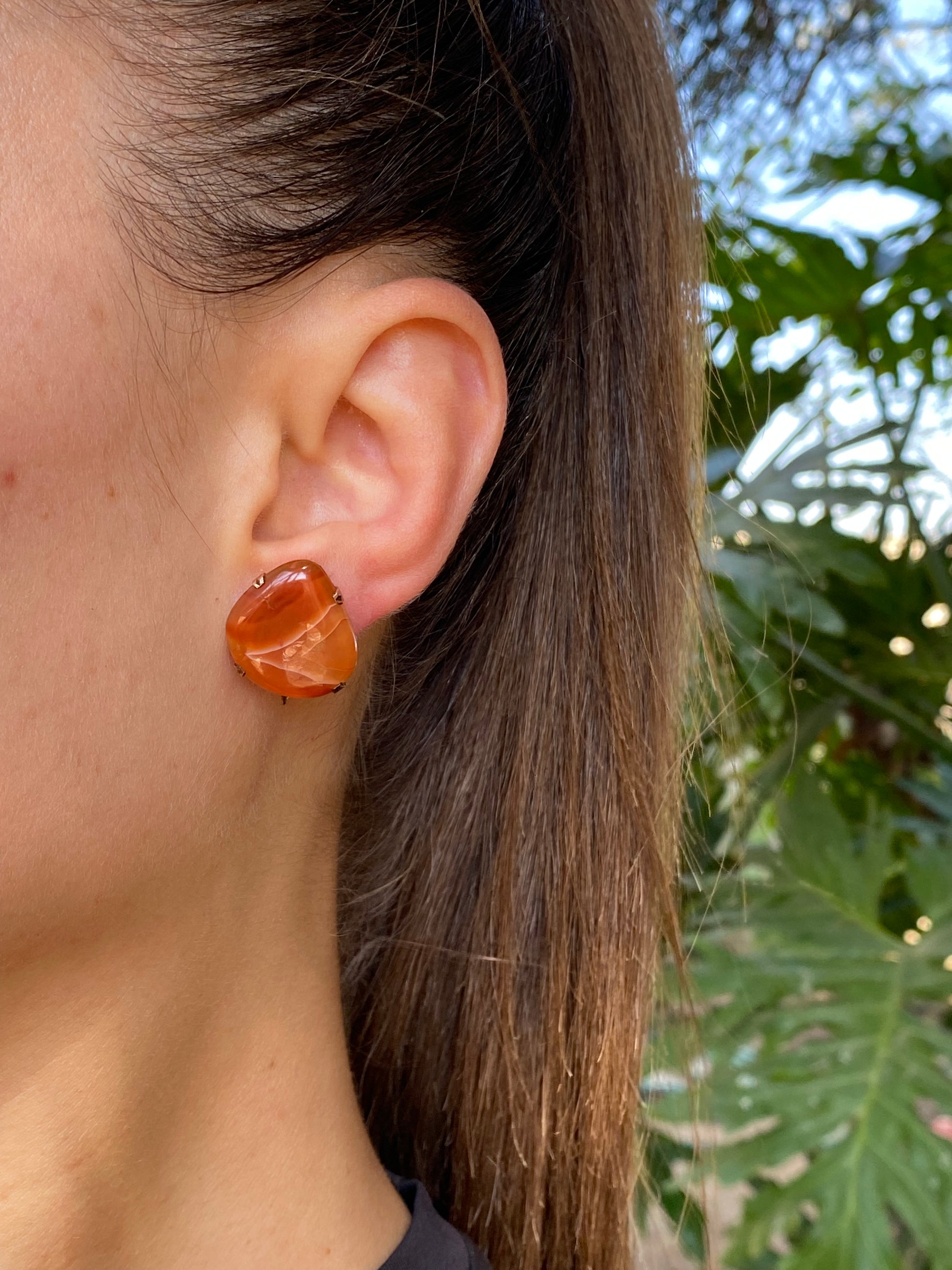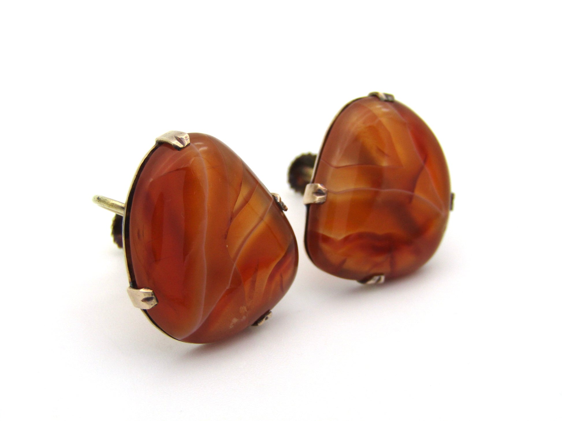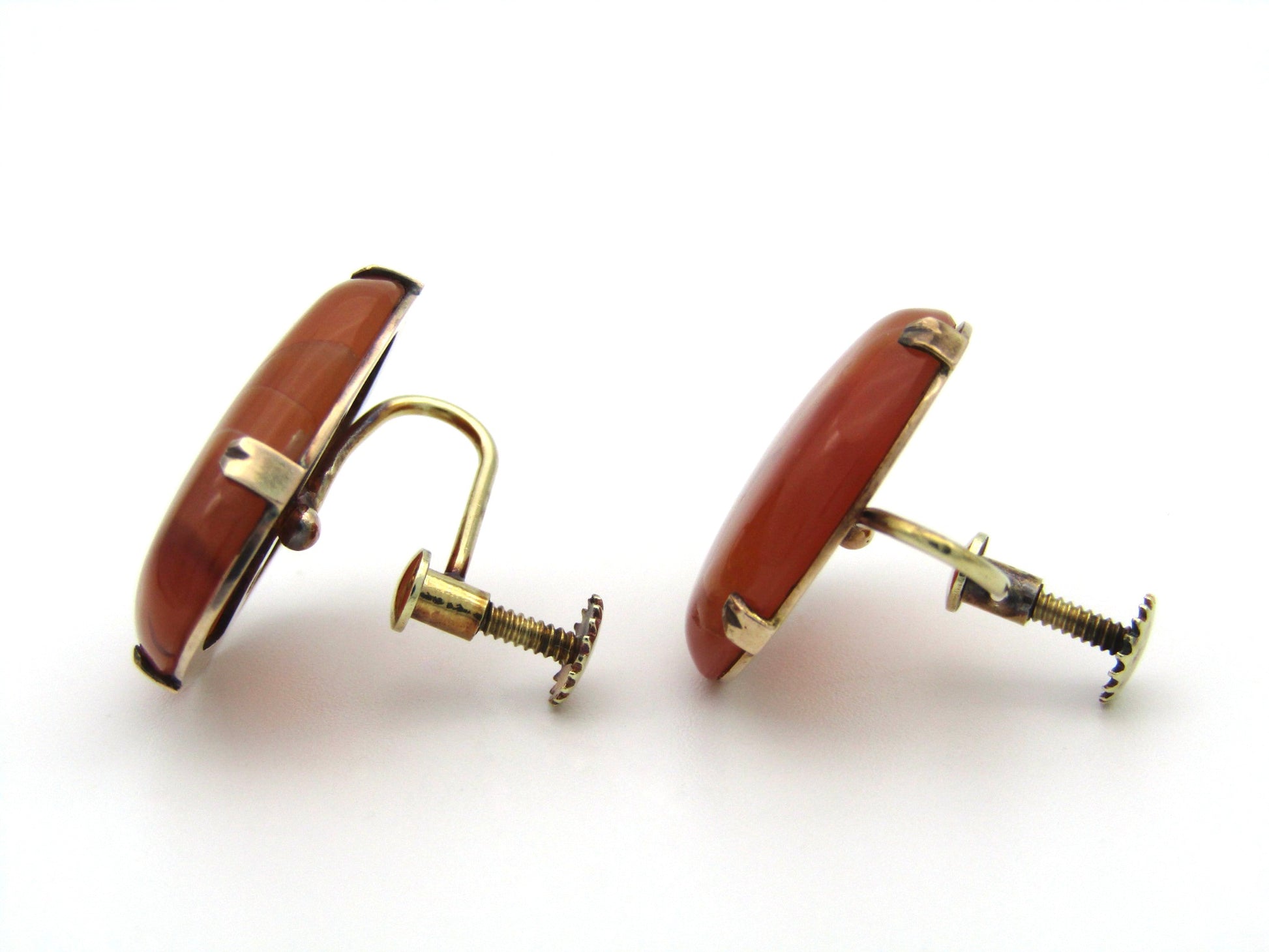 In colours of the evening sunset, and bands reminiscent of a sandy dune landscape, these stand-out agate earrings have been handcrafted in circa 1960's, in 9K rose gold and have screw-on backs for the ladies who don't (or do) have pierced ears.