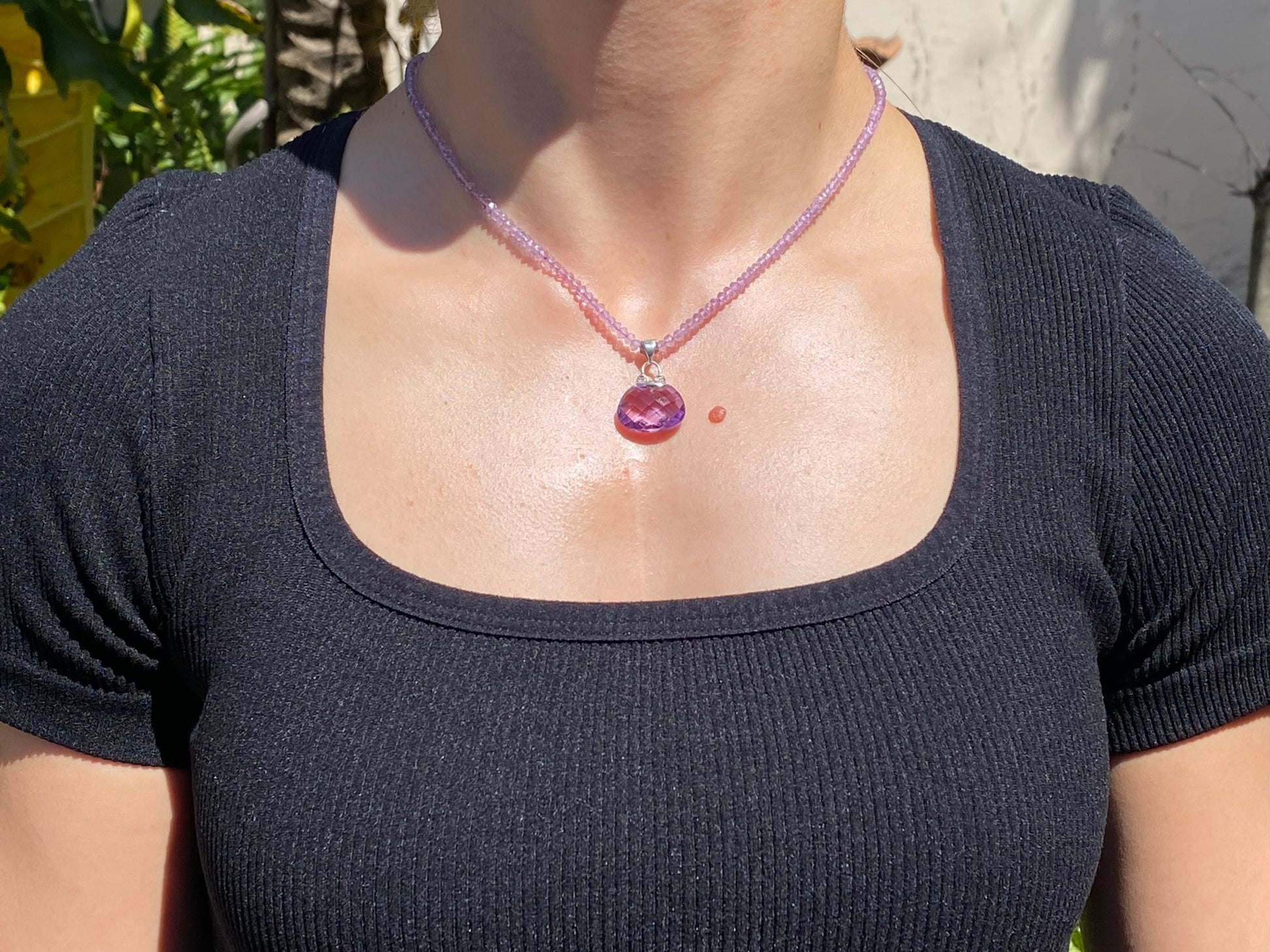 9K gold amethyst handbag pendant with 9K gold amethyst bead necklace.