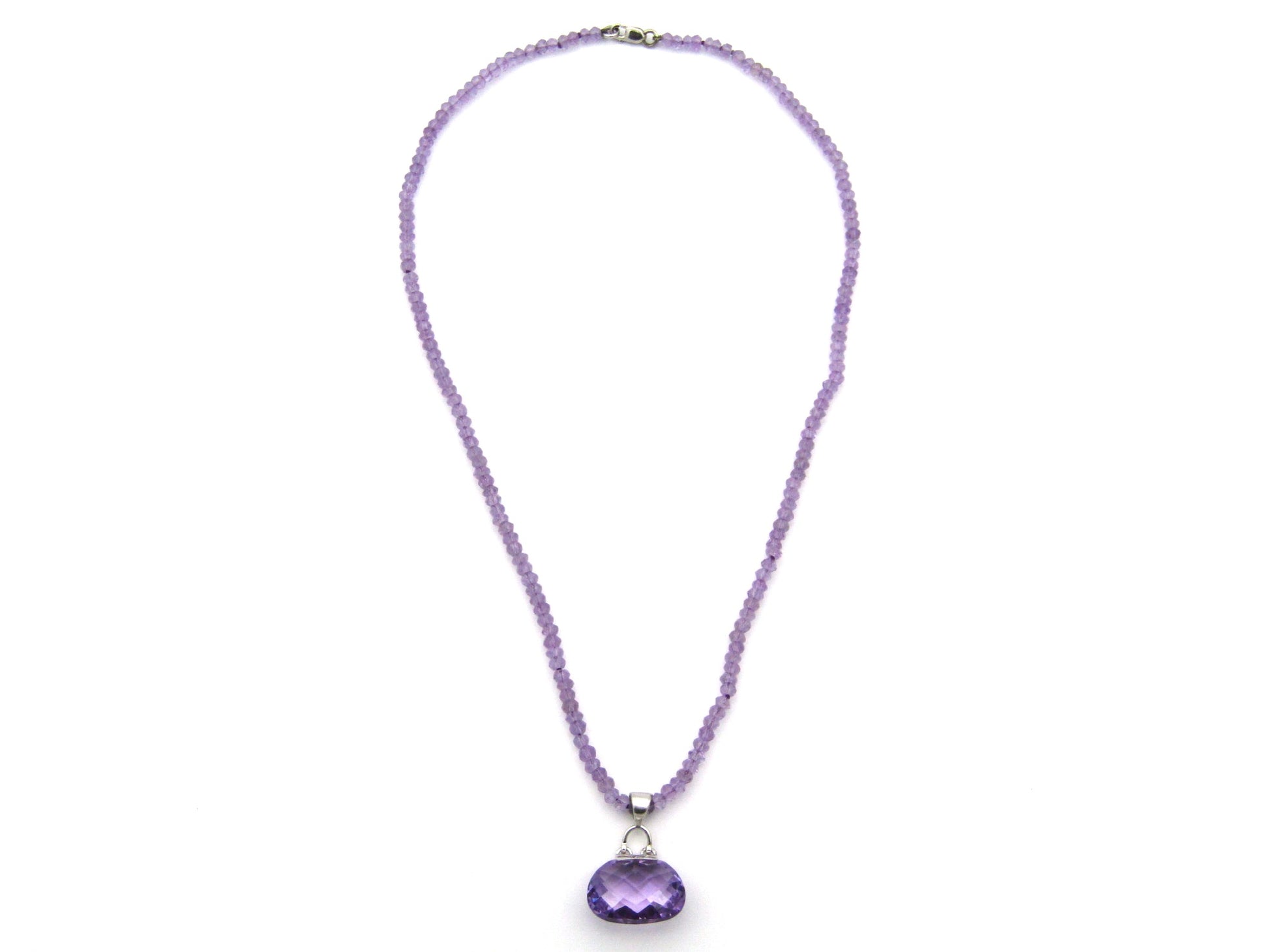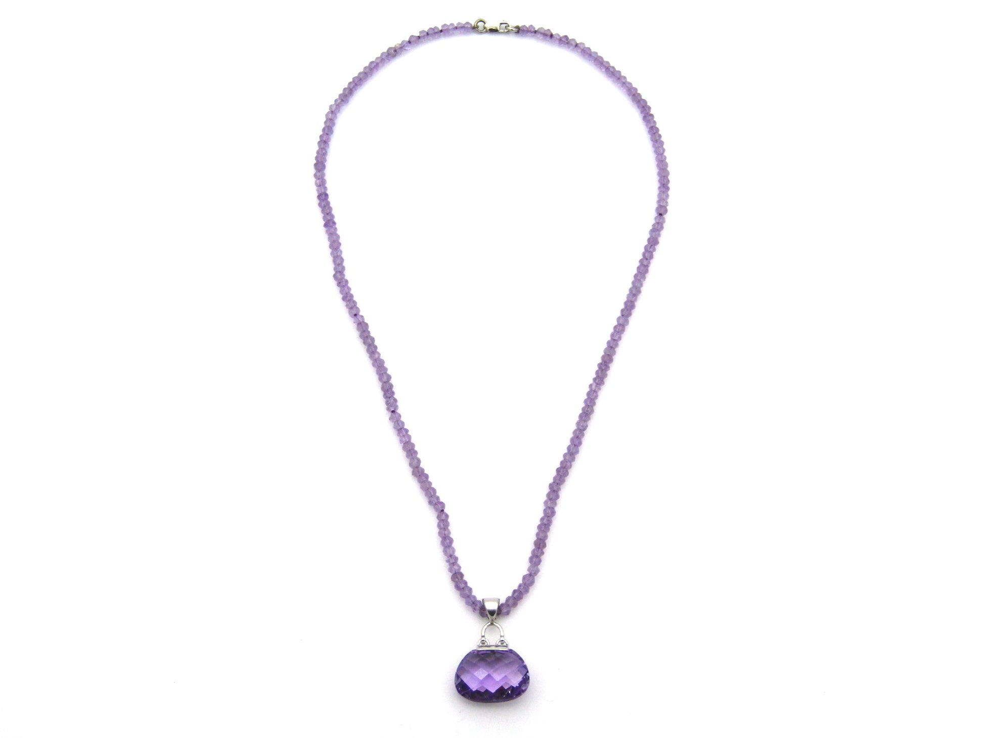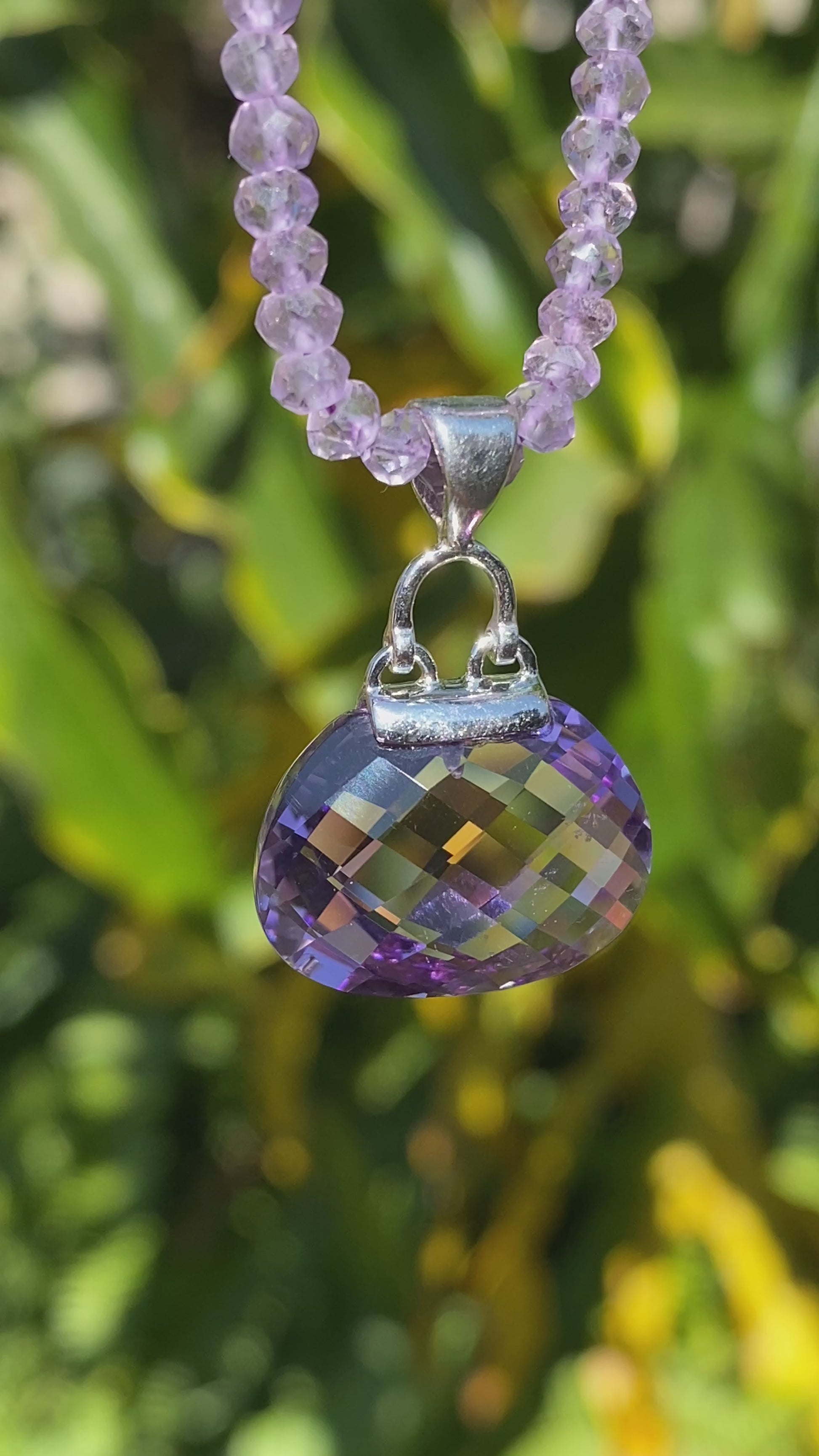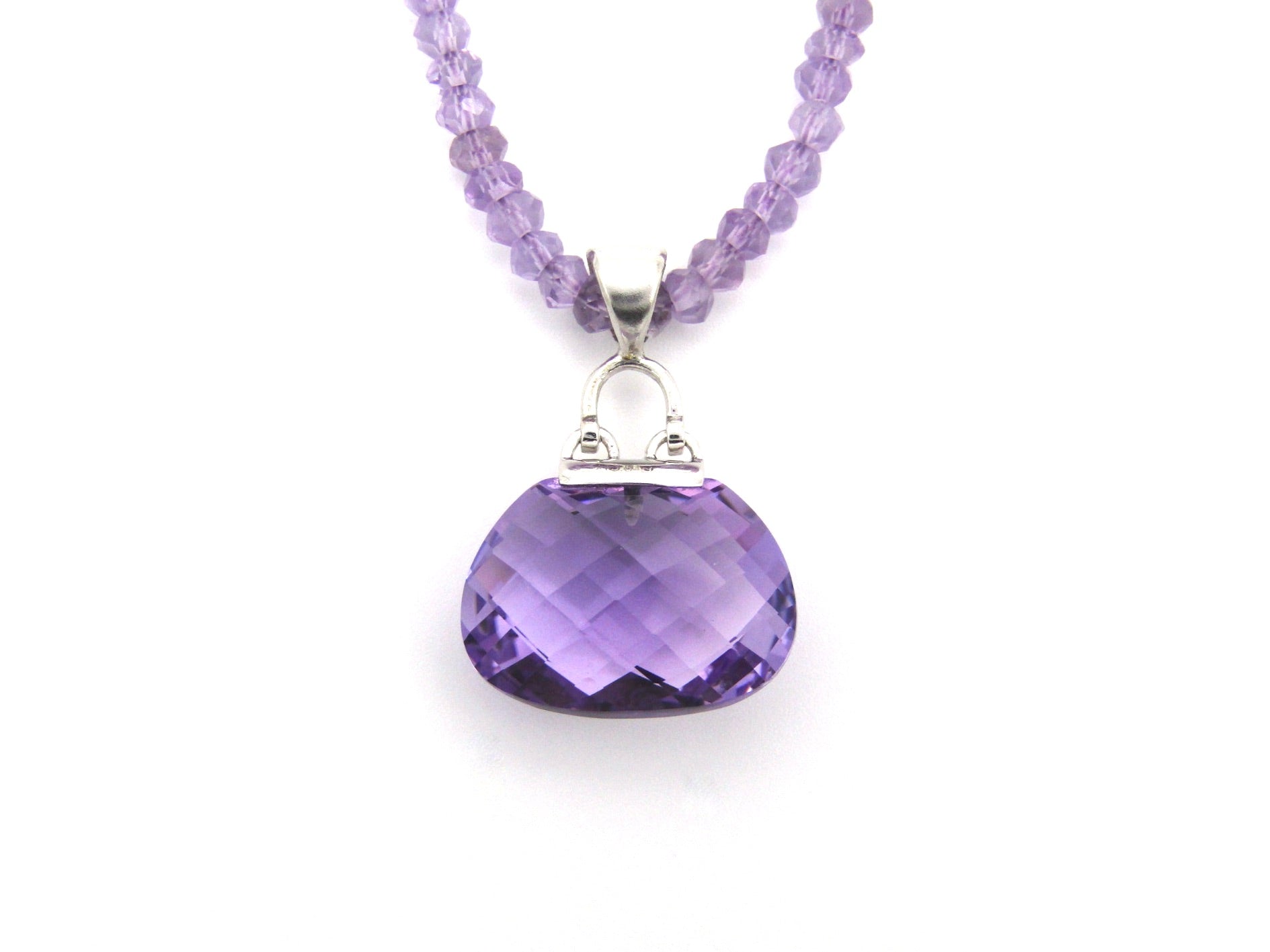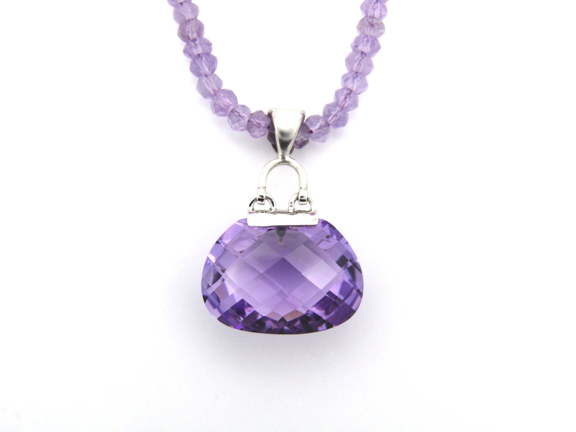Cute is the understatement when describing this pendant! The bail of the pendant has been beautifully handcrafted in 9K white gold in the design of a handbag handle, and a faceted amethyst hangs below cut in the shape of a handbag and faceted in a checkerboard style to catch and reflect light that dazzles the eye. This marvellous creation hangs from a lovely faceted amethyst bead necklace with a 9K white gold clasp. By David Spilkin.