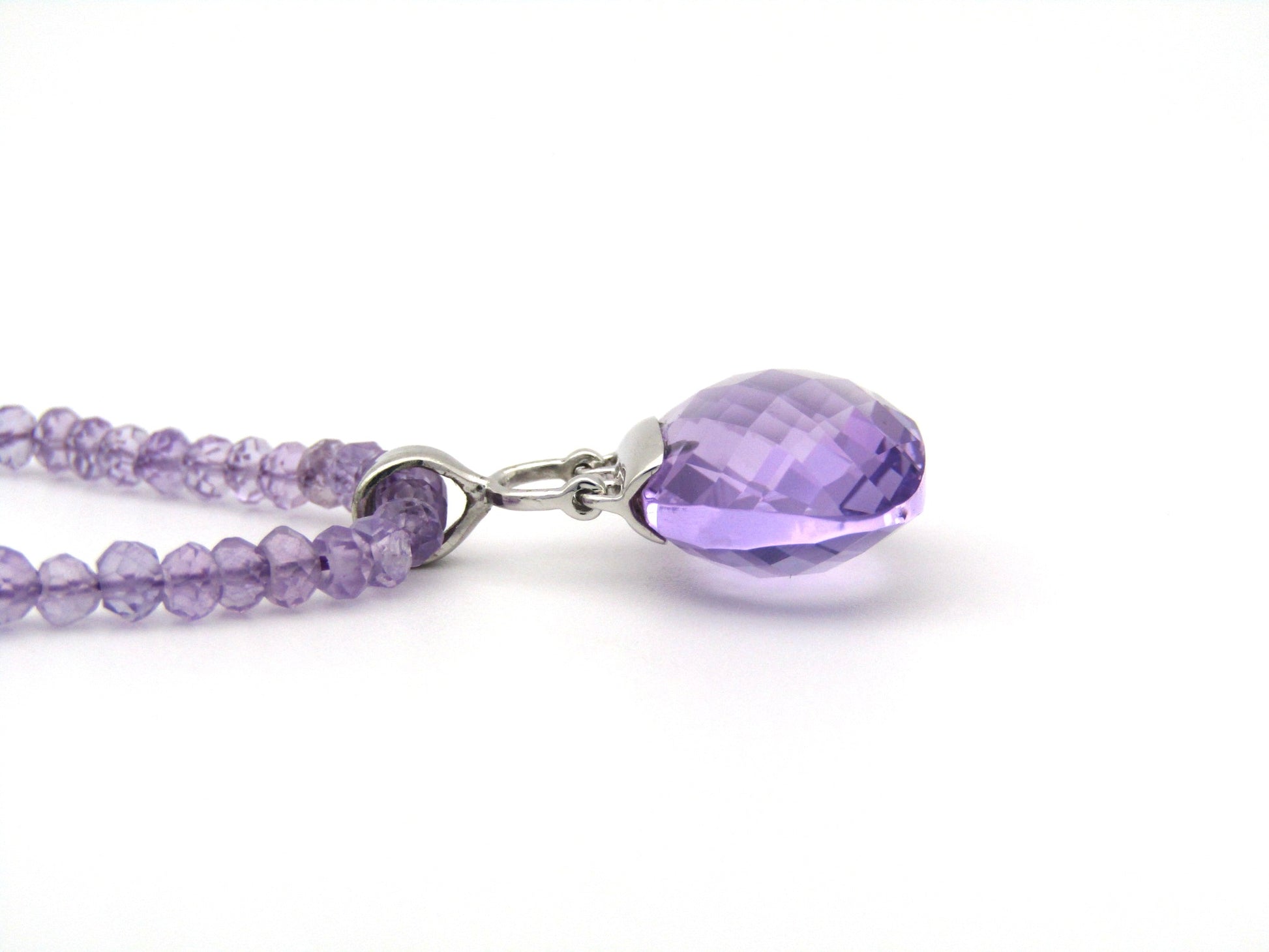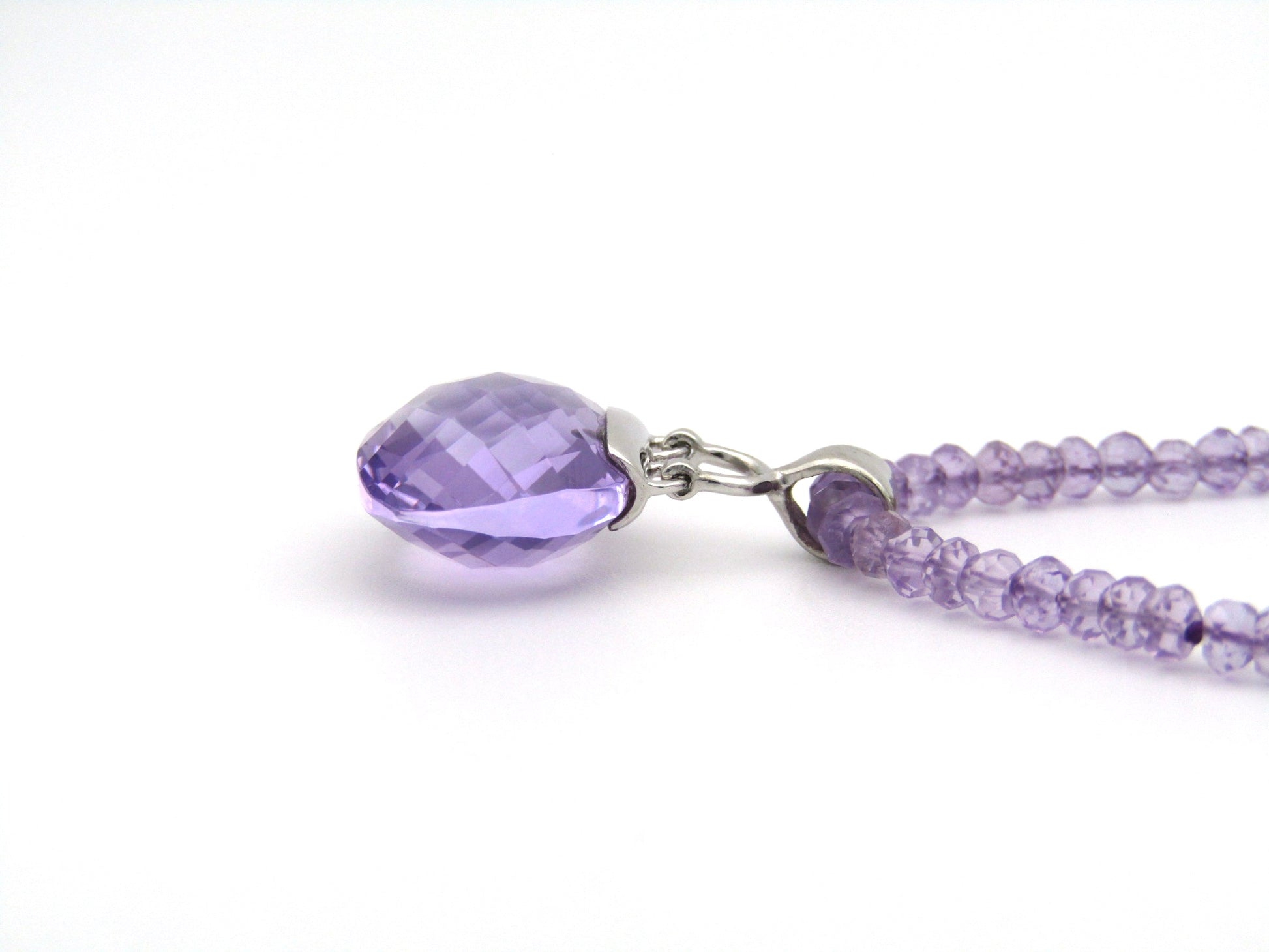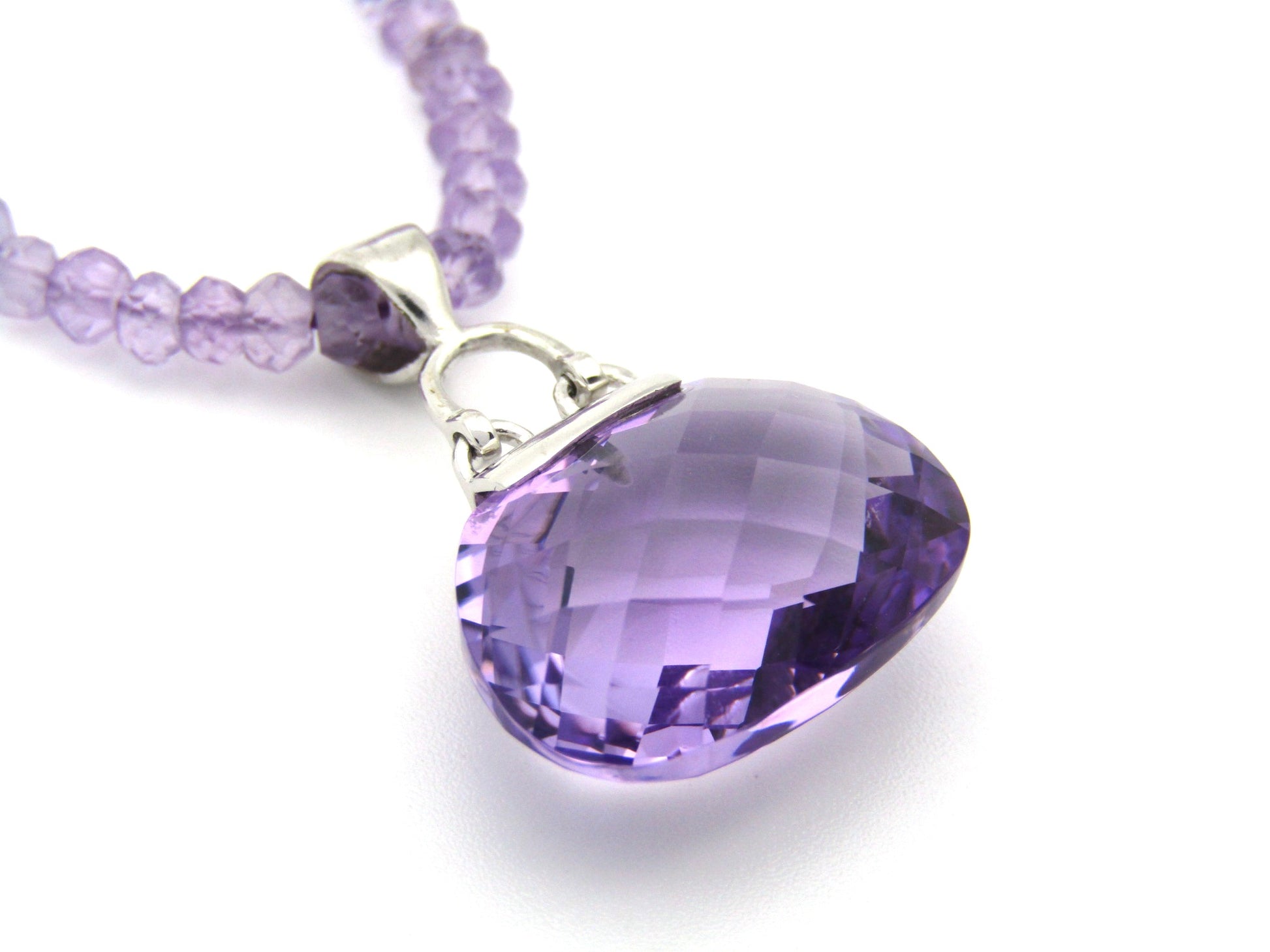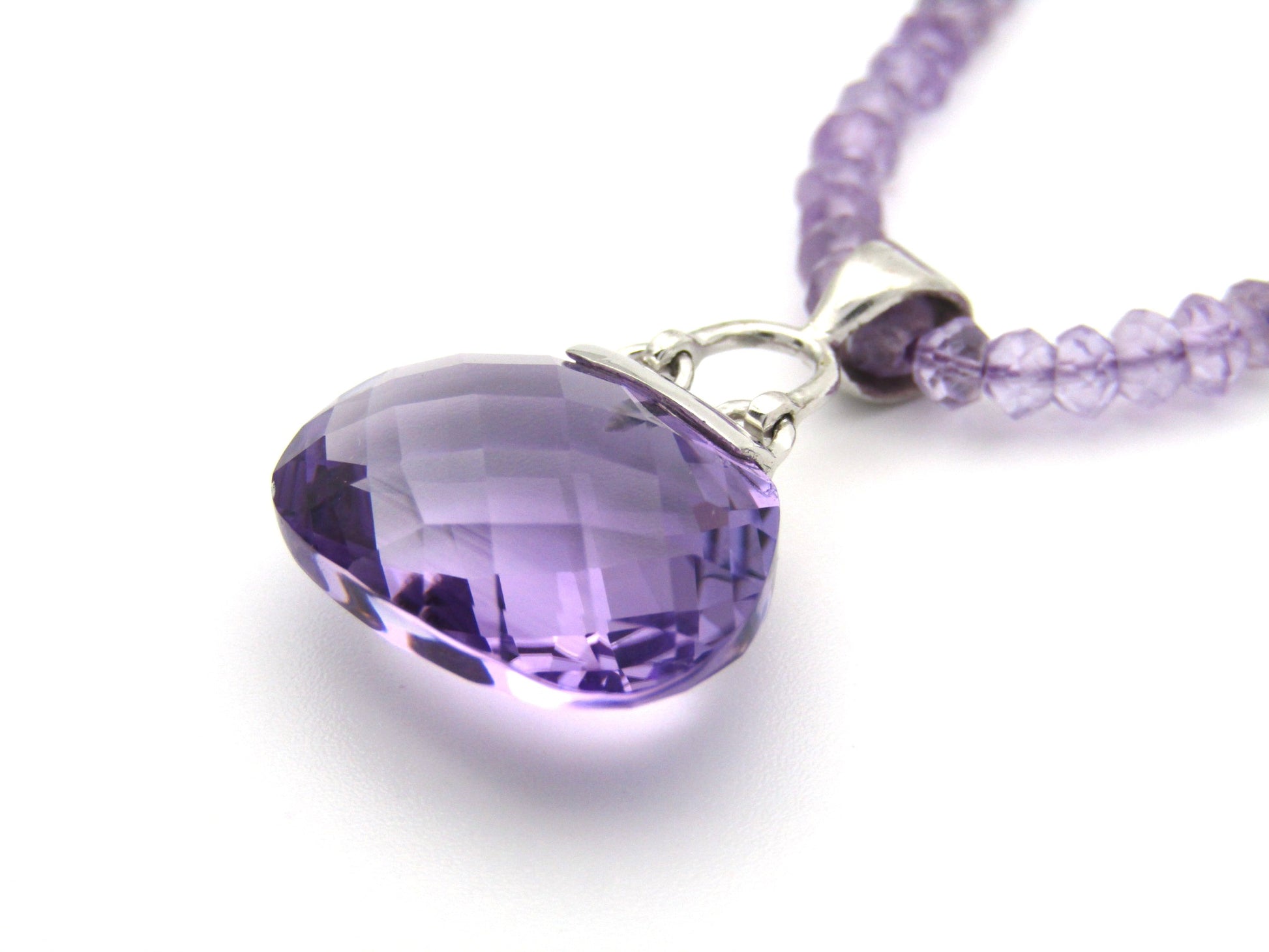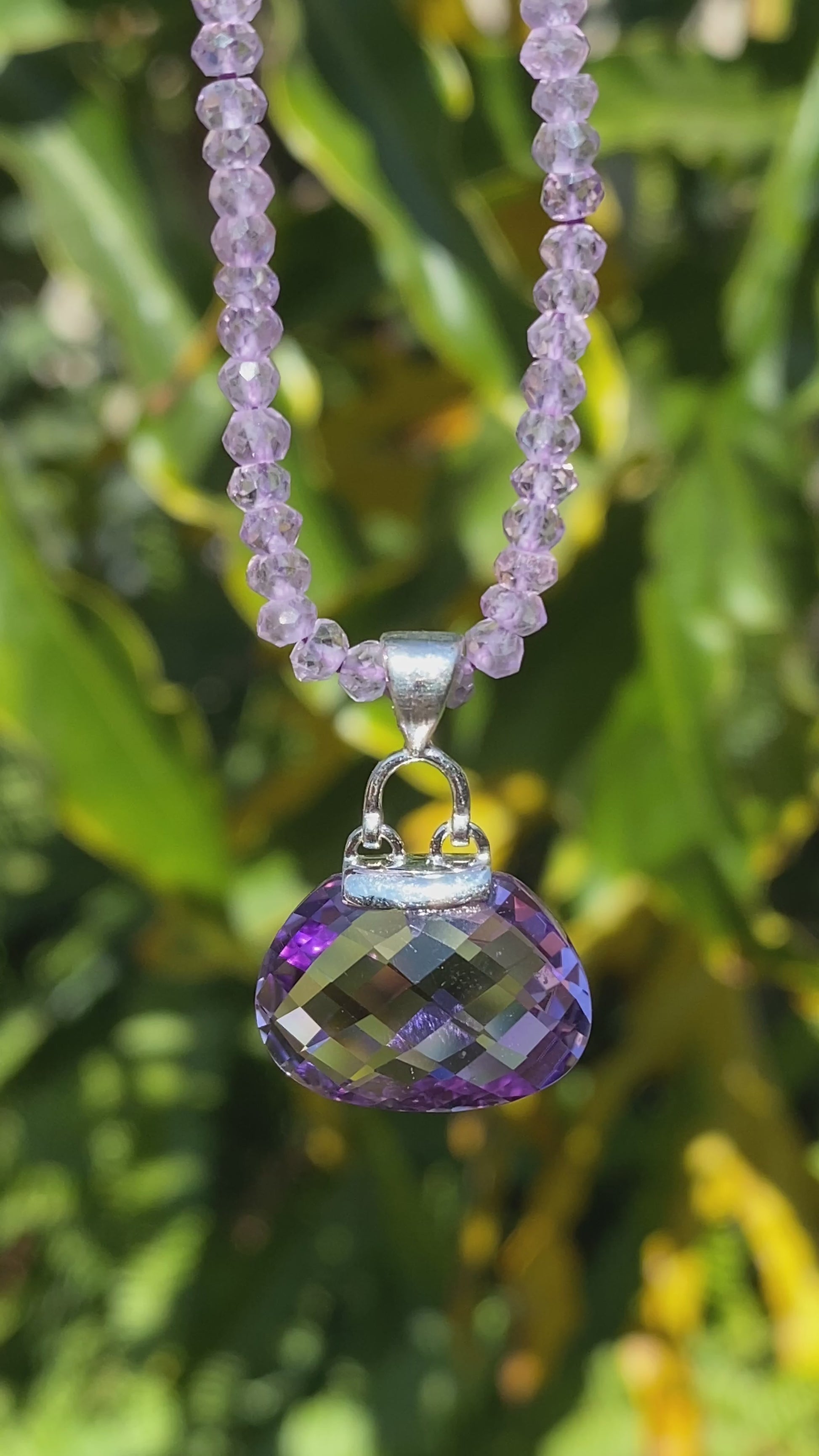 Cute is the understatement when describing this pendant! The bail of the pendant has been beautifully handcrafted in 9K white gold in the design of a handbag handle, and a faceted amethyst hangs below cut in the shape of a handbag and faceted in a checkerboard style to catch and reflect light that dazzles the eye. This marvellous creation hangs from a lovely faceted amethyst bead necklace with a 9K white gold clasp. By David Spilkin.