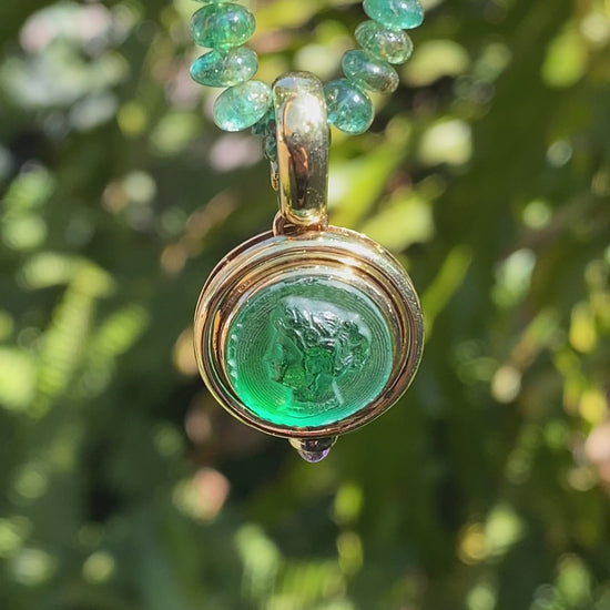9K gold cameo glass and amethyst enhancer with emerald bead necklace.