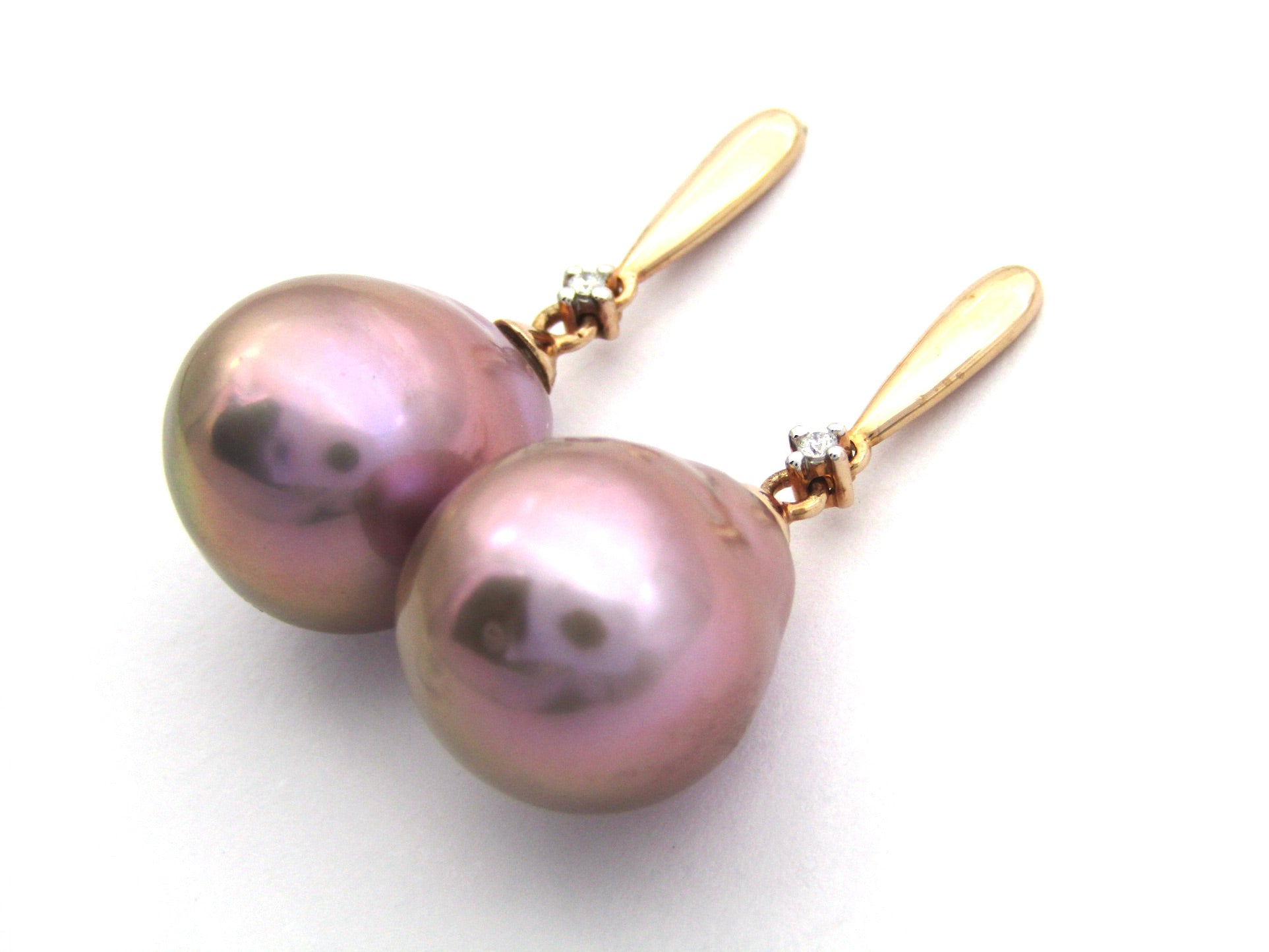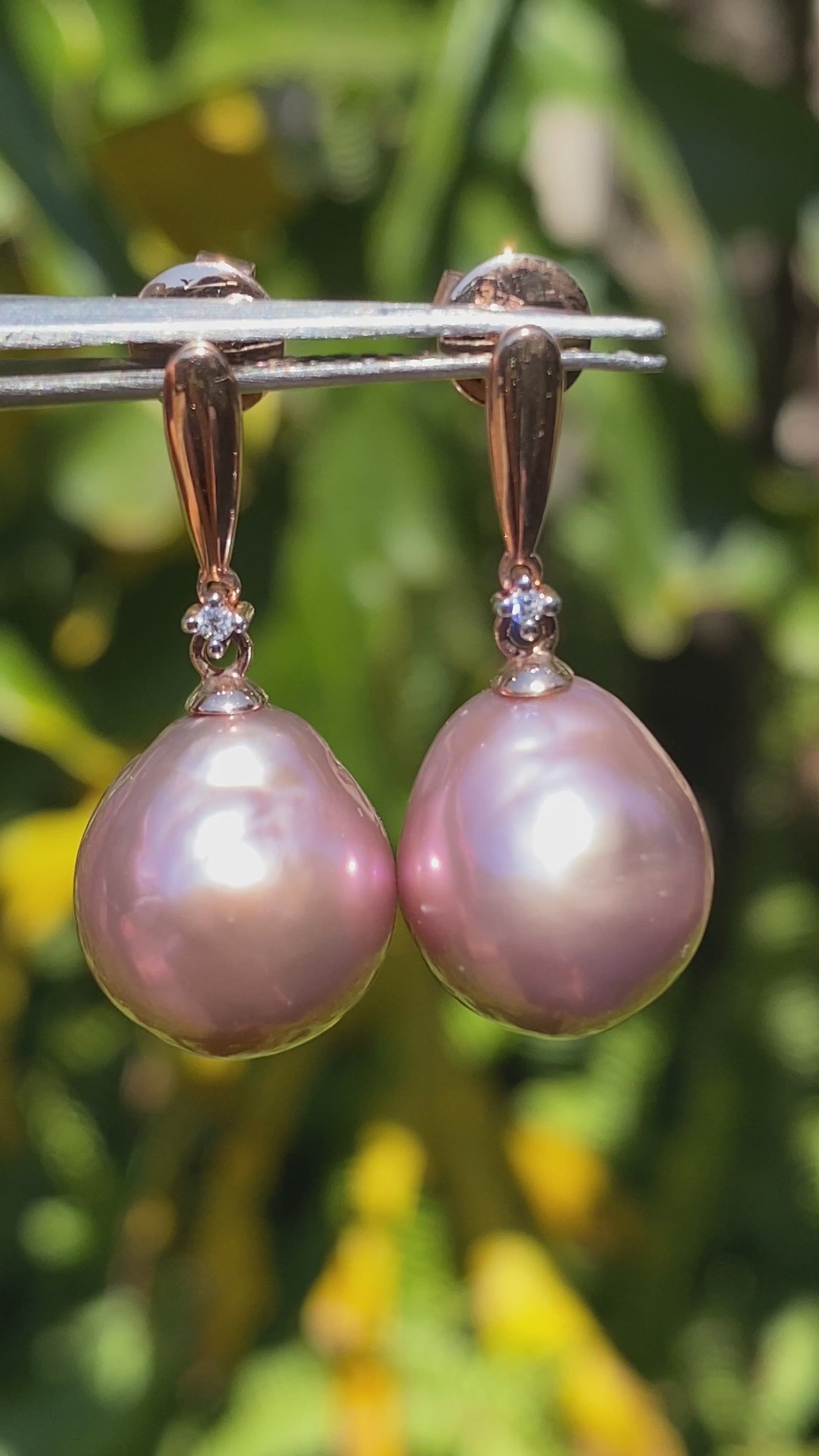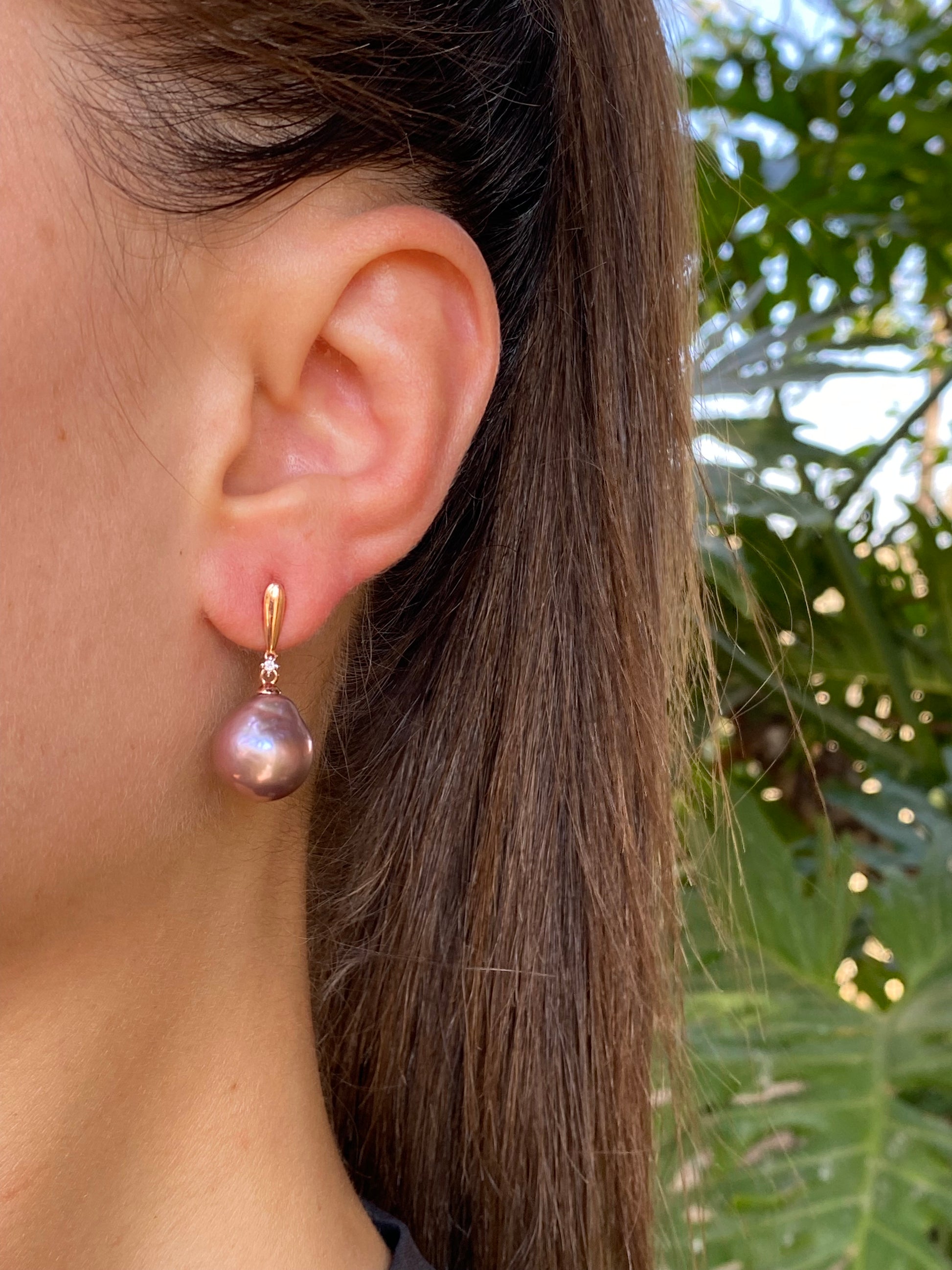 Light plum coloured cultured freshwater pearls dangle with a delicious glow. Suspended from brightly polished 9K rose gold settings, each pearl has a brightly sparkling diamond set above in a white gold background that shows off their ice-white colour beautifully. Made by Jack Friedman.