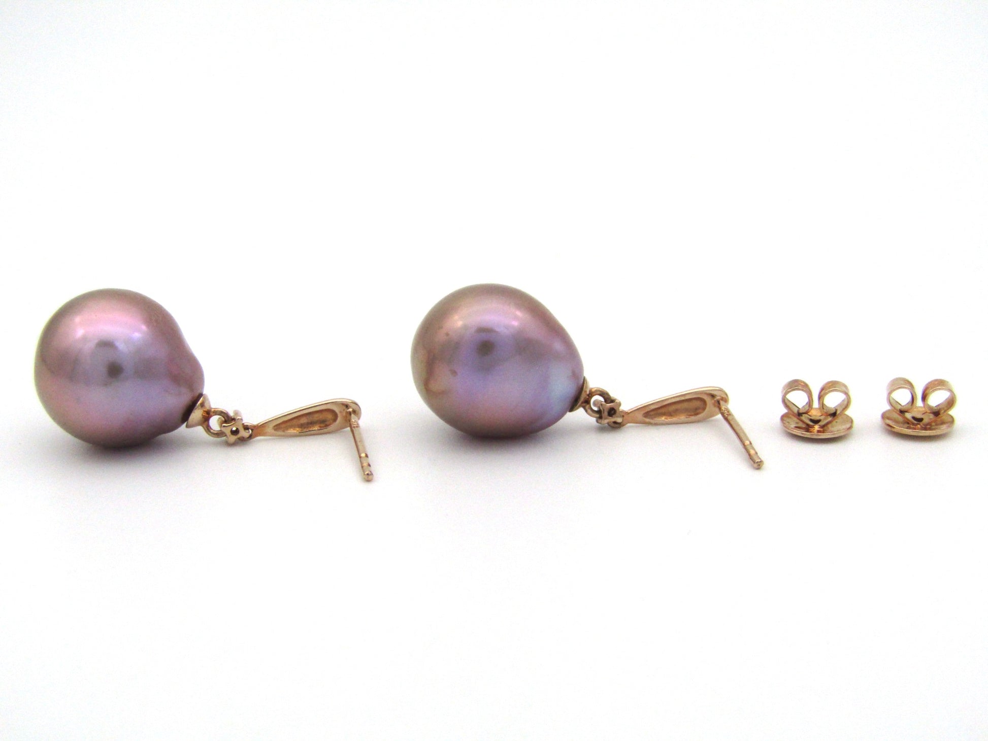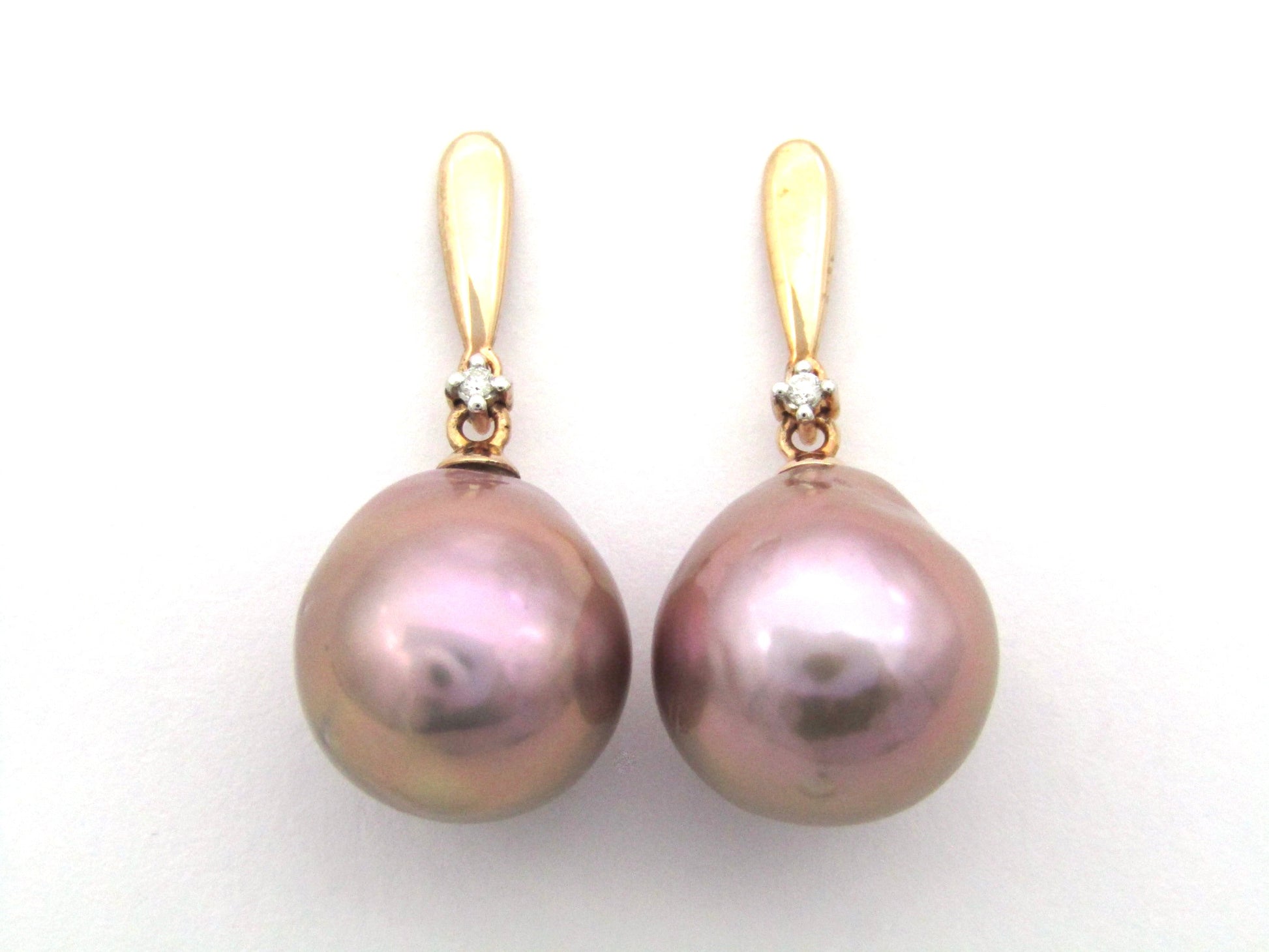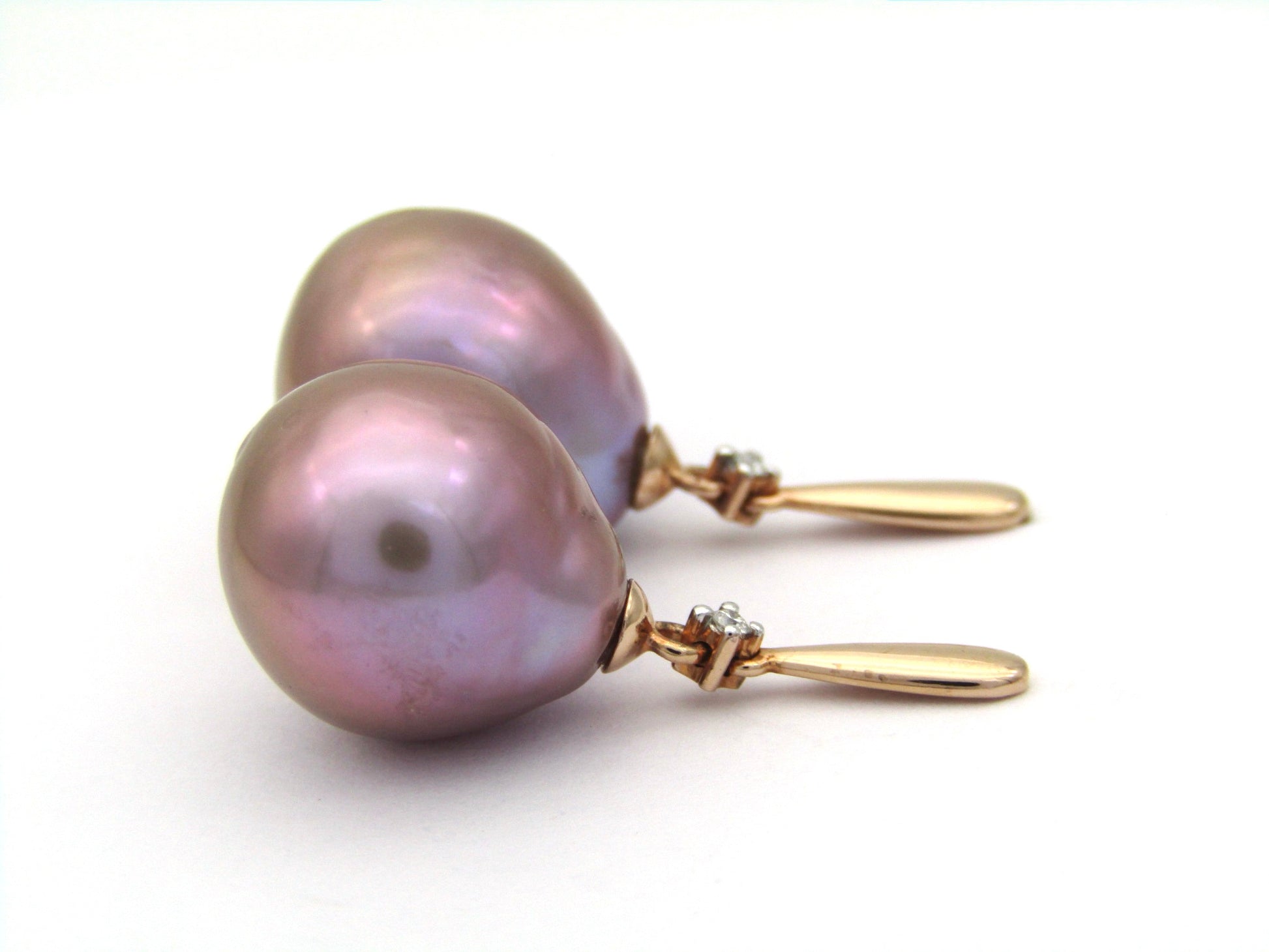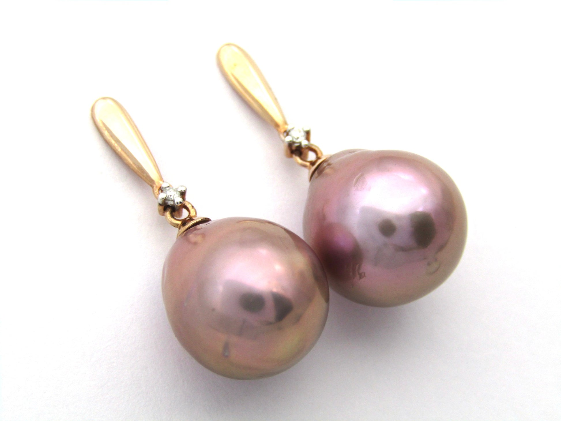 Light plum coloured cultured freshwater pearls dangle with a delicious glow. Suspended from brightly polished 9K rose gold settings, each pearl has a brightly sparkling diamond set above in a white gold background that shows off their ice-white colour beautifully. Made by Jack Friedman.