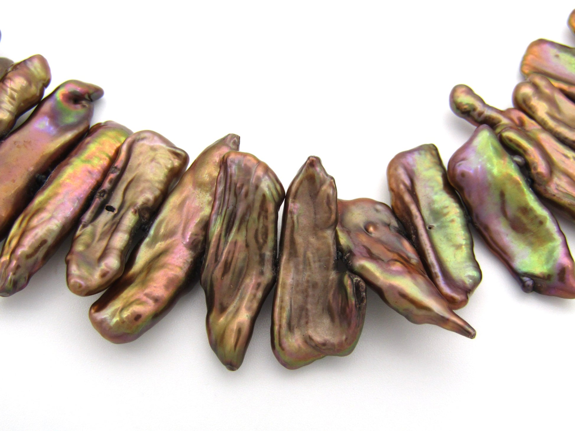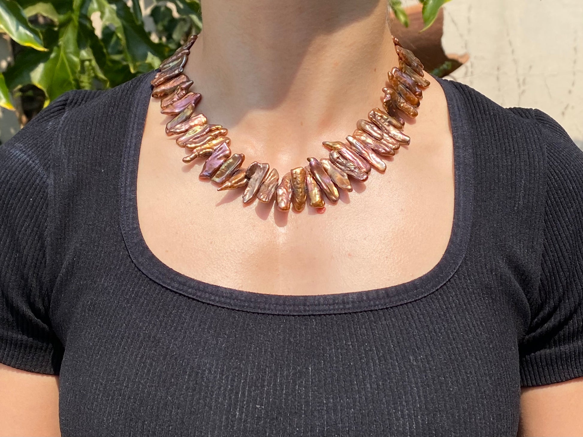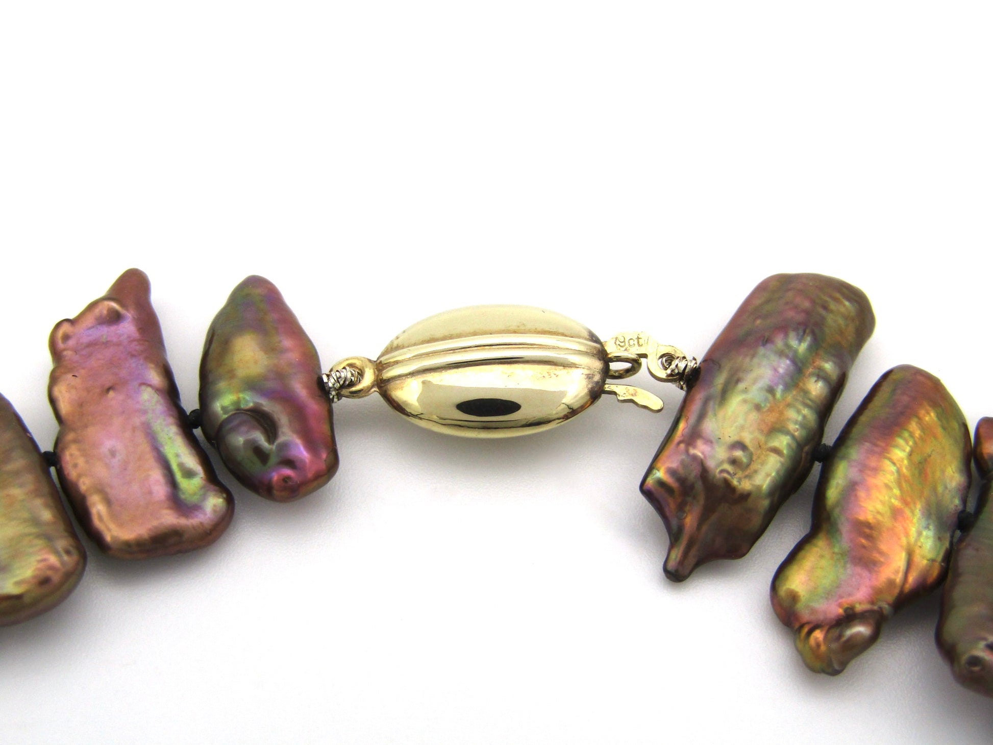 Stand out with these beautiful irregularly shaped freshwater pearls the colour of fine bronze. The necklace fastens at the back of your neck with a bright and polished bean-shaped 9K yellow gold clasp. Made by Jack Friedman.