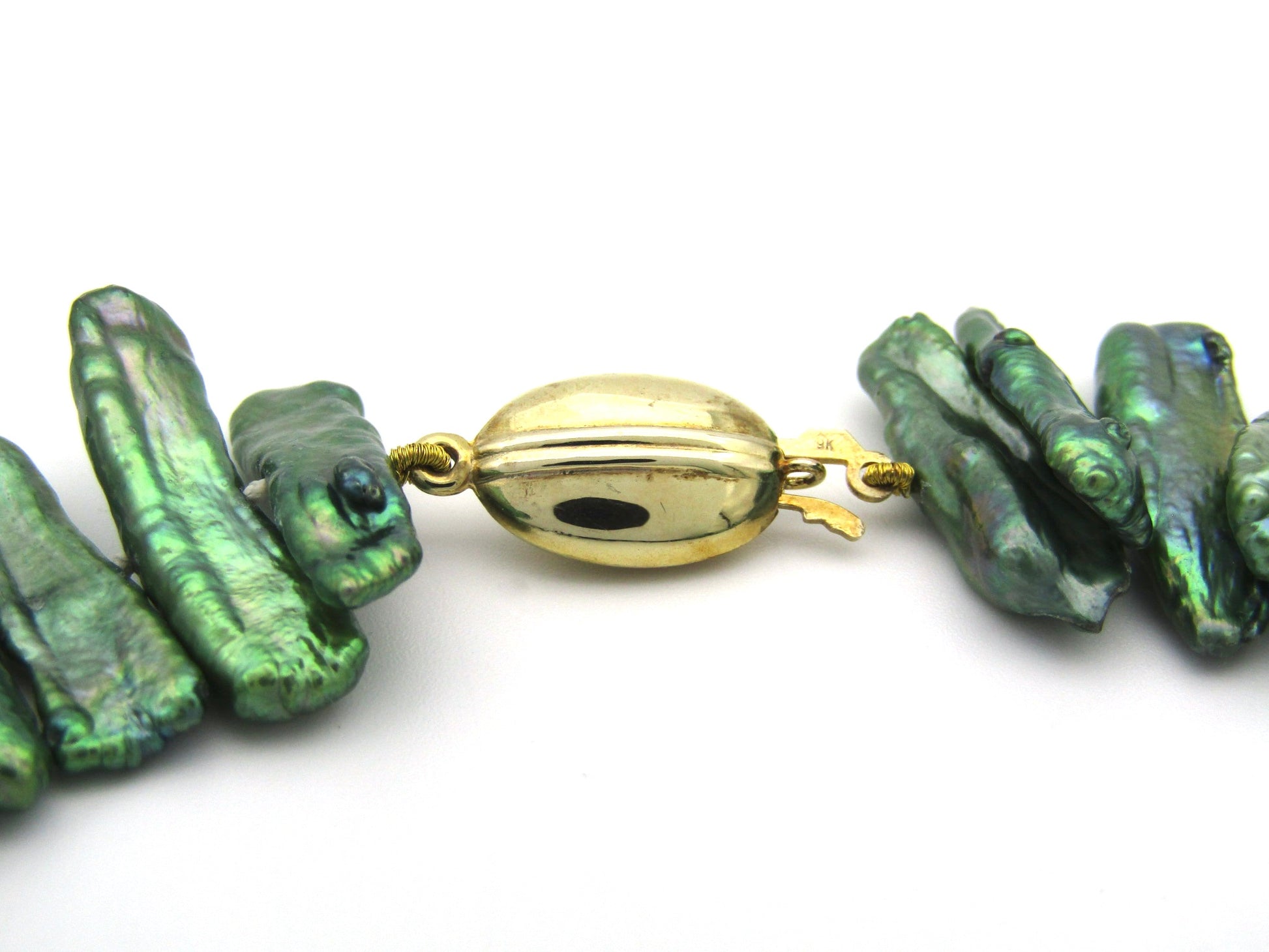 Pearls that glisten and gleam with colours like the magnificent peacock adorn your neckline. The necklace fastens at the back of your neck with a bright and polished bean-shaped 9K yellow gold clasp. Made by Jack Friedman.