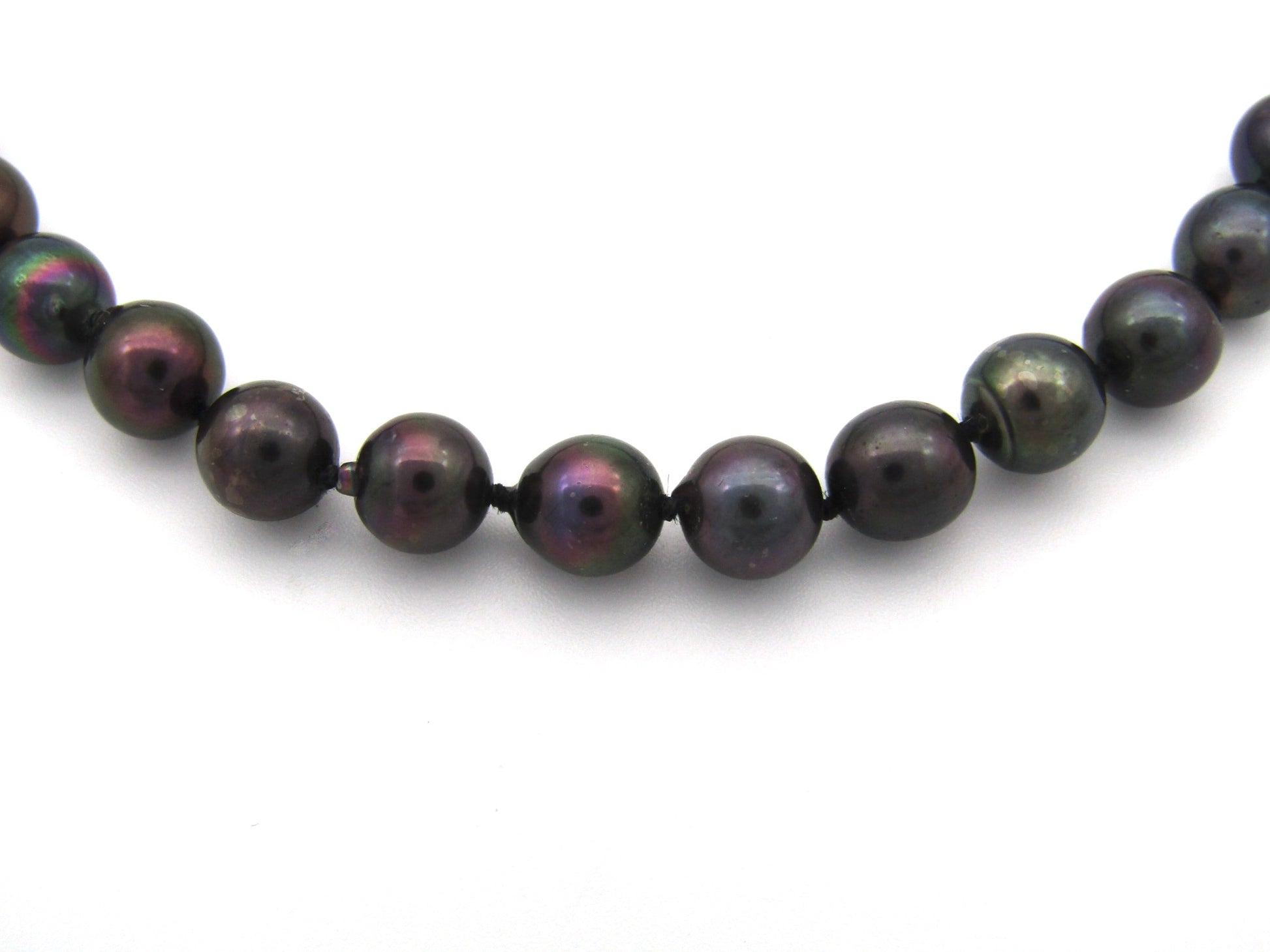 Delicious aubergine- and pistachio-coloured pearls encircle your neck in this simple, yet elegant pearl necklace. The pearls are fastened at the back with a 9K yellow and white gold matte clasp. Made by Jack Friedman.