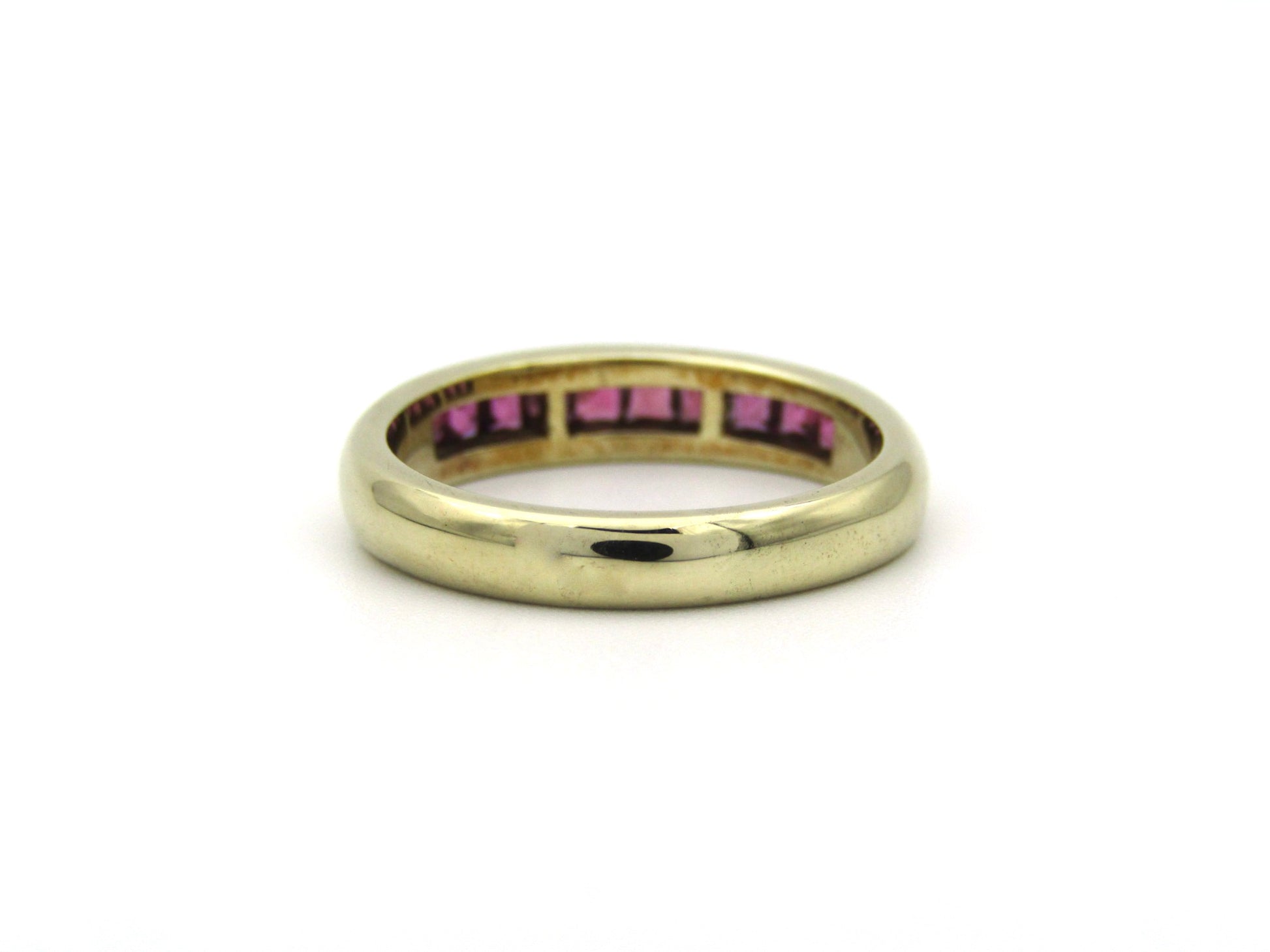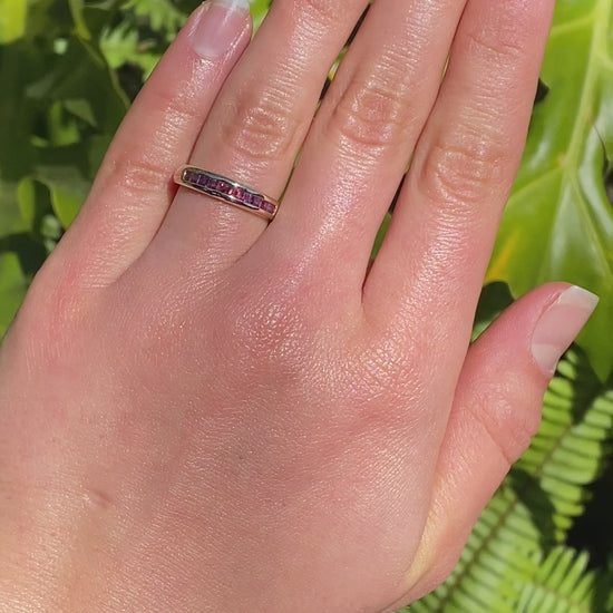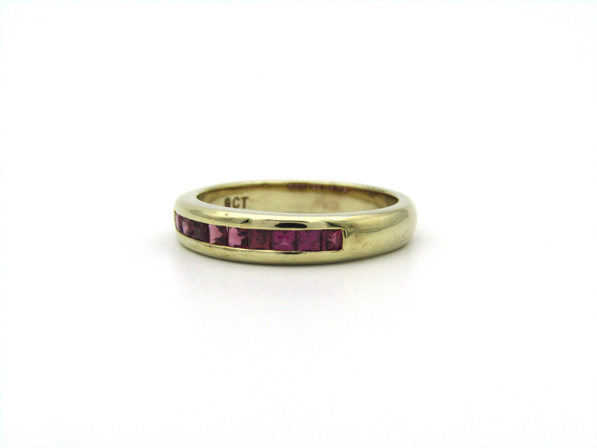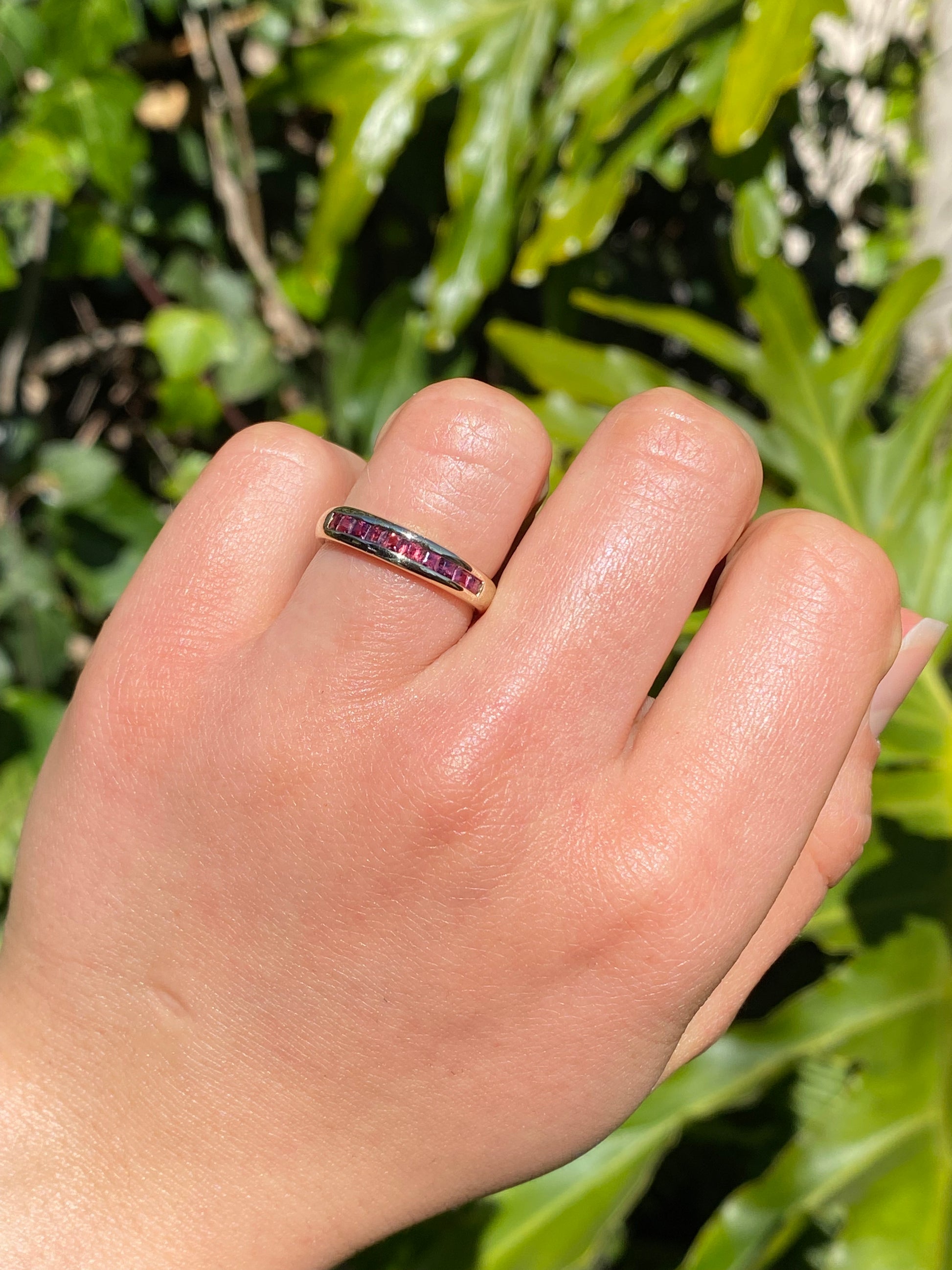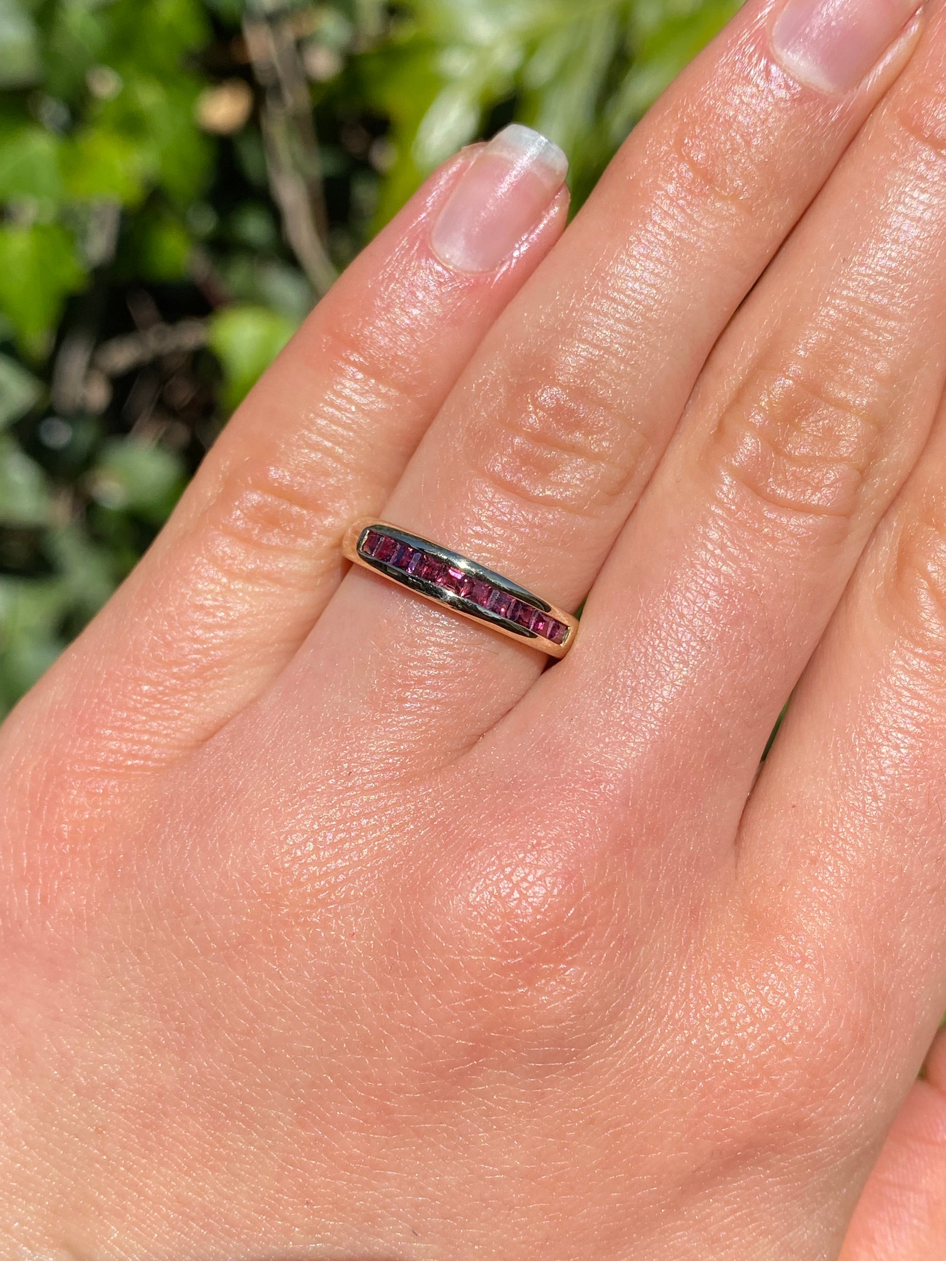 Understated and elegant, 10 square rhodolite garnets with colours like ripe raspberries sit in a neat row in channel settings, enveloped in gleaming 9K yellow gold.