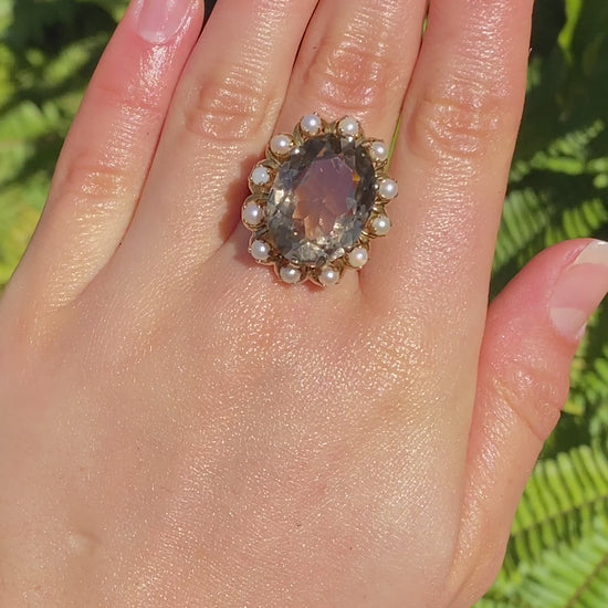 9K gold smoky quartz and pearl ring by Zeeta, circa 1950's.