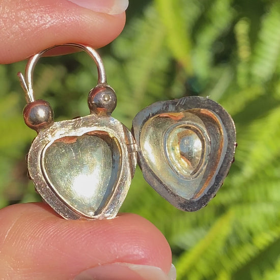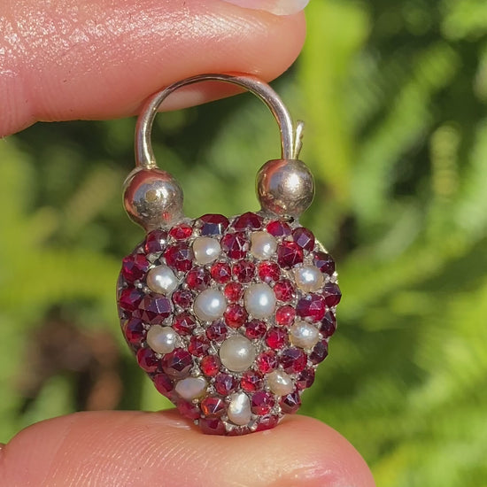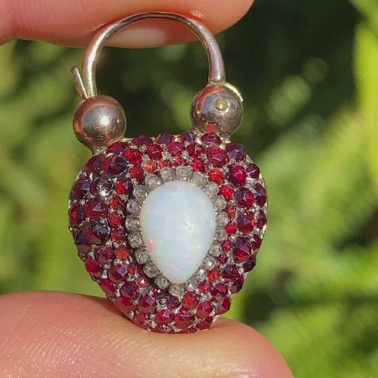 9K gold Victorian opal, garnet, seed pearl, and diamond locket and padlock clasp, circa 1850's.