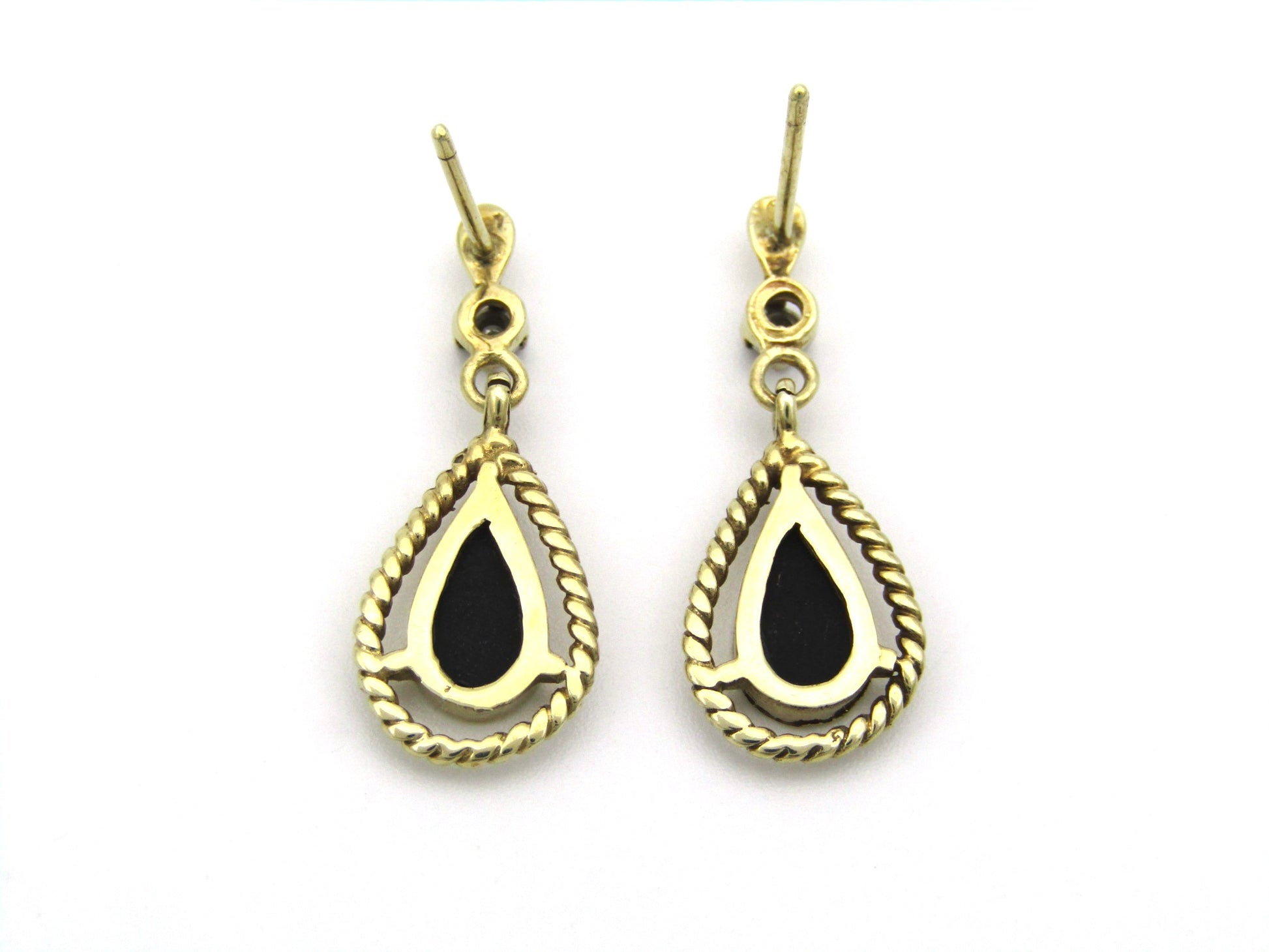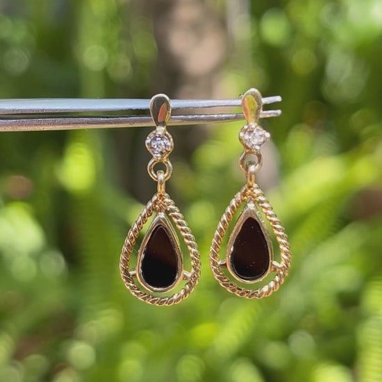 Sophisticated and timeless, these vintage dangle earrings from the 1990s capture the perfect balance of drama and elegance. Crafted in 9K yellow gold, each earring features a striking pear-shaped onyx, framed by a twisted gold border that adds depth and texture. Above, a sparkling diamond accent catches the light with every movement, bringing a touch of brilliance to the bold black gemstone.