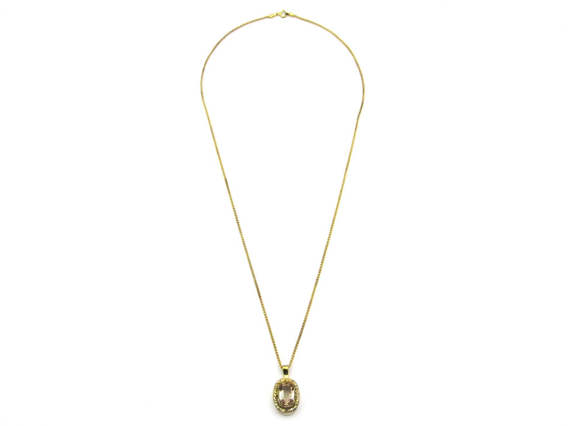 The November birthstone is beautifully displayed in this 1950's pendant that was once most probably in the clasp of a string of pearls and has since been converted to this gorgeous pendant. The topaz is a dreamy pale orange giving off a rosy hue, beautifully complimented by the rich yellow gold setting. With a delicate but strong 9K gold vintage Italian chain, this piece is sure to cause a statement.