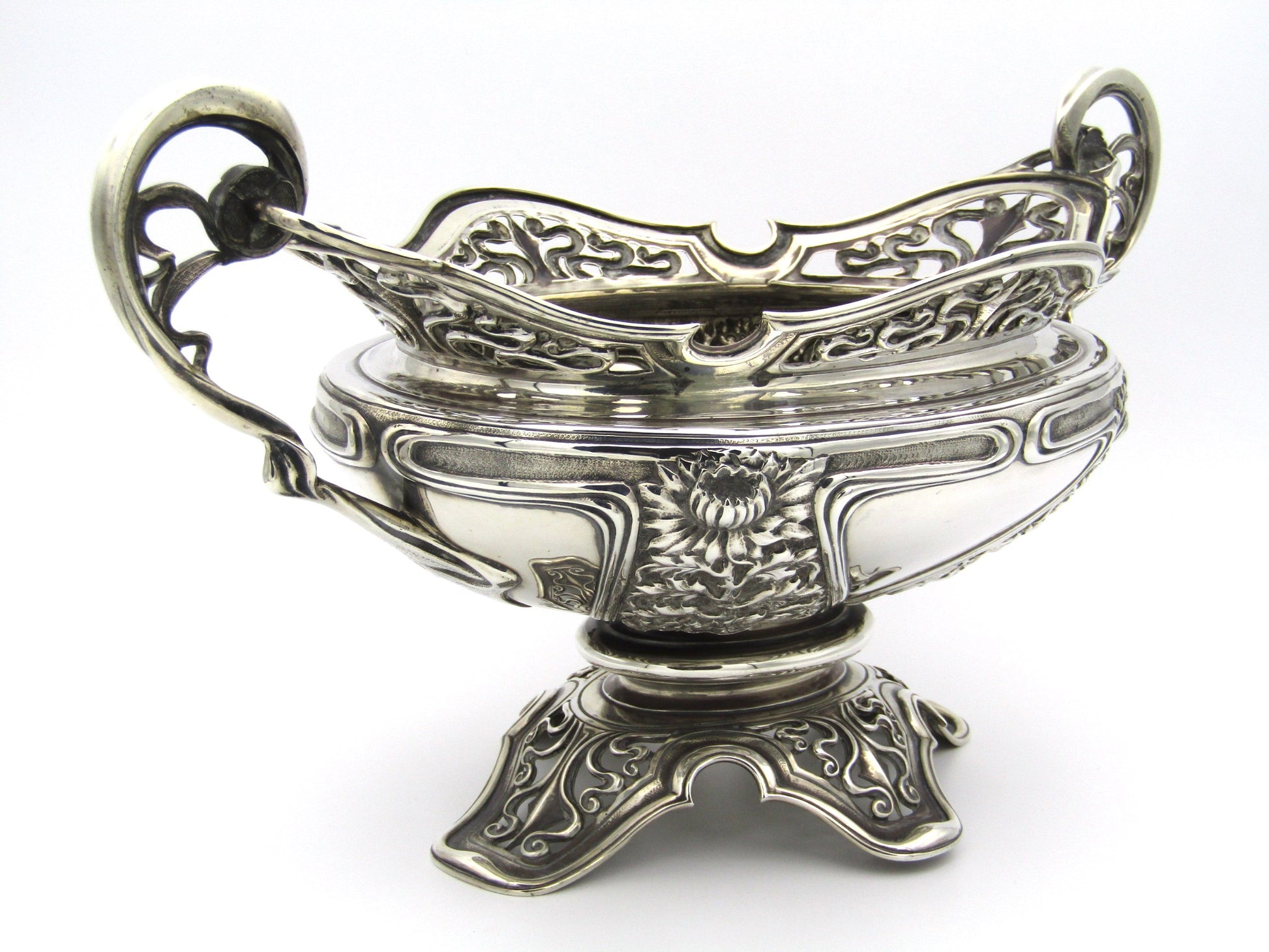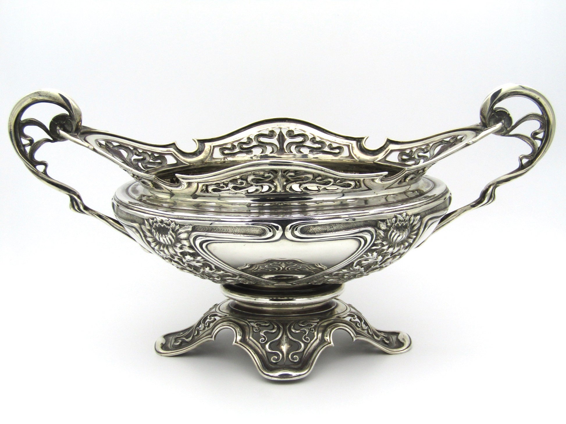 Magnificent is the only word to describe this majestic sterling silver centrepiece made during the coveted Art Nouveau era by renowned silversmiths Walker & Hall during the peak of the era in Sheffield, 1907. With long, flowing, elegant lines, floral designs, and floral and foliate handles, this splendid centrepiece is sure to be the topic of conversation at the dinner table.