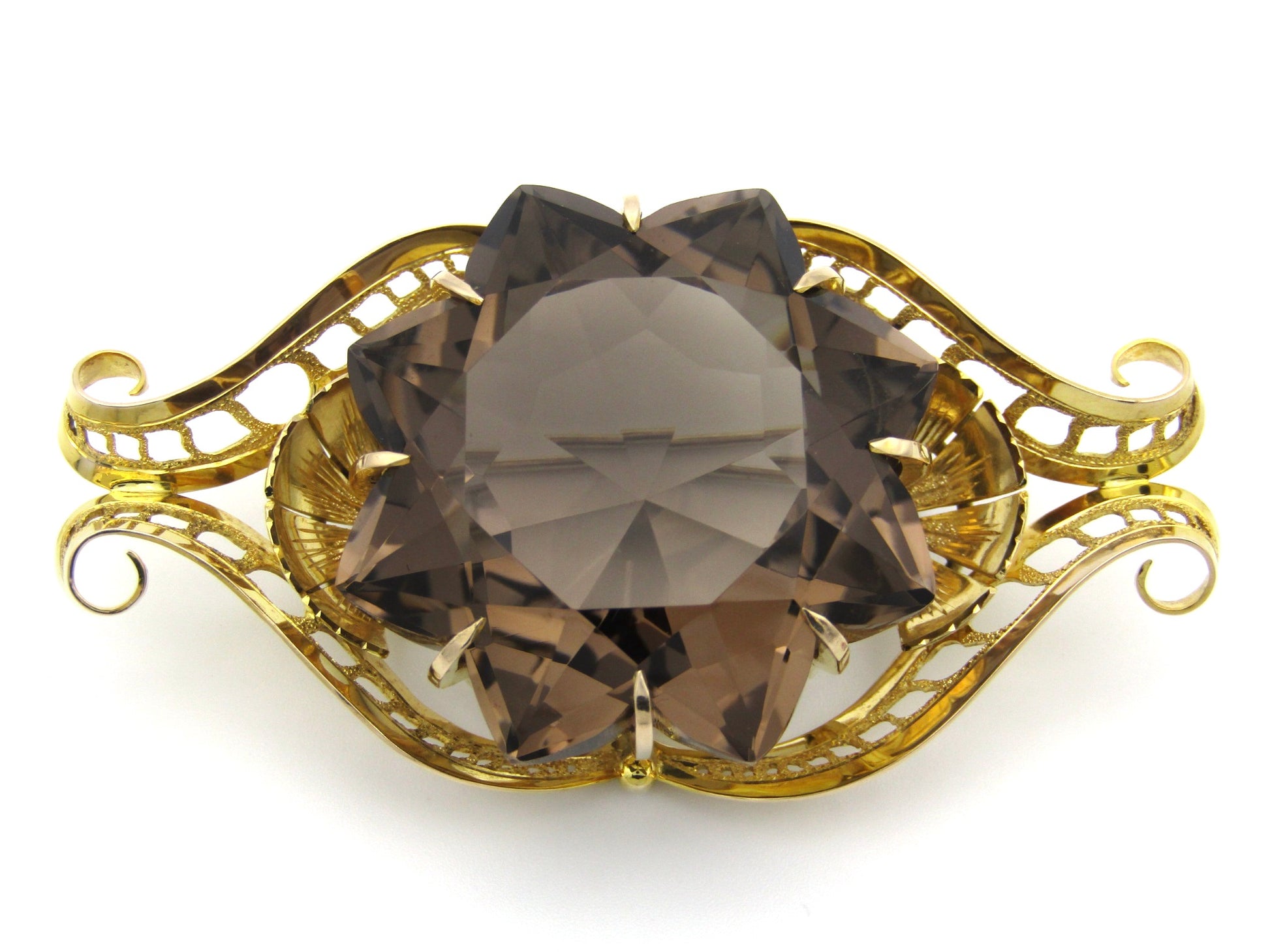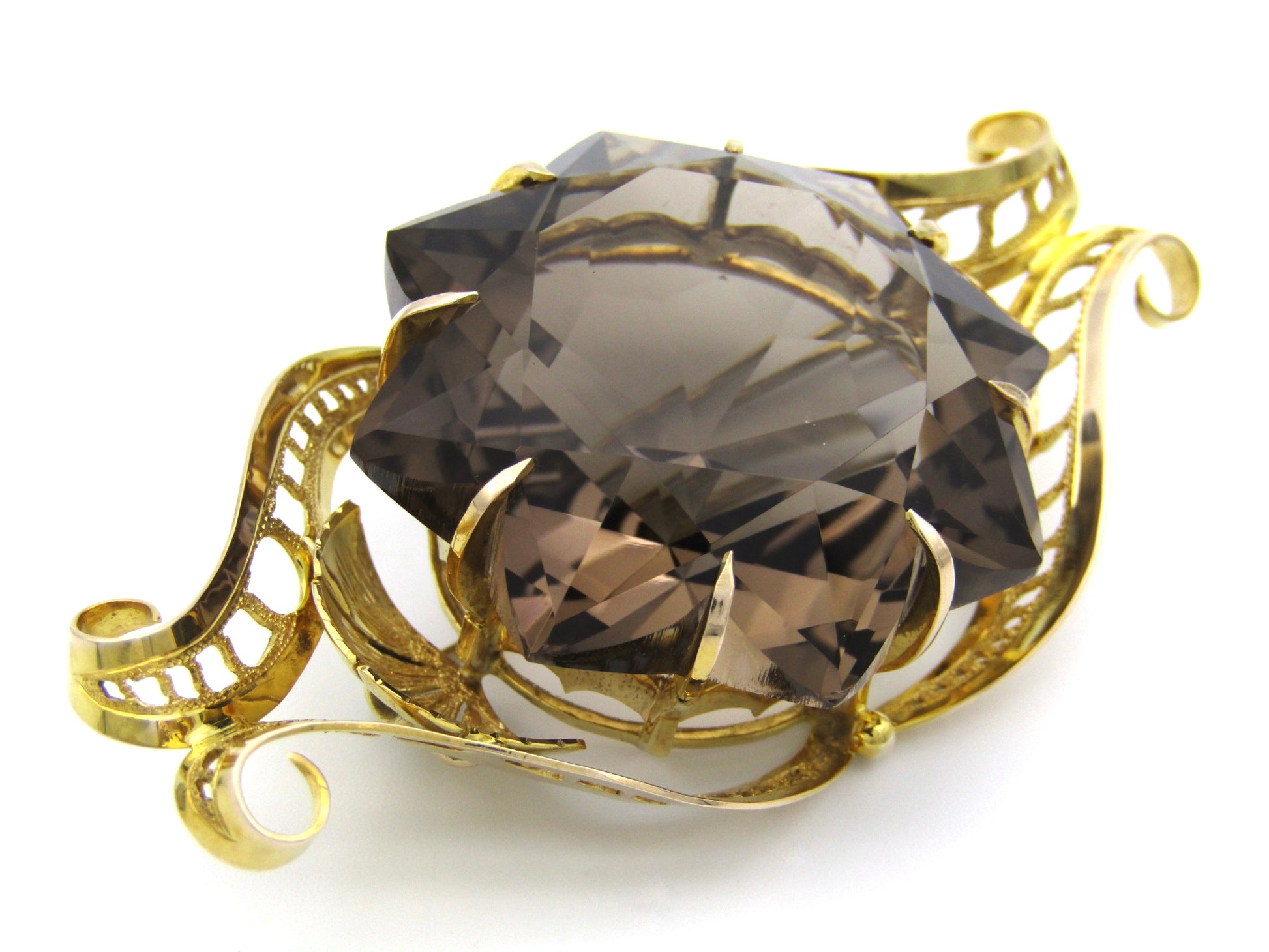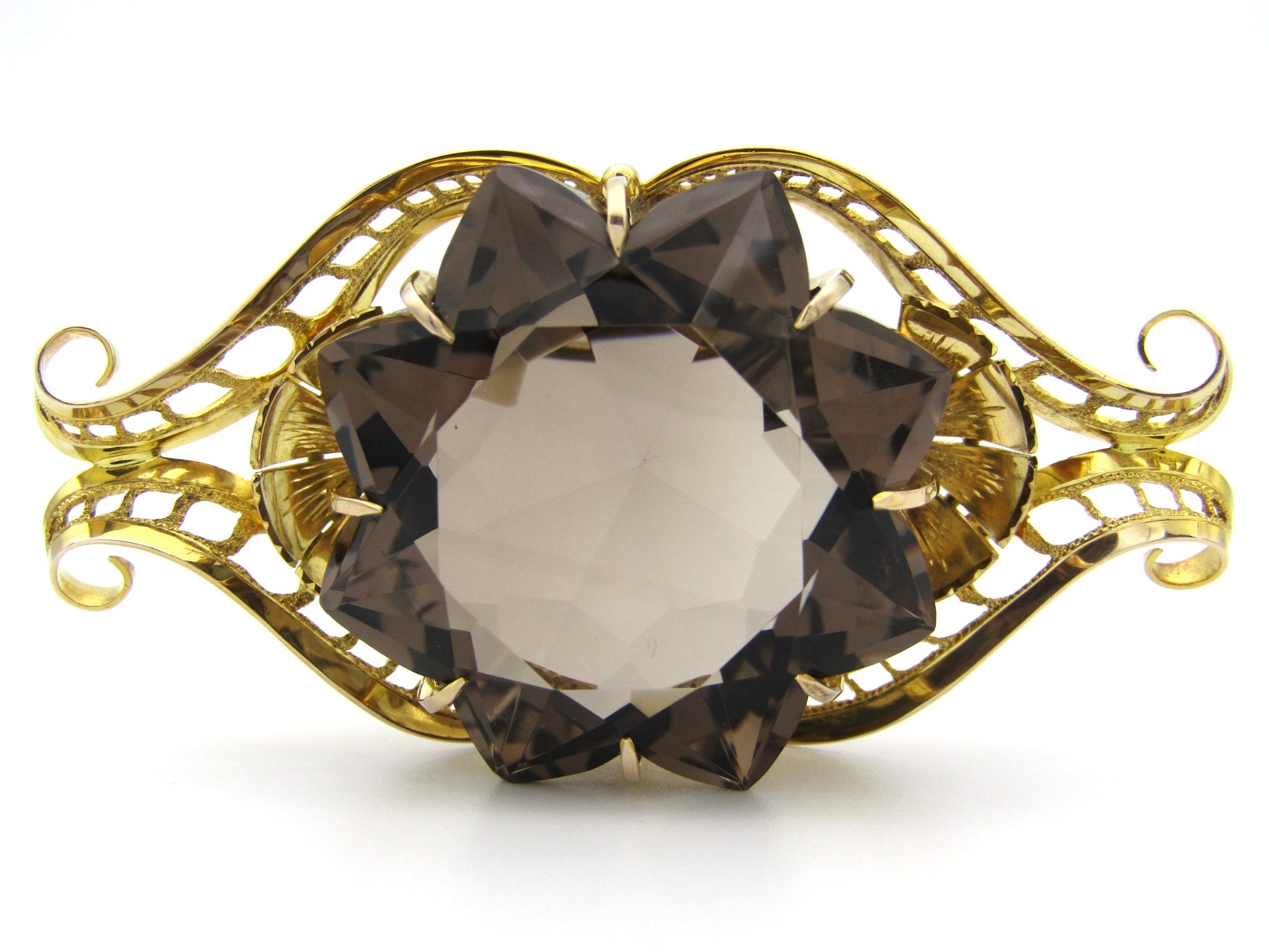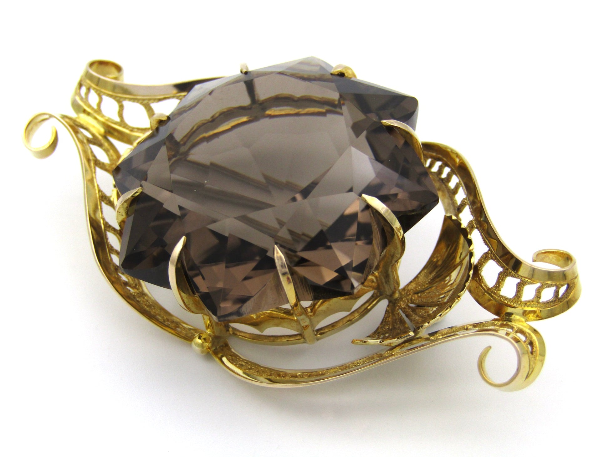 Become larger than life with this brooch on your lapel! Weighing a whopping 39,7 grams, and measuring 47,86mm in length - this one is impossible to miss! Made in the 1950's, this bold piece is set with a massive 130.66 carat (WOW!) star-cut smoky quartz, held in place securely by eight strong claws and has a beautifully ornate 9K yellow and rose gold handcrafted brooch design. A bodacious beauty indeed!