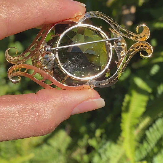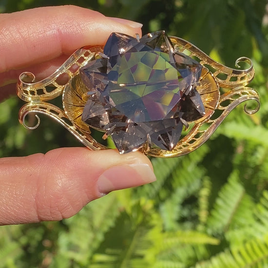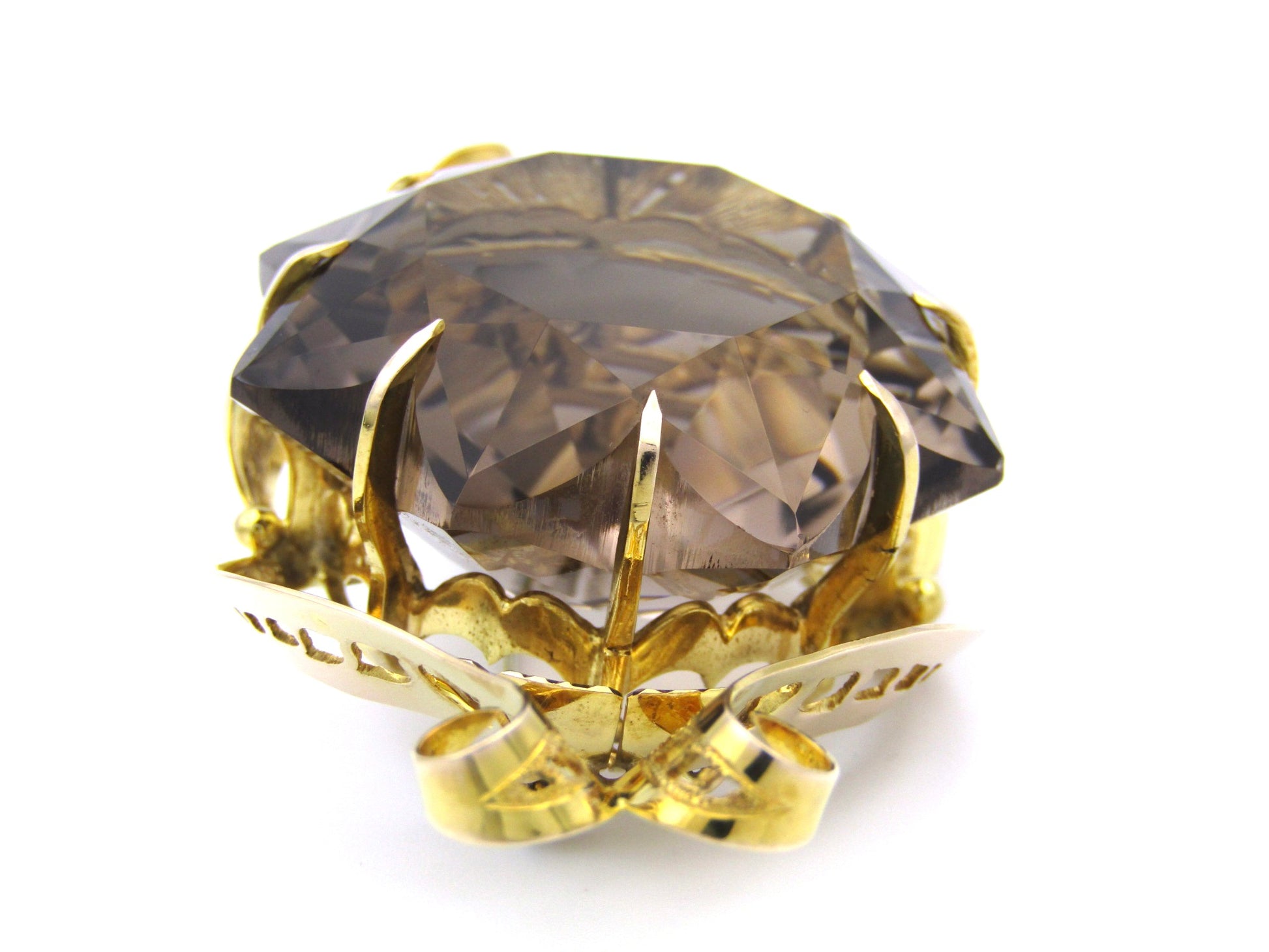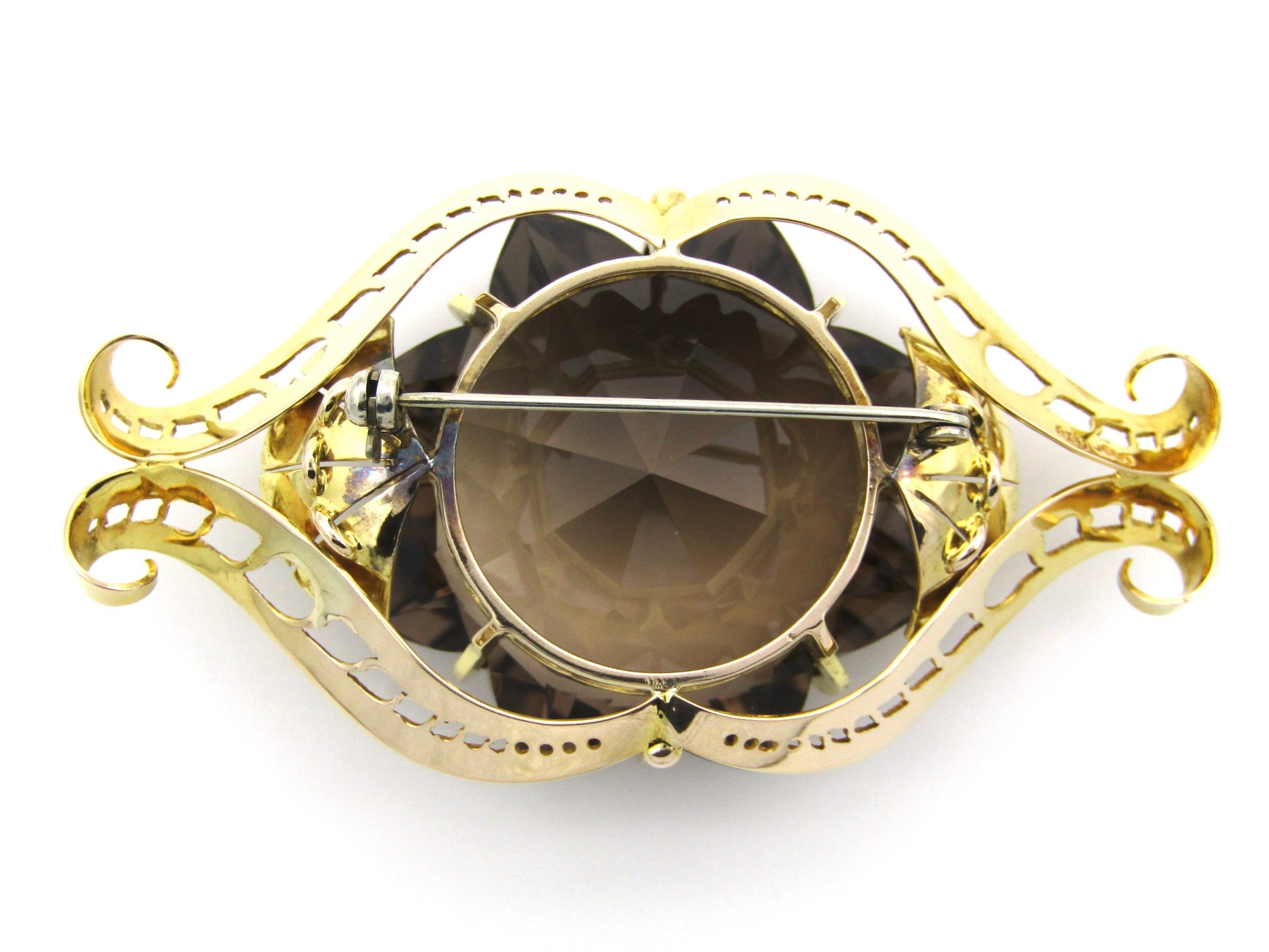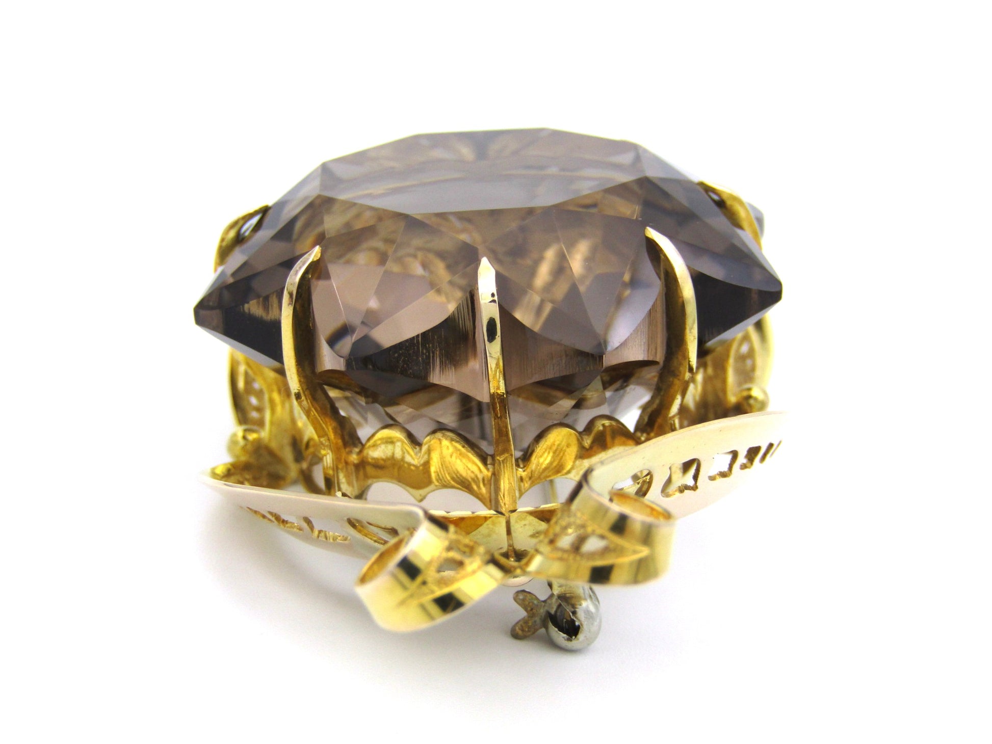 Become larger than life with this brooch on your lapel! Weighing a whopping 39,7 grams, and measuring 47,86mm in length - this one is impossible to miss! Made in the 1950's, this bold piece is set with a massive 130.66 carat (WOW!) star-cut smoky quartz, held in place securely by eight strong claws and has a beautifully ornate 9K yellow and rose gold handcrafted brooch design. A bodacious beauty indeed!