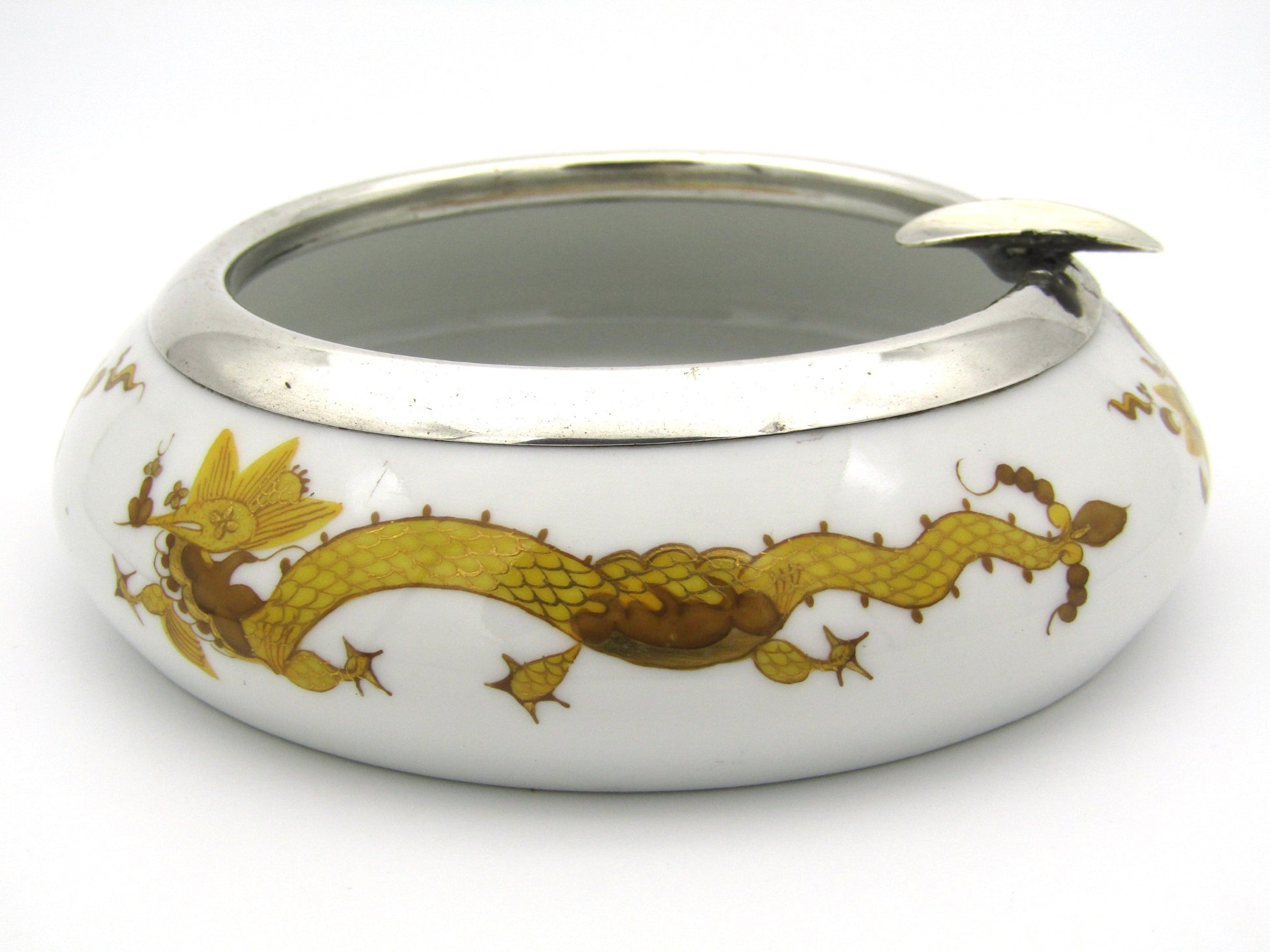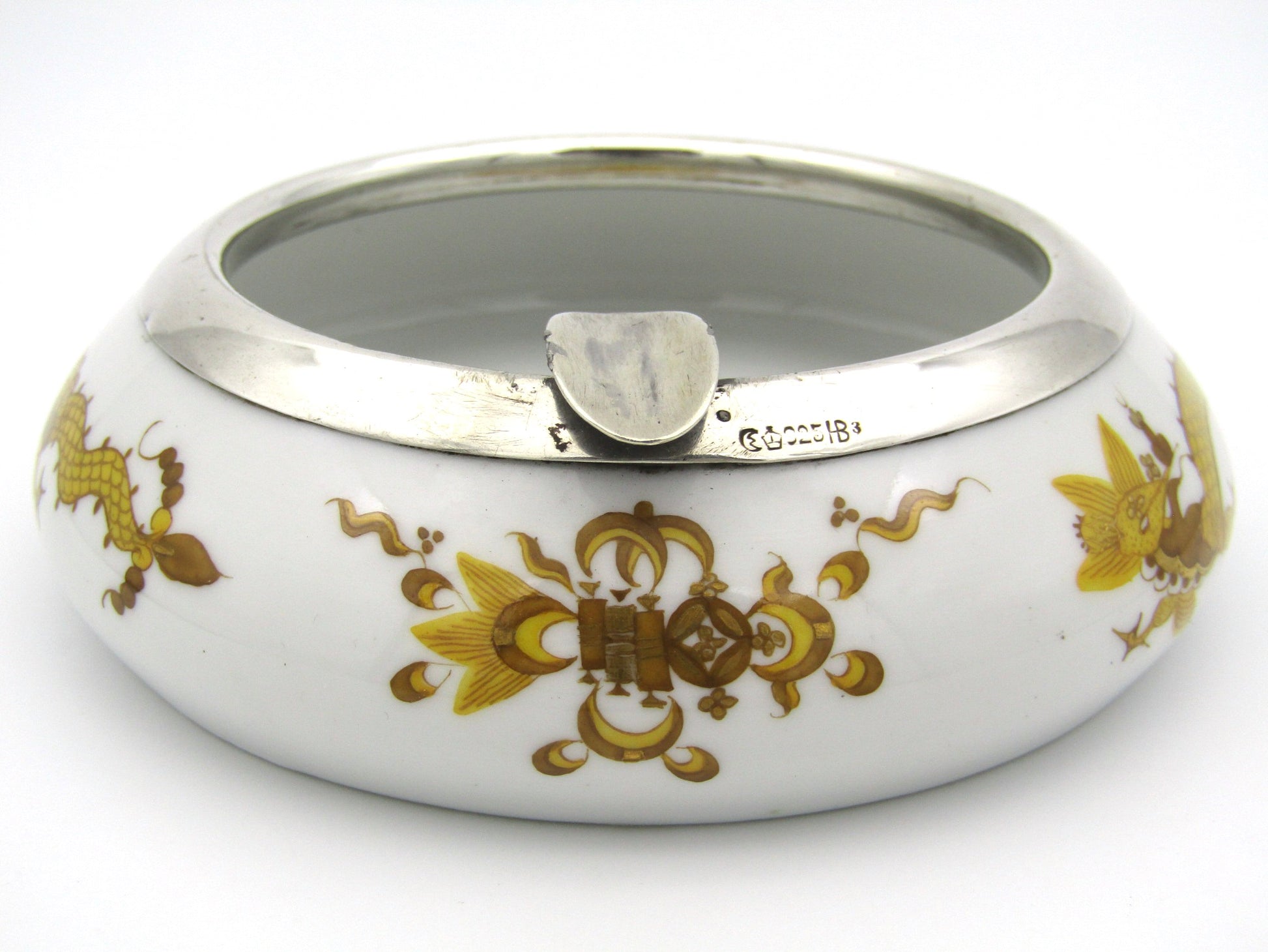 A gorgeously painted porcelain ashtray by Meissen, hand painted with the golden "Court Dragon", with a sterling silver rim and cigarette holder.